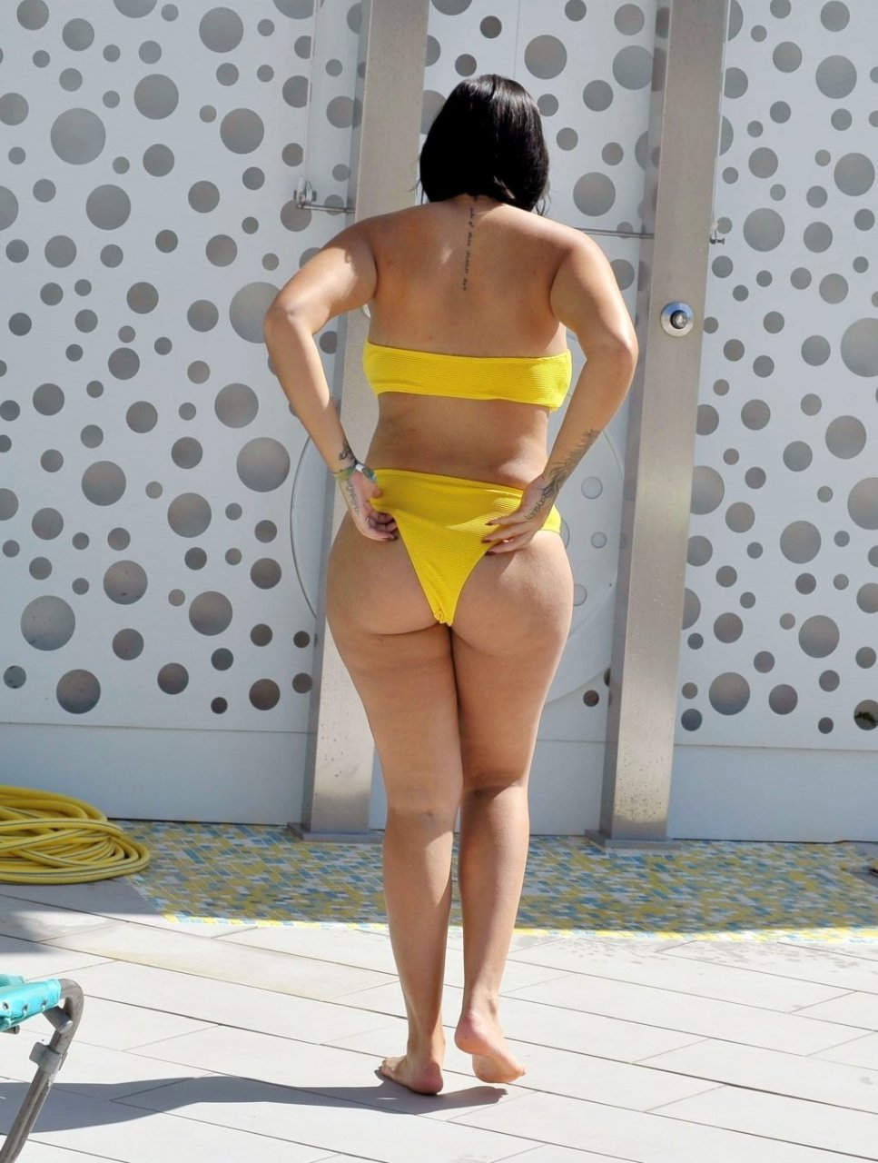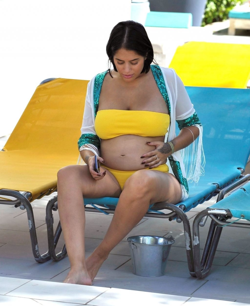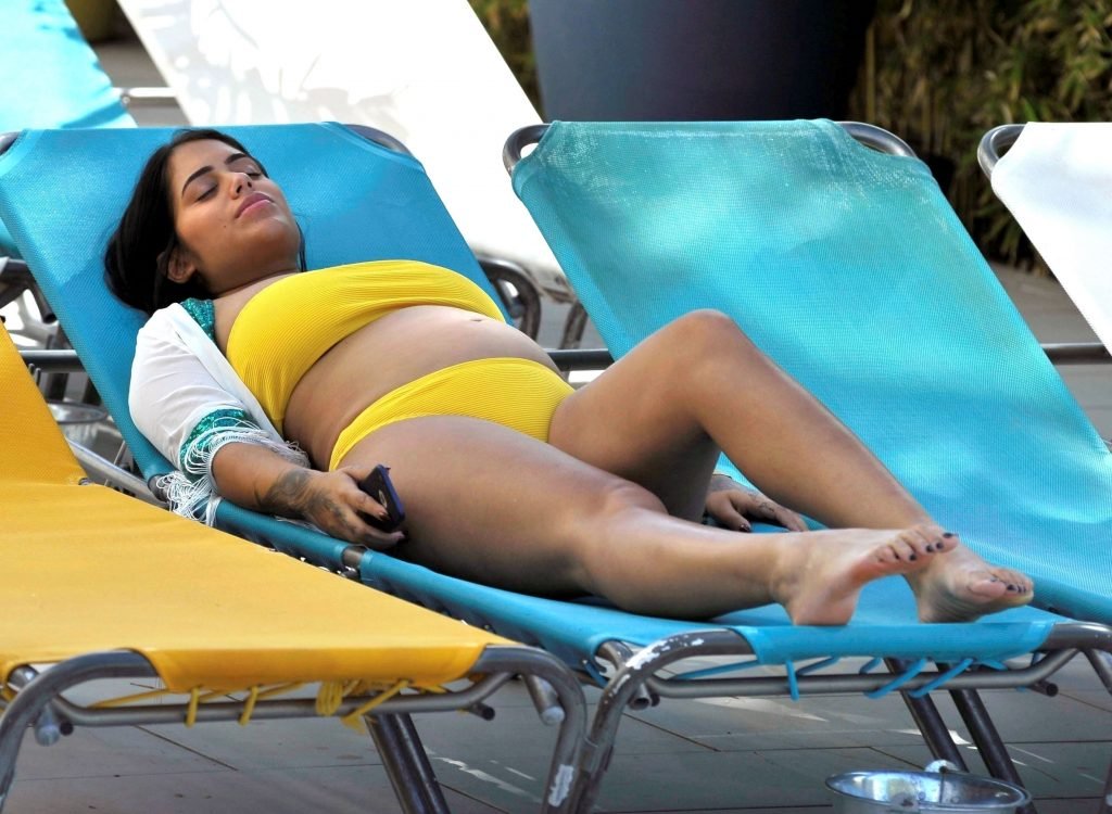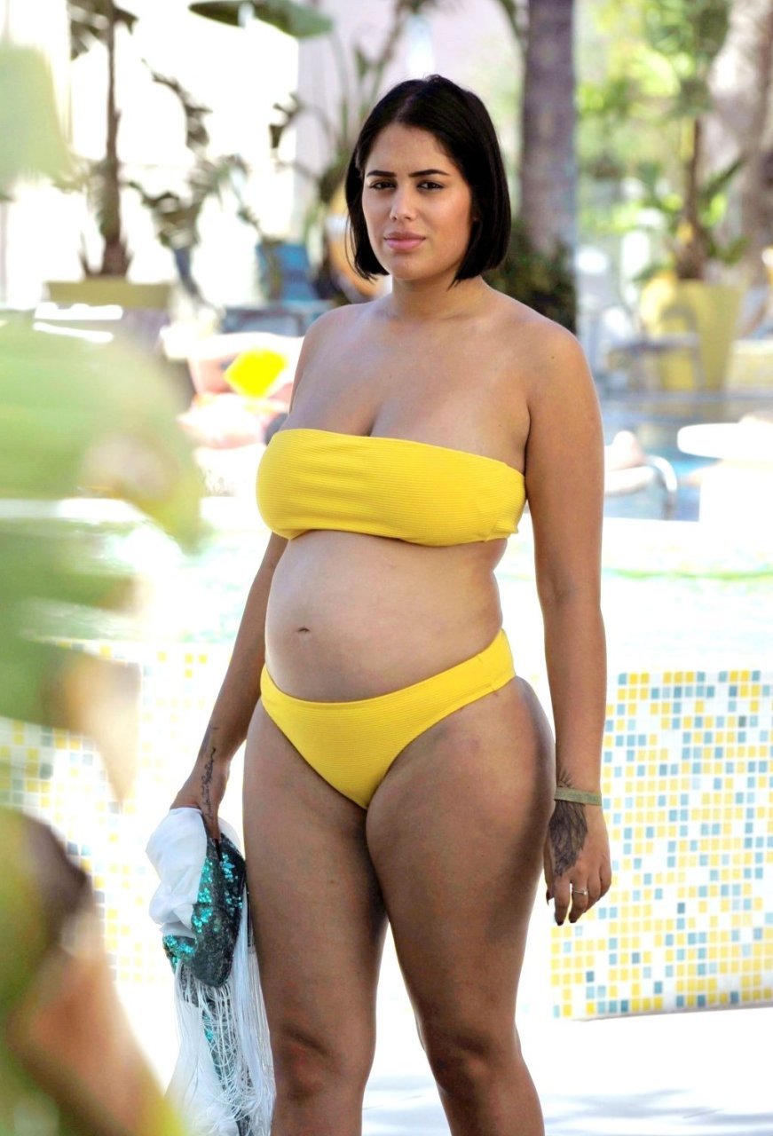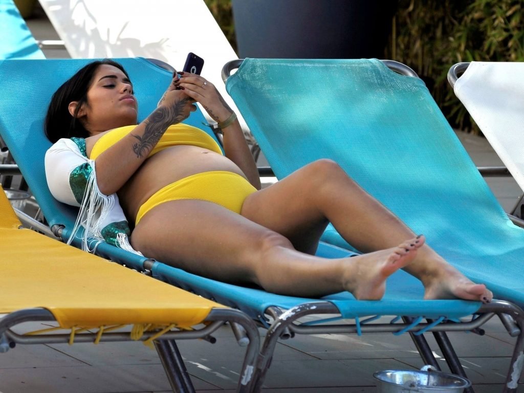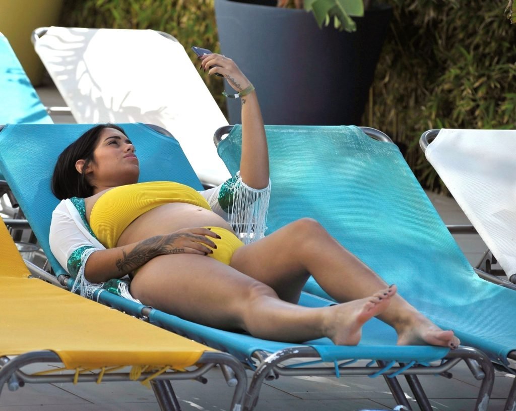 La estrella embarazada de Love Island, Malin Andersson, muestra su barriga de embarazada con un bikini amarillo brillante mientras disfruta de sus vacaciones al sol, pasando un día junto a la piscina en España, 22/10/2018.