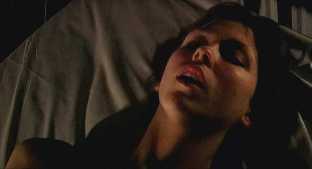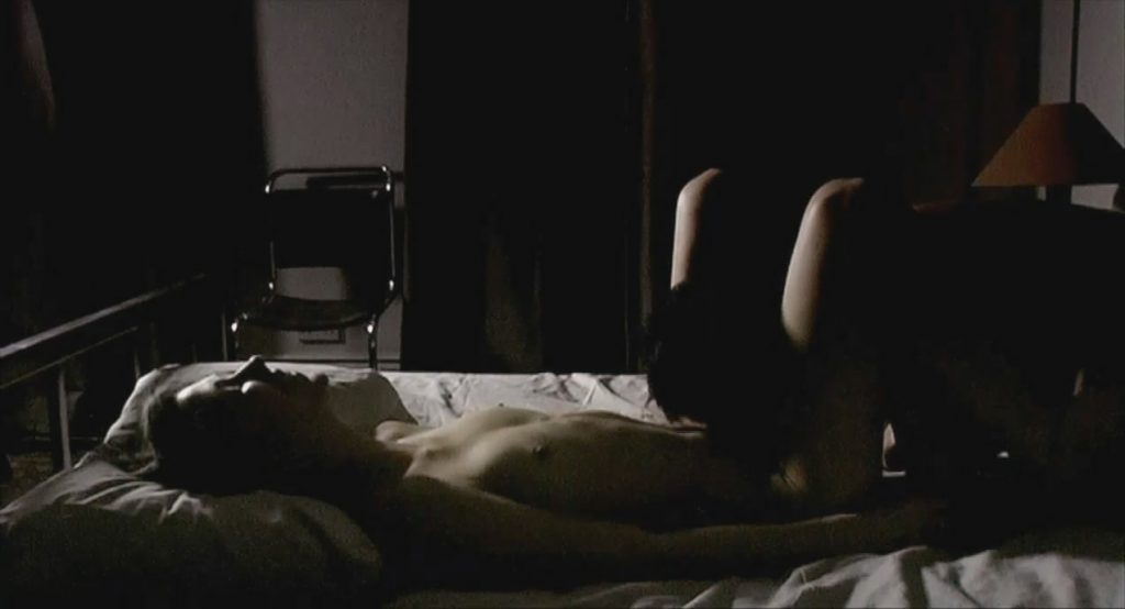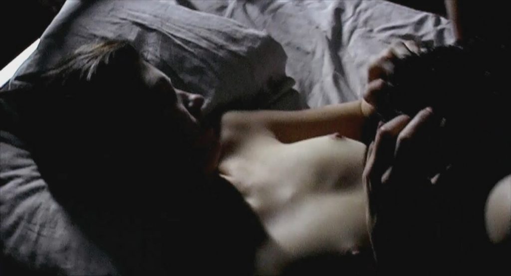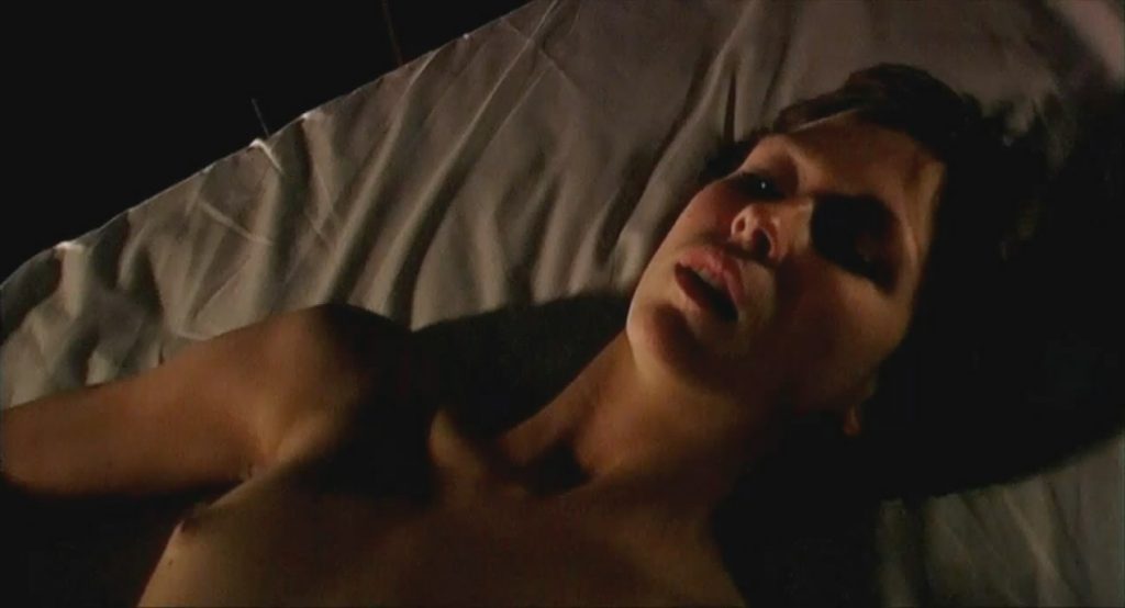 Margo is seen topless lying in bed, her legs up on a guy’s shoulders as he has sex with her.