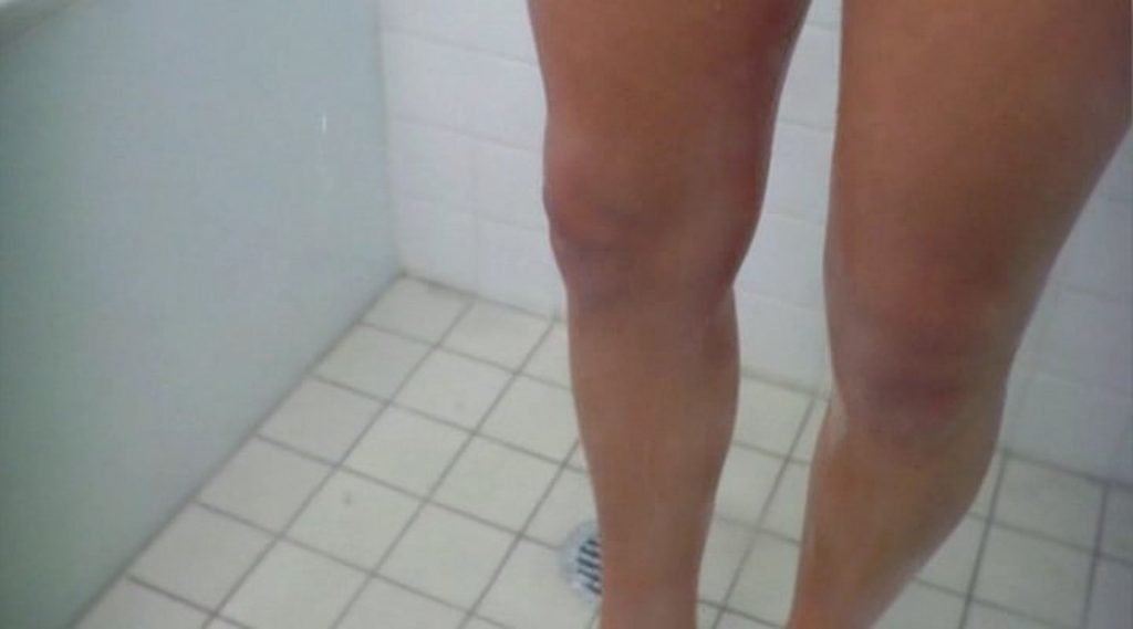 Mira la escena desnuda de la antigua, pero atractiva Margot Robbie de 20 años en “I.C.U.” (2009), donde está de pie en una ducha mientras se lava el cuerpo, dando a todos los fans una vista de su estómago y piernas y un vistazo muy leve de su bajo pecho antes de que note a un chico con máscara espiándola y grite.