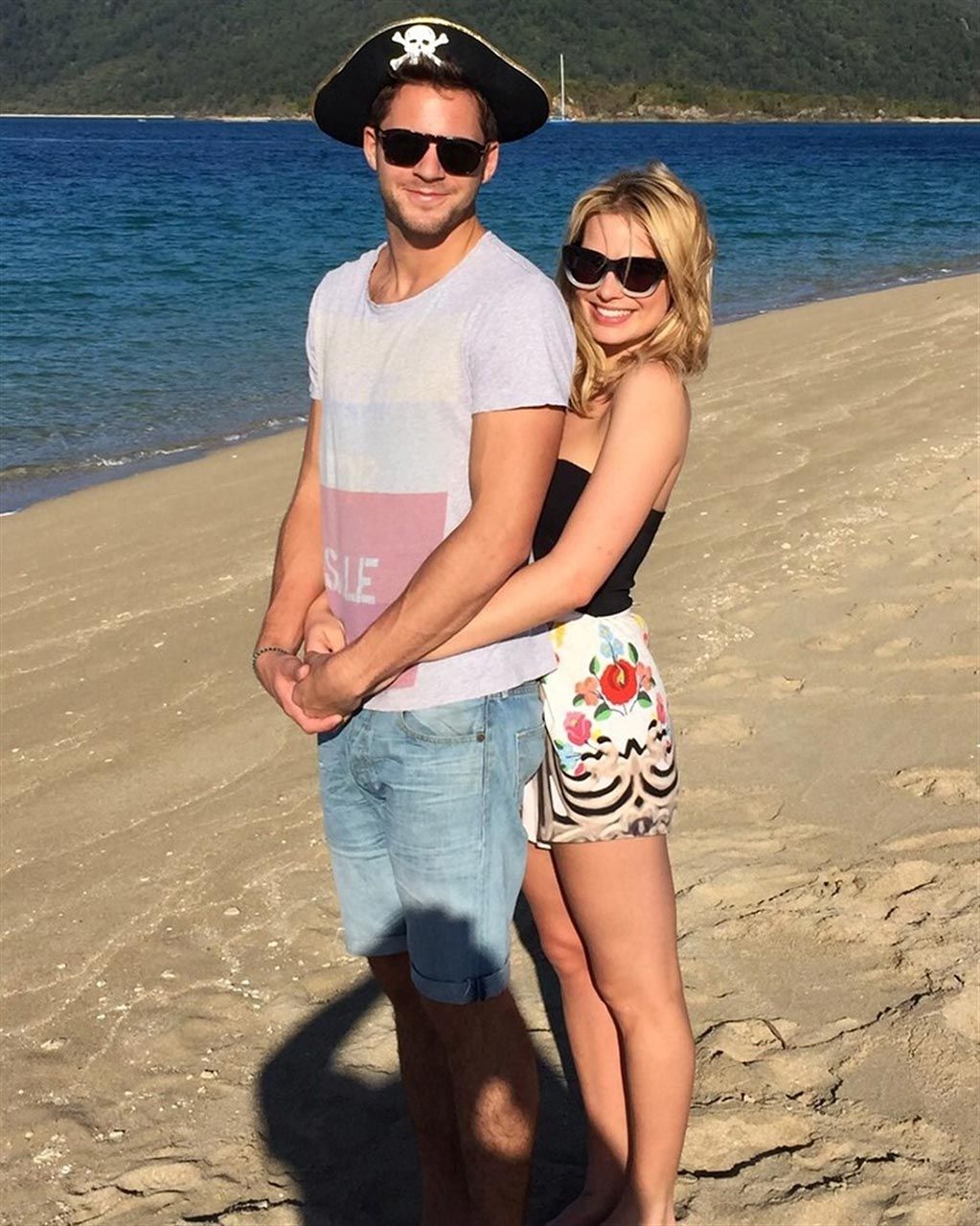 She is topless while sunbathing her boobs with her husband, Tom Ackerley, in Hawaii. She was giving us a great view of her lovely small tits and nipples! The couple then had a great time kissing and swimming; then she tried to surf, which went well! Margot Robbie showed a pussy cameltoe and ass in a white swimsuit while surfing!