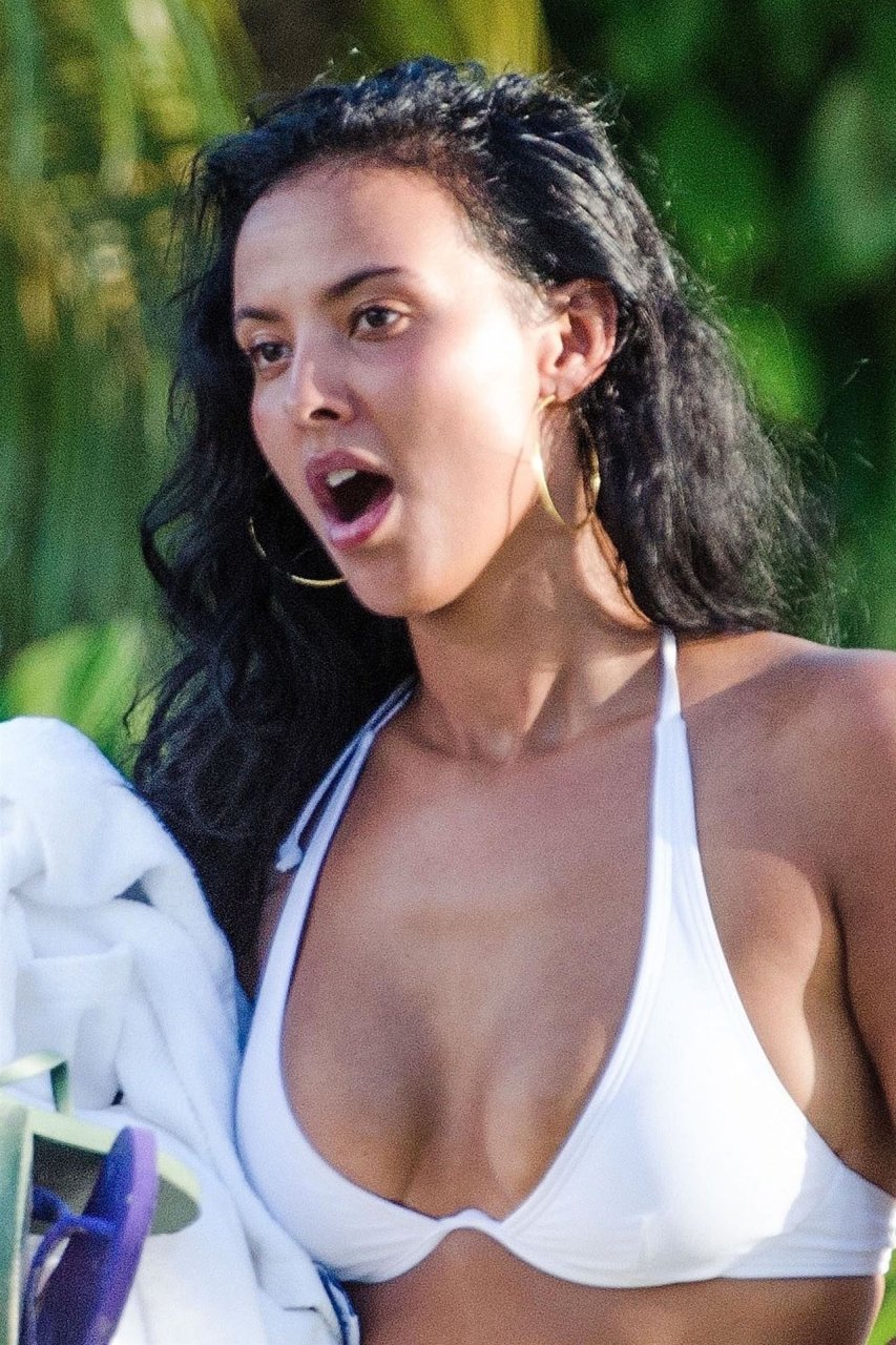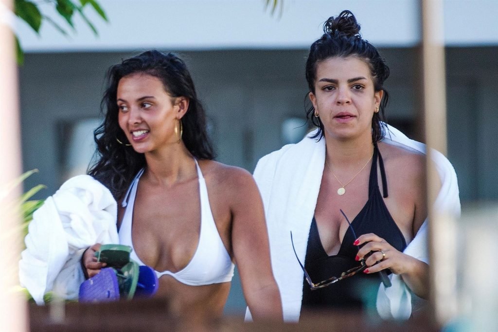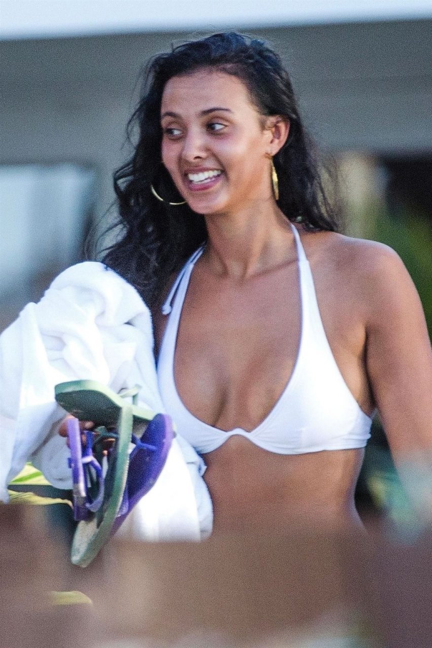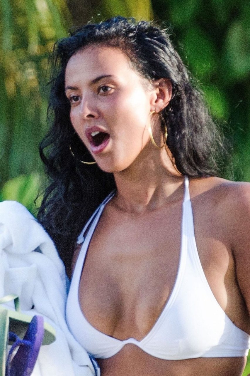 Presentadora británica Maya Jama fue vista disfrutando de un día en la playa con una amiga mientras estaba de vacaciones en Barbados, 12/06/2018. Maya mostró su cuerpo tonificado con un top de bikini blanco y pantalones rosas.