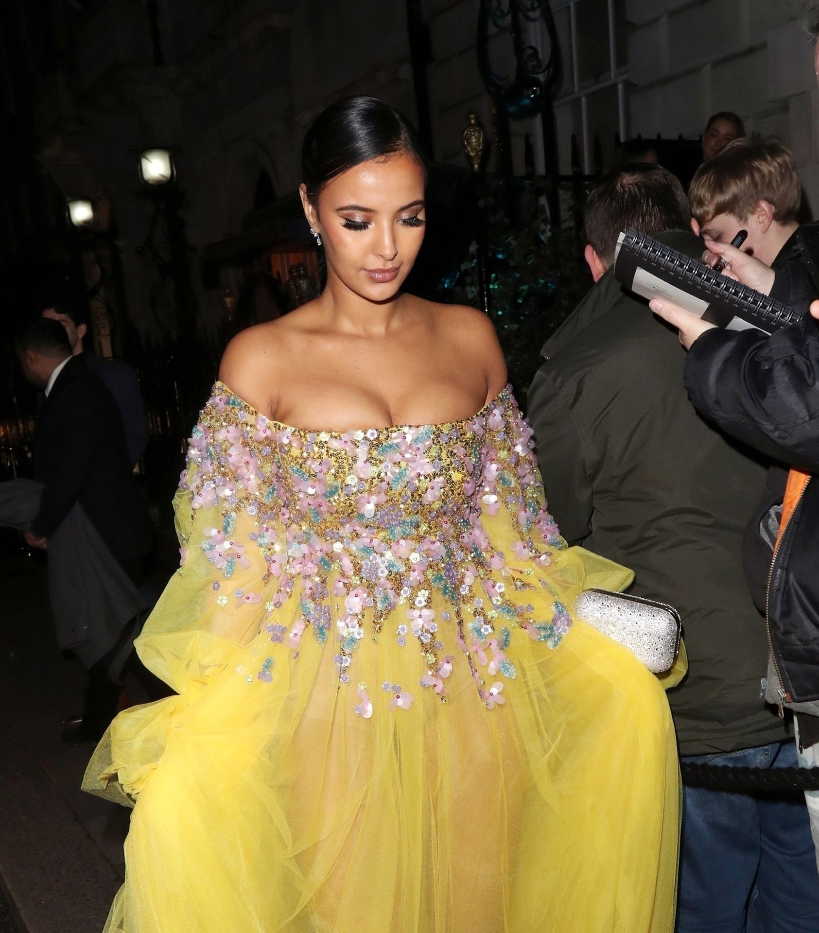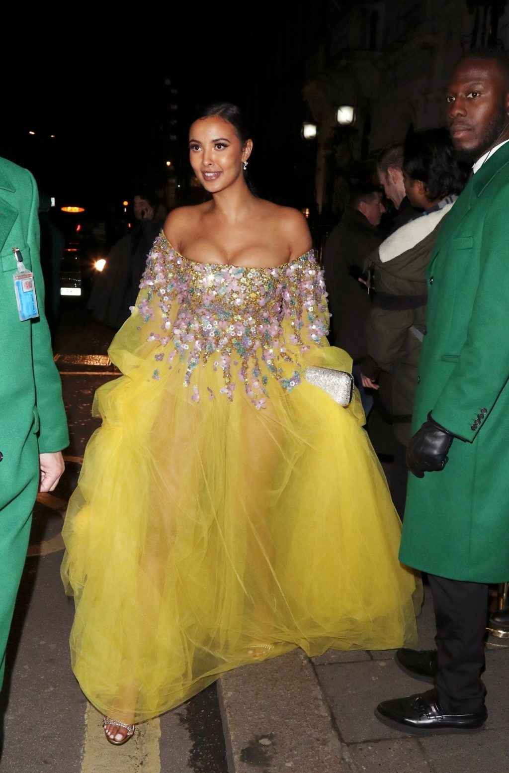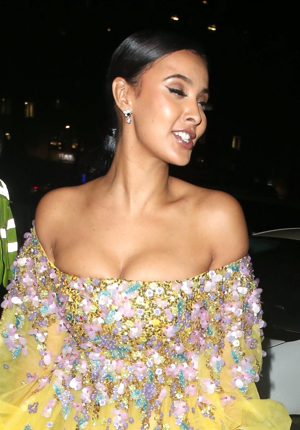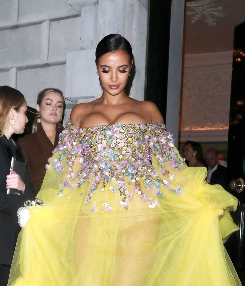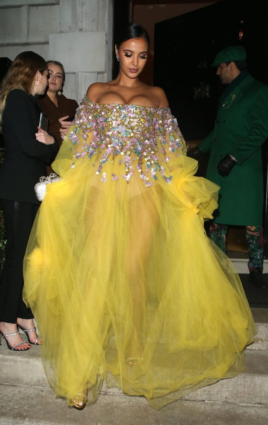 La presentadora de televisión con busto Maya Jama fue fotografiada mientras asistía a la fiesta Celebrate Fashion and Film de British Vogue y Tiffany & Co. en Annabel’s en Londres, 02/02/2020.