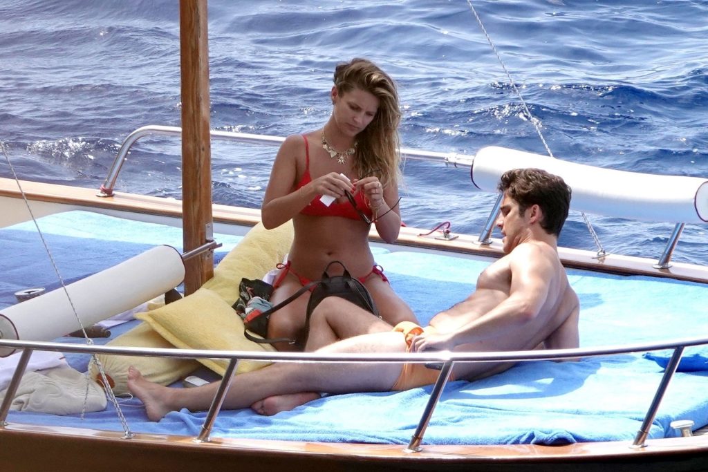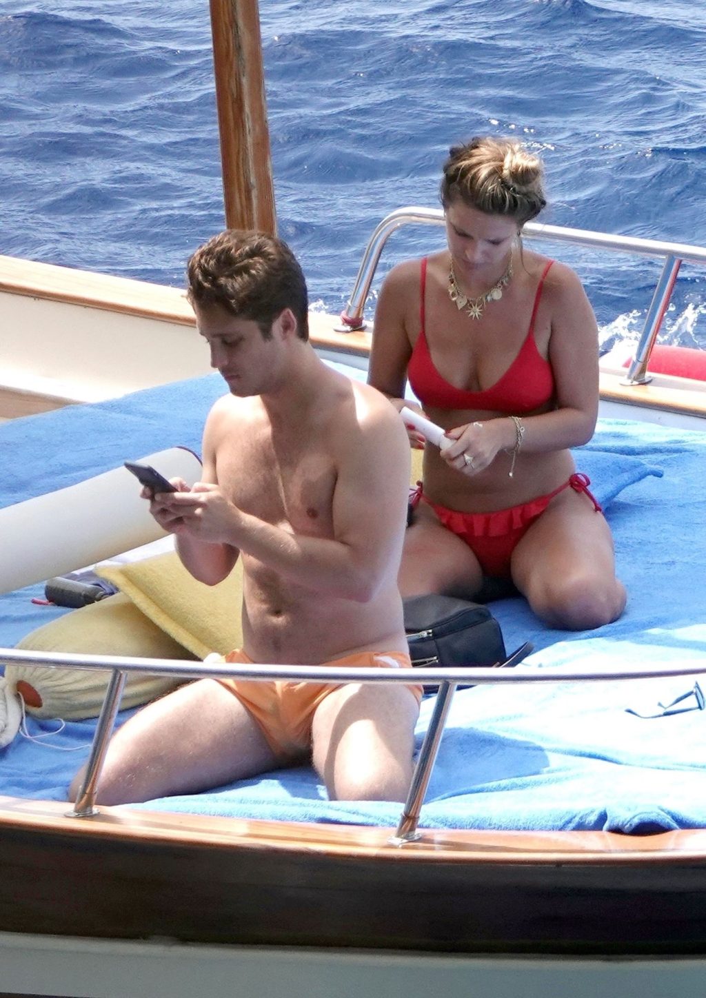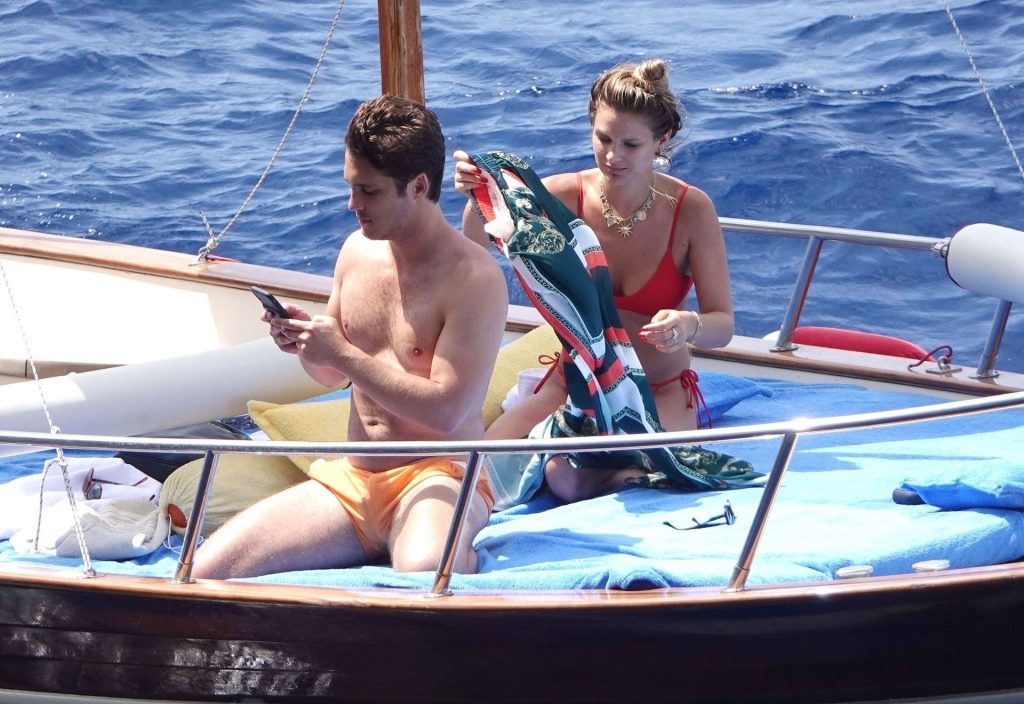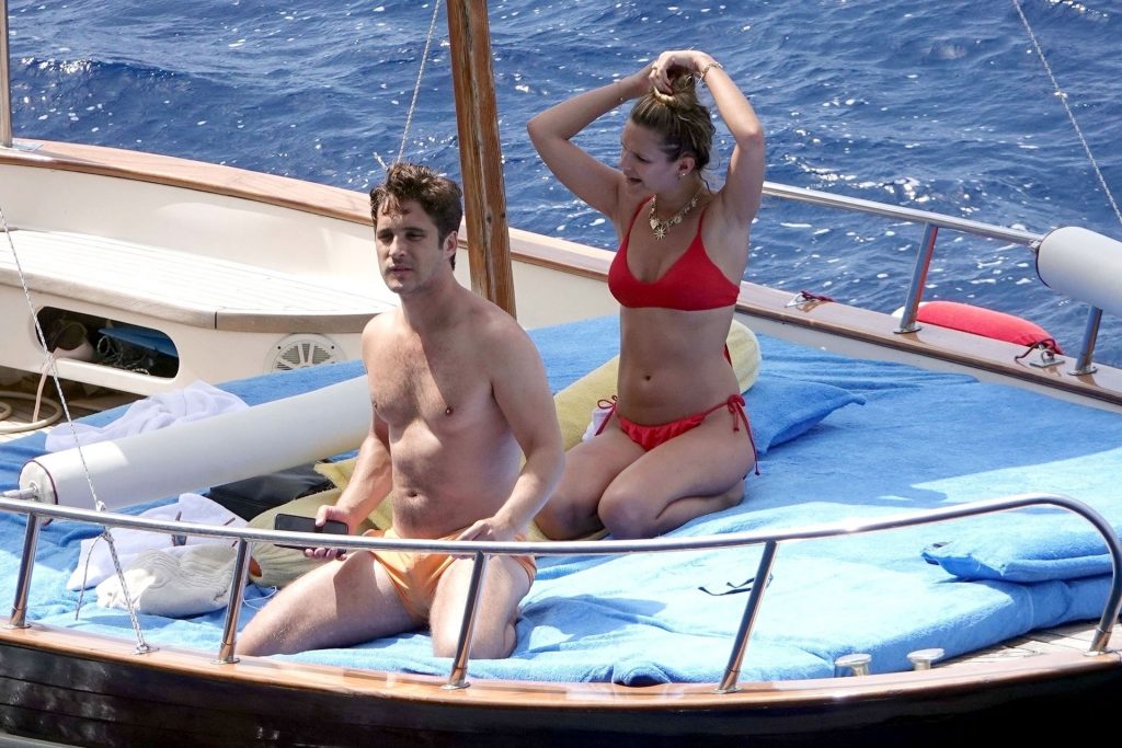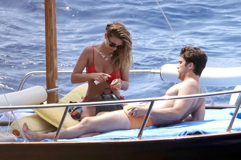 La pareja enamorada brilló bajo el sol italiano, con Diego sin camisa y Mayte luciendo su escaso bikini rojo en su barco.