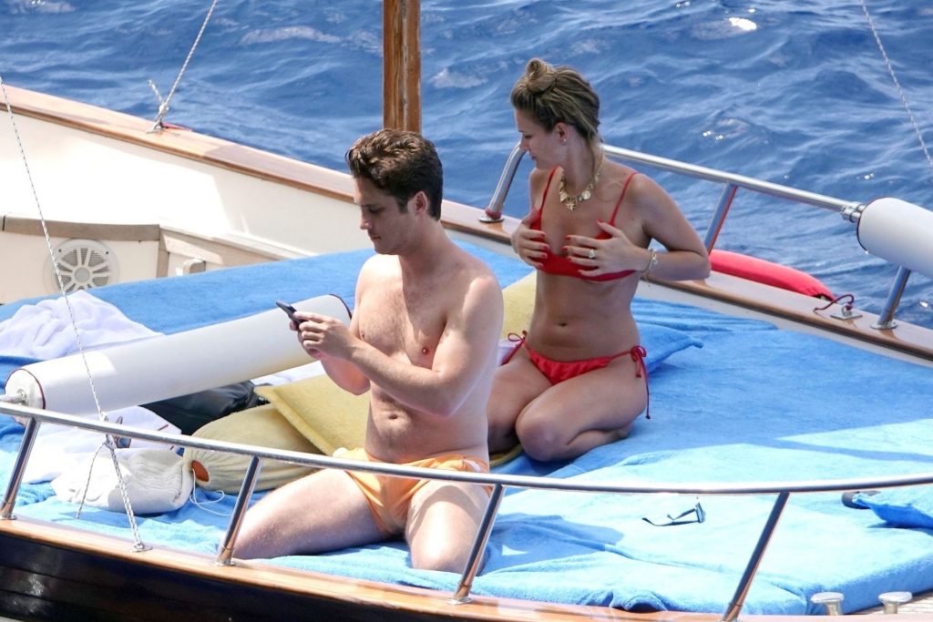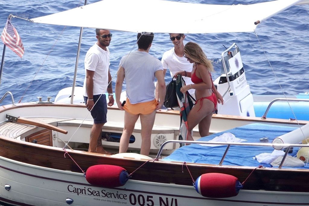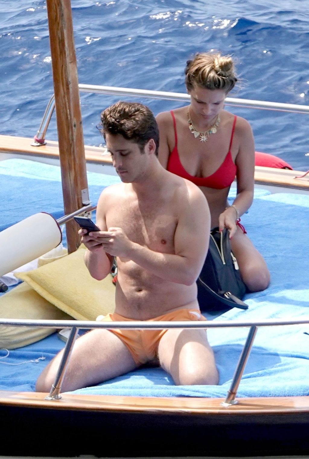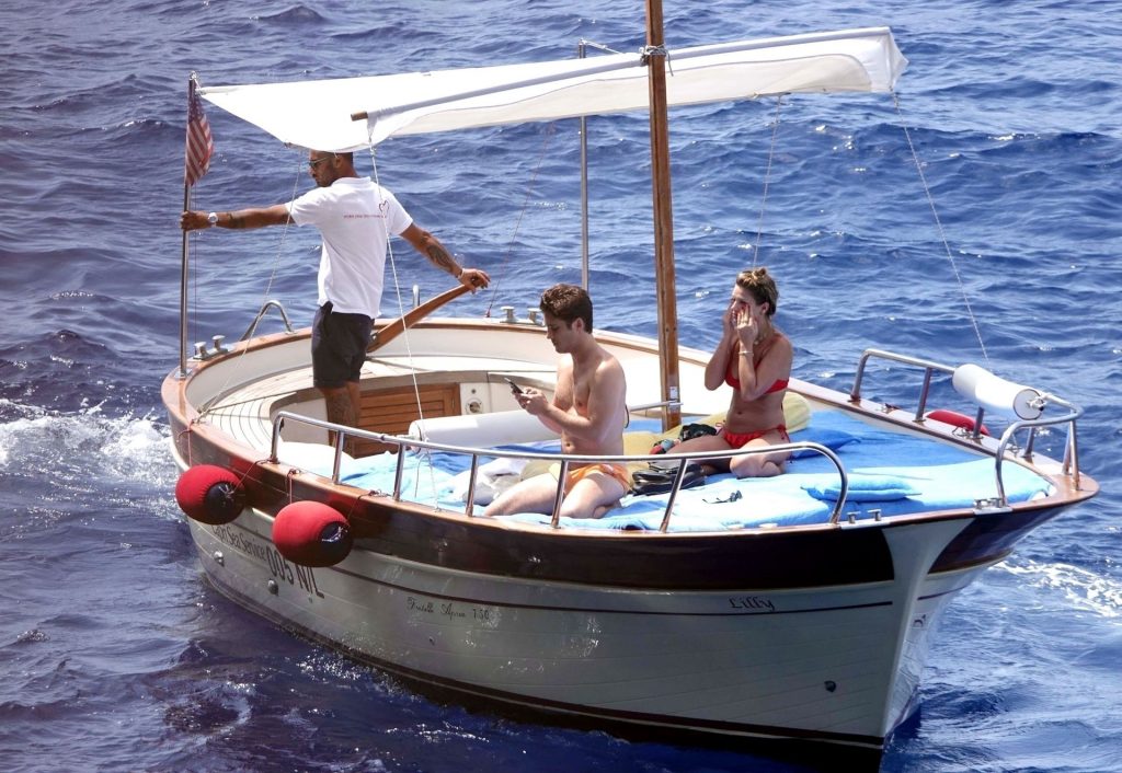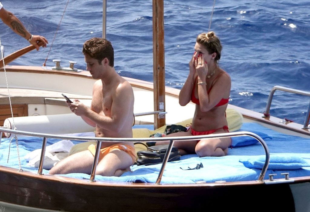 La pareja enamorada brilló bajo el sol italiano, con Diego sin camisa y Mayte luciendo su escaso bikini rojo en su barco.