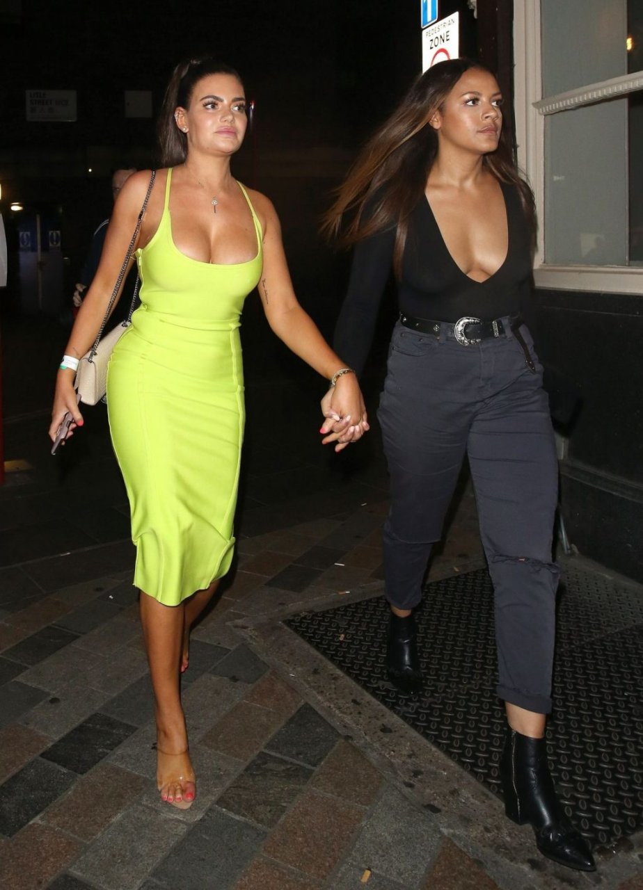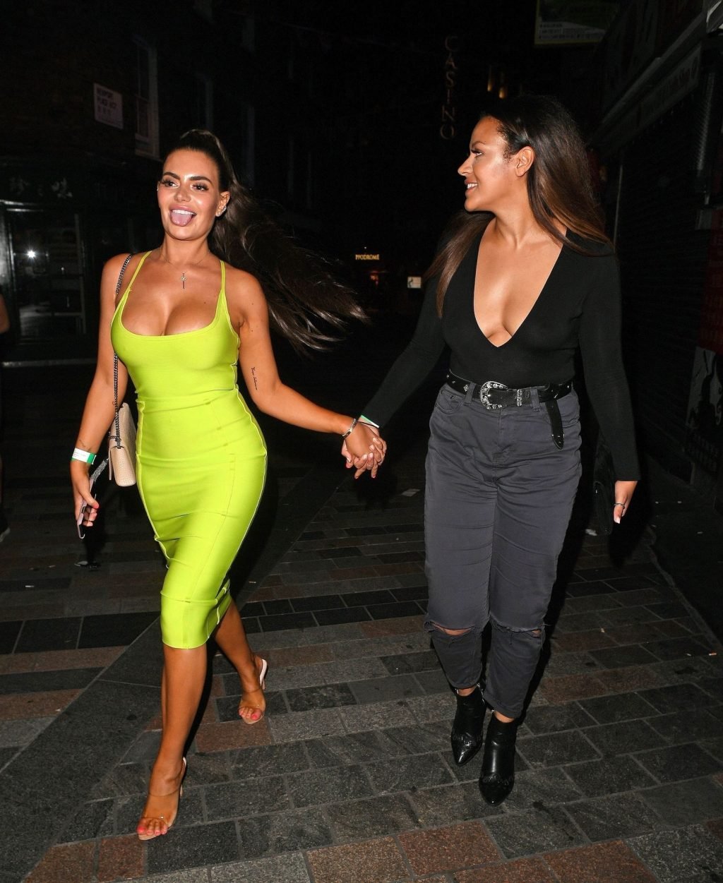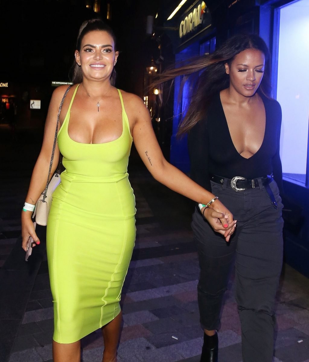 Megan Barton Hanson fue fotografiada luciendo un poco desgastada al salir del casino Hippodrome y luego fue vista posando en Soho junto a un cartel de ella misma, 08/06/2019. Megan mostró un busto llamativo con un vestido verde brillante.