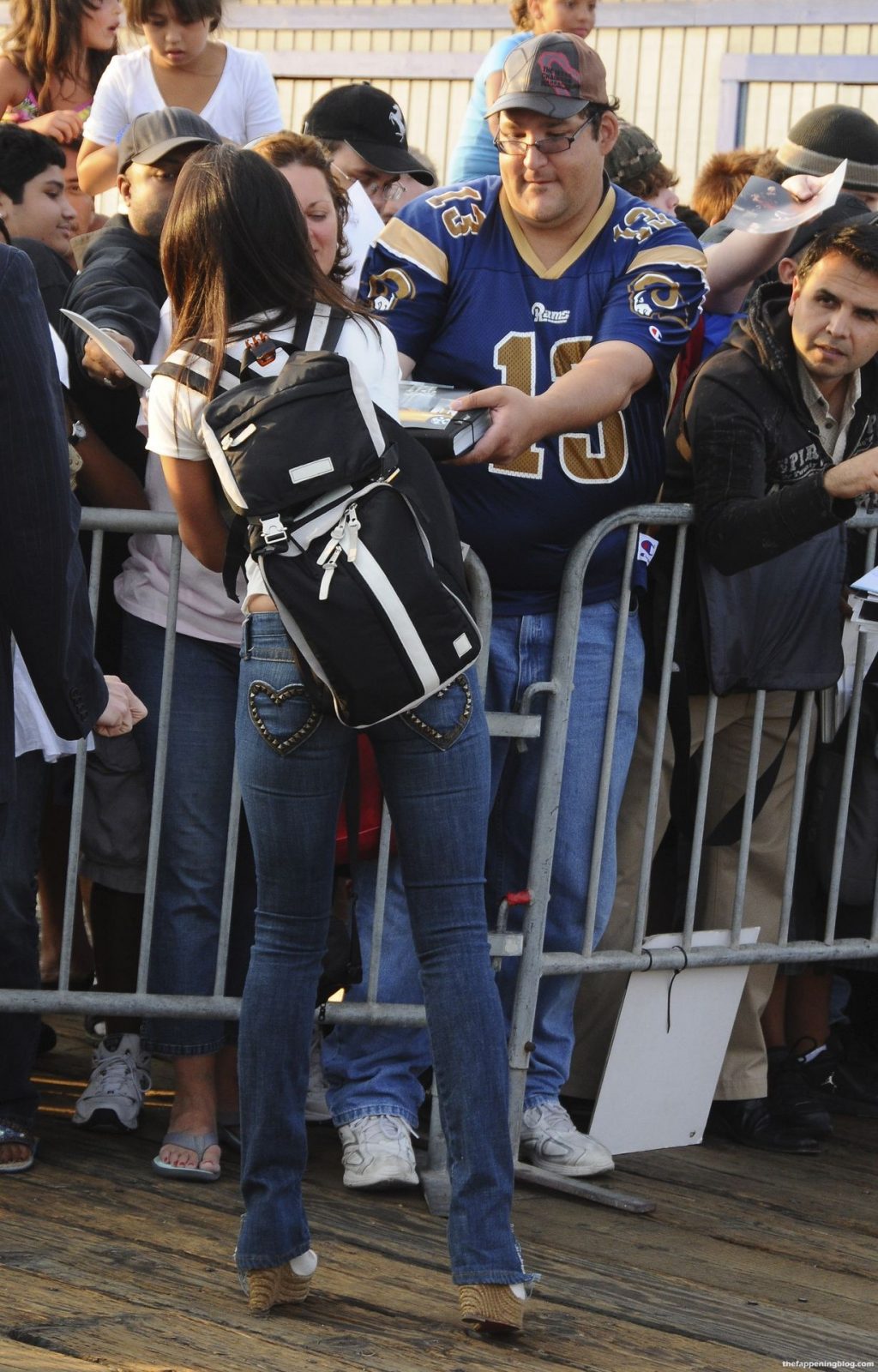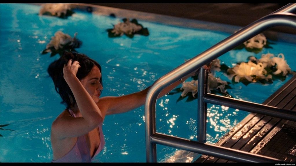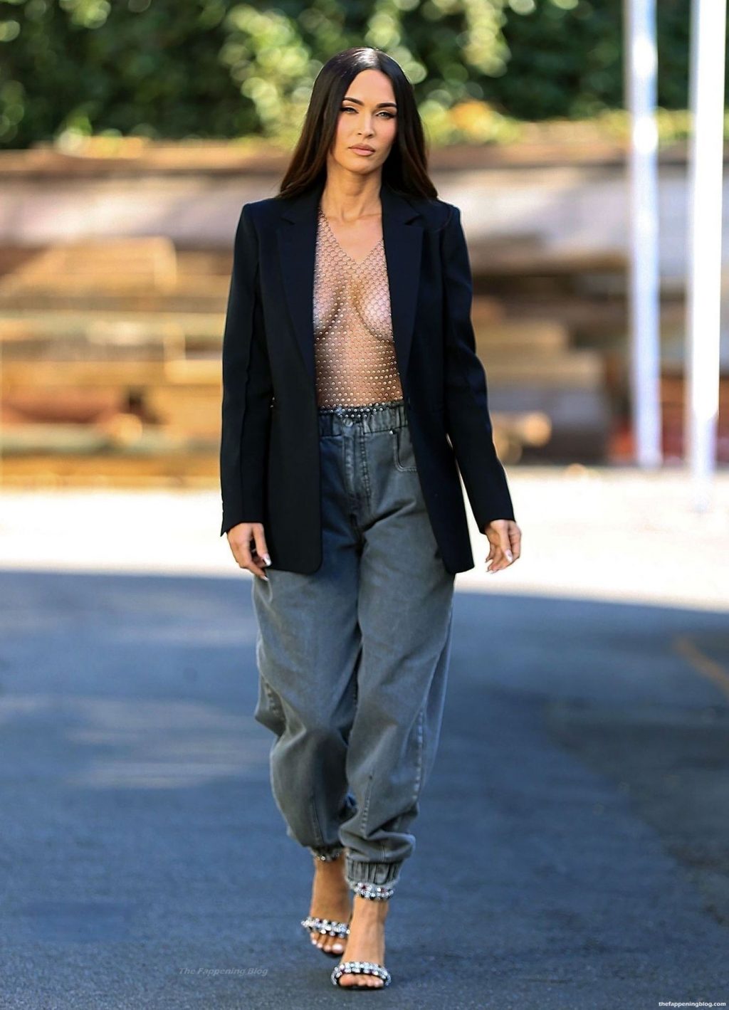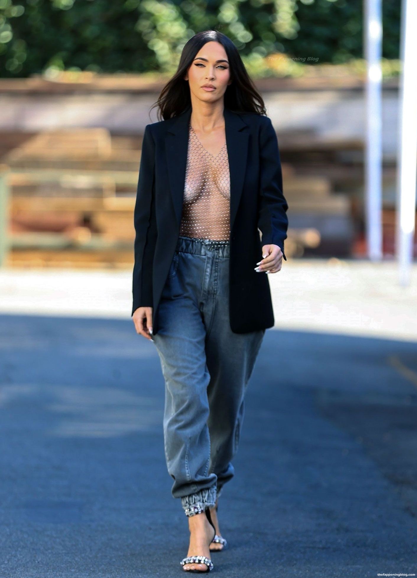 Megan Fox is wearing a dress with a plunging neckline as she steps into a shallow pool of water and emerges from the other side, her dress now clinging to her breasts and showing some pokey nipples through the wet fabric. She then continues to wear the same wet dress as she walks out toward a limo while chatting with a few people.