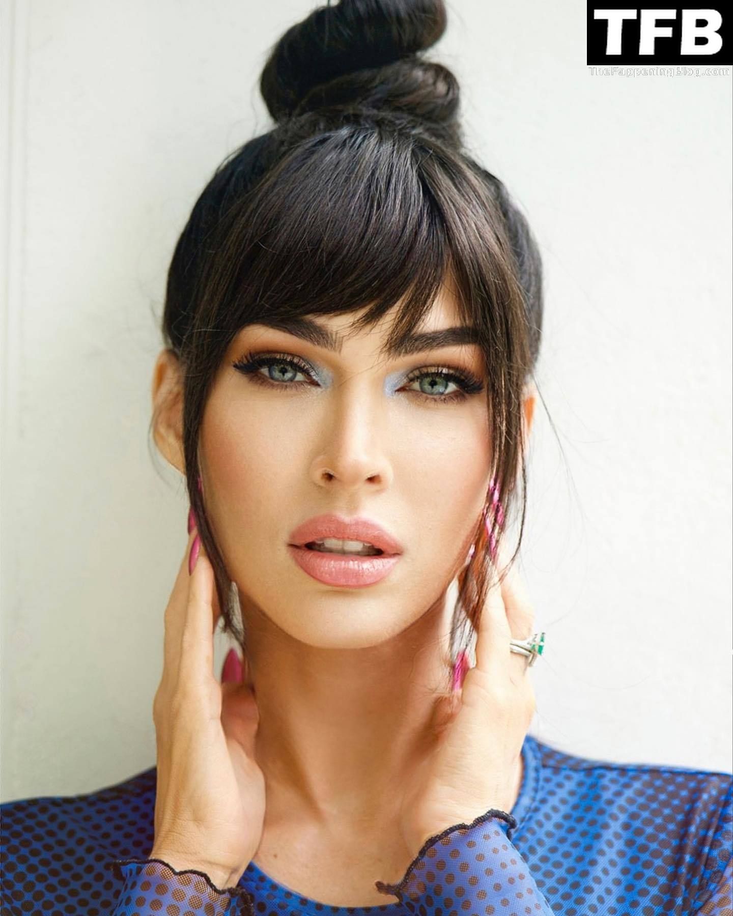 La estrella de The Fappening, Megan Fox, posa con una falda azul, top y botas negras en una sesión de fotos de Cibelle Levi (abril de 2022).