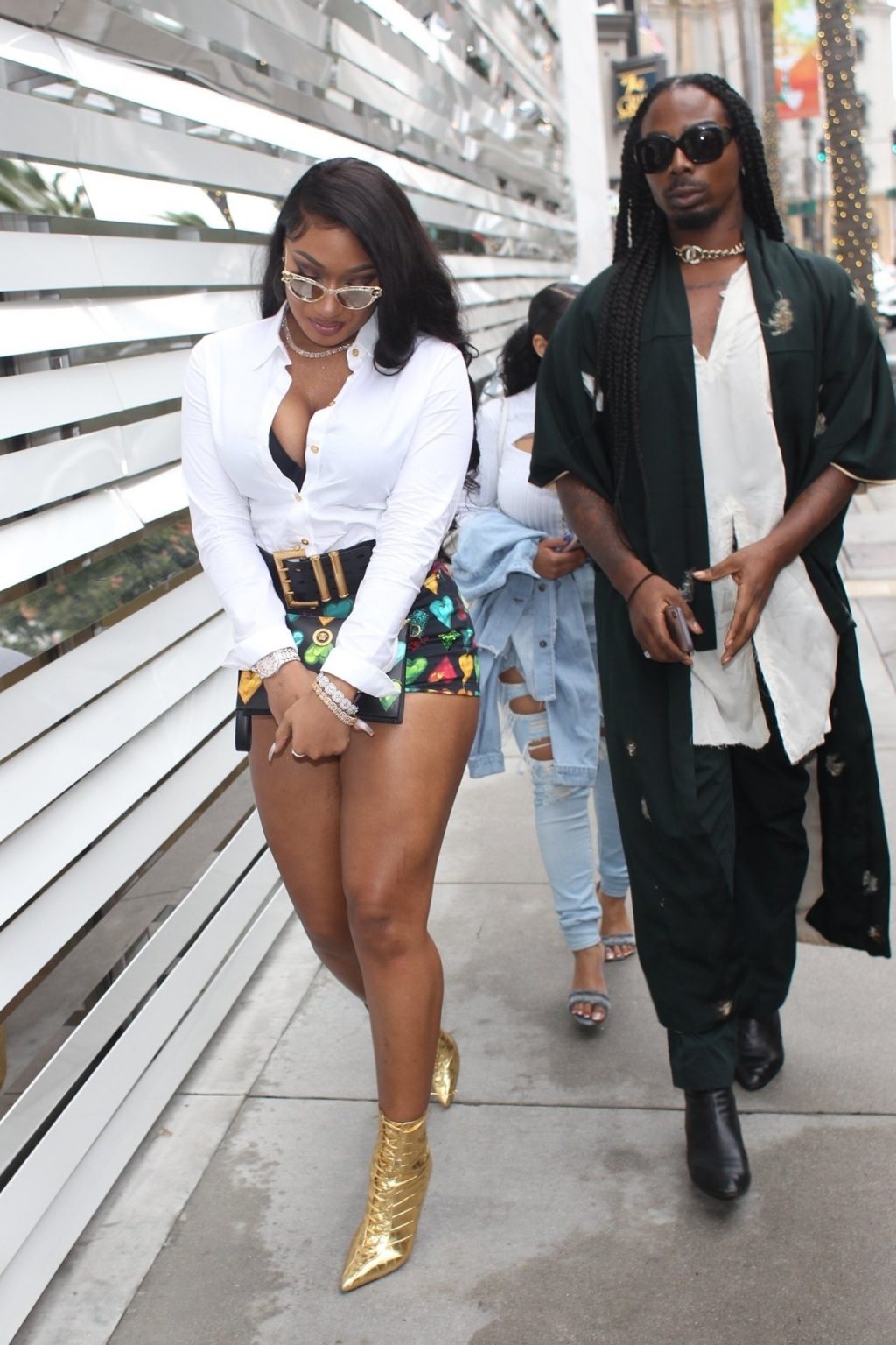 La rapera Megan Thee Stallion (24) y la estilista EJ King compran con una amiga en Louis Vuitton en Rodeo Drive en Beverly Hills, 07/12/2019.