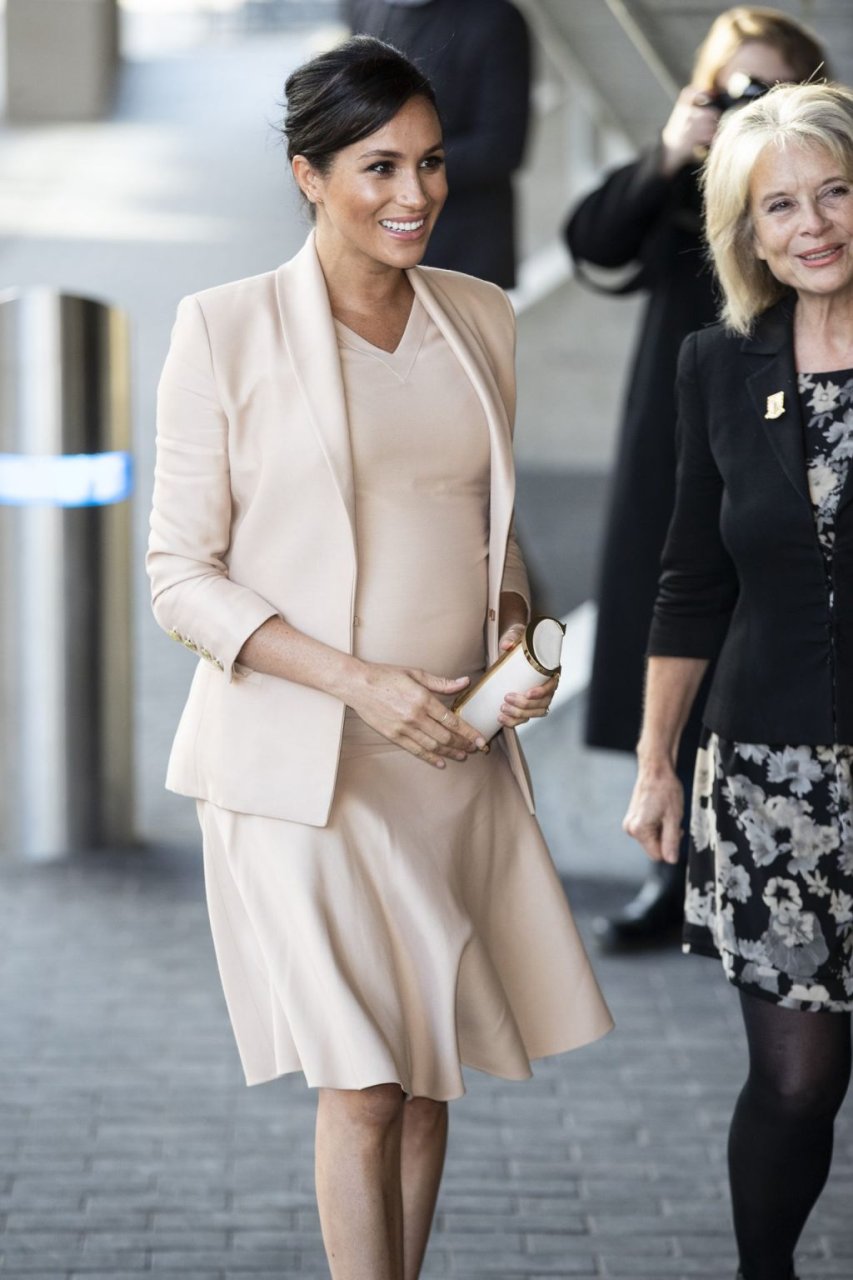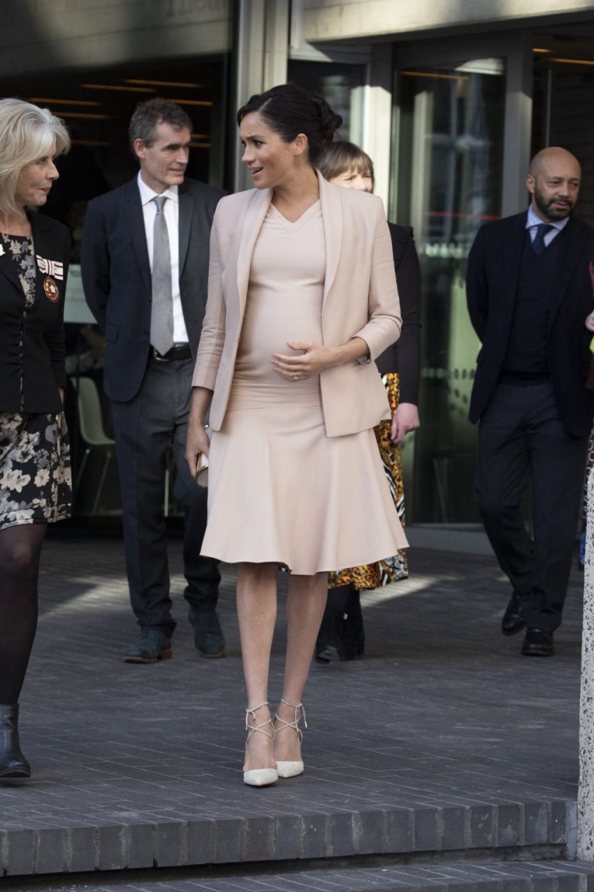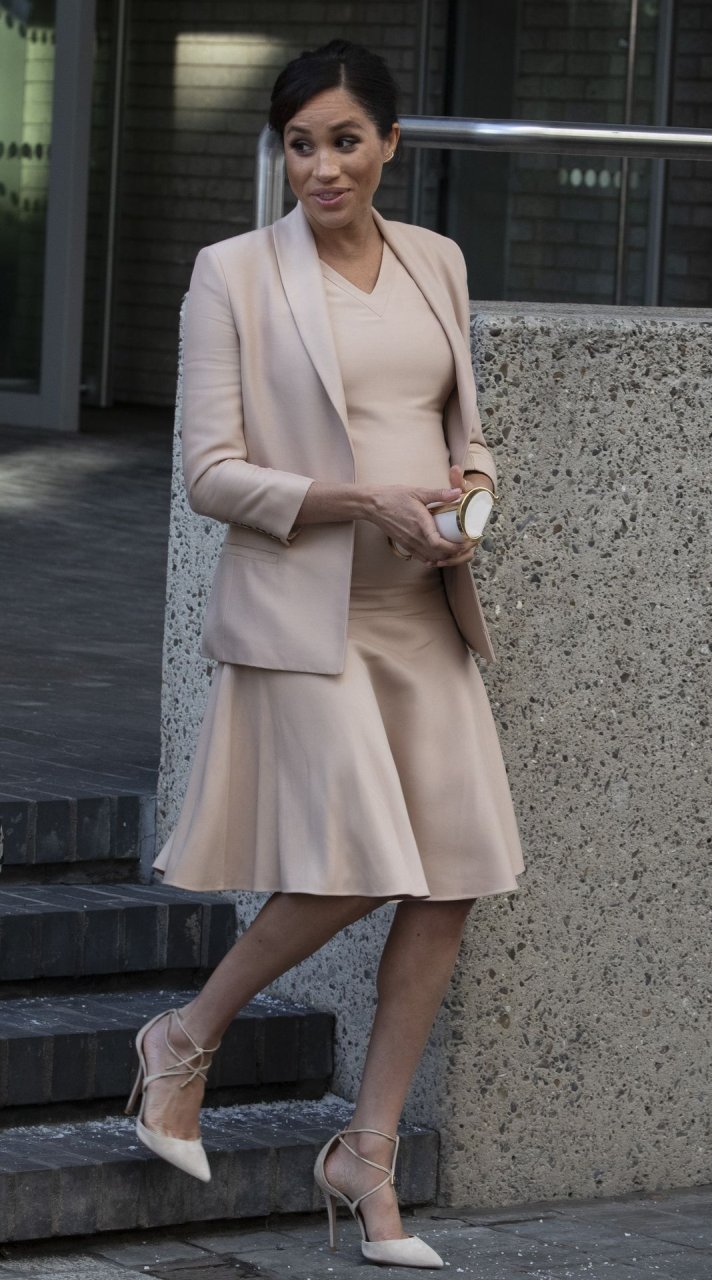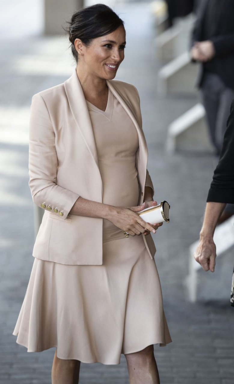 Meghan combinó un vestido nude en línea A con un blazer a juego, ambos de Brandon Maxwell. Ella complementó con un bolso clutch de Carolina Herrera y un par de tacones nude con cordones de Aquazurra.