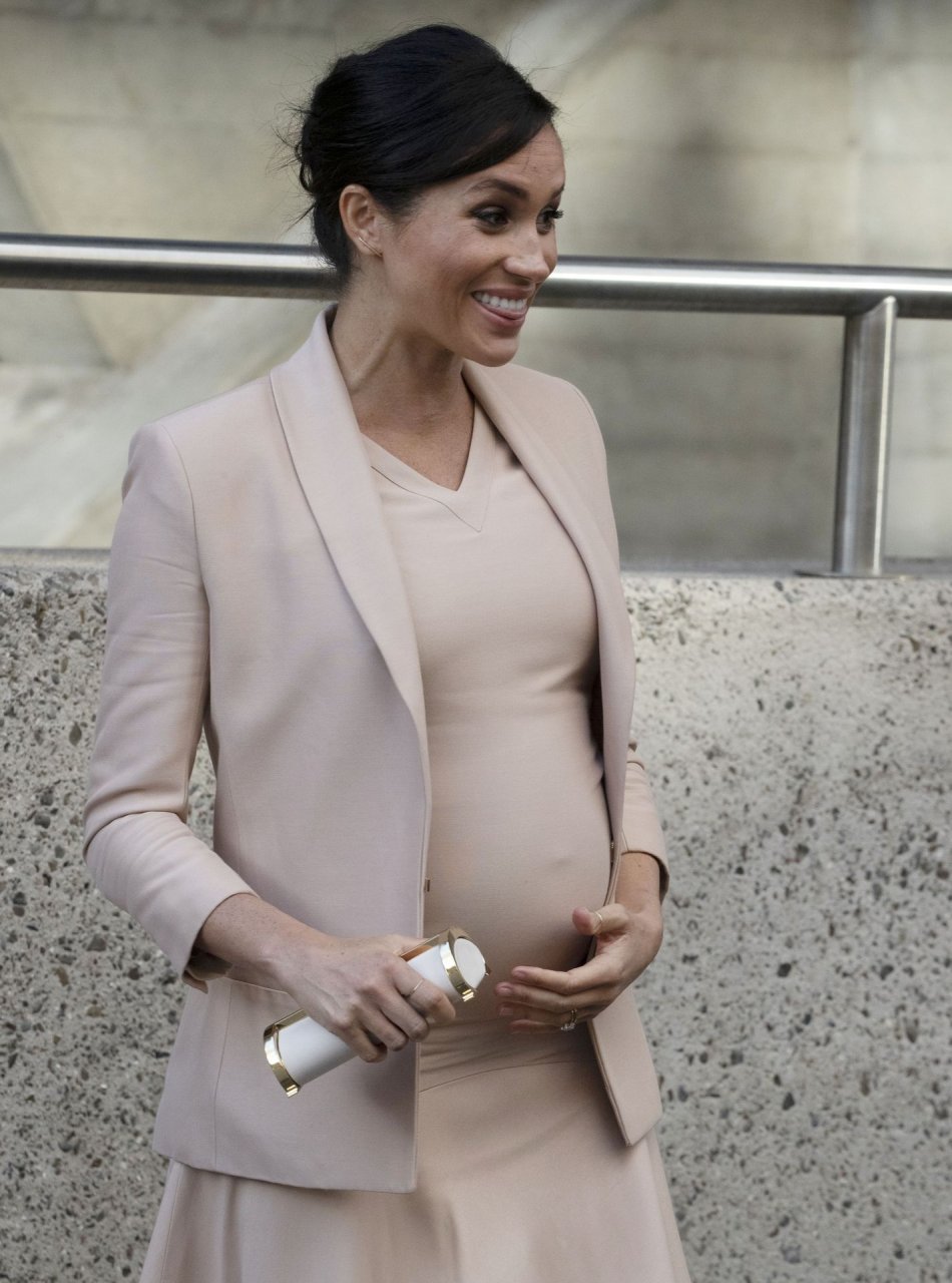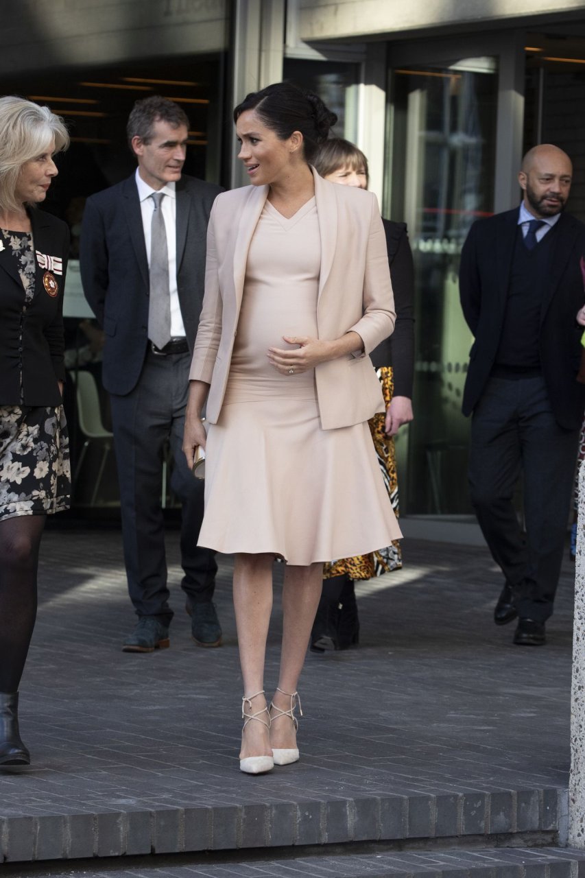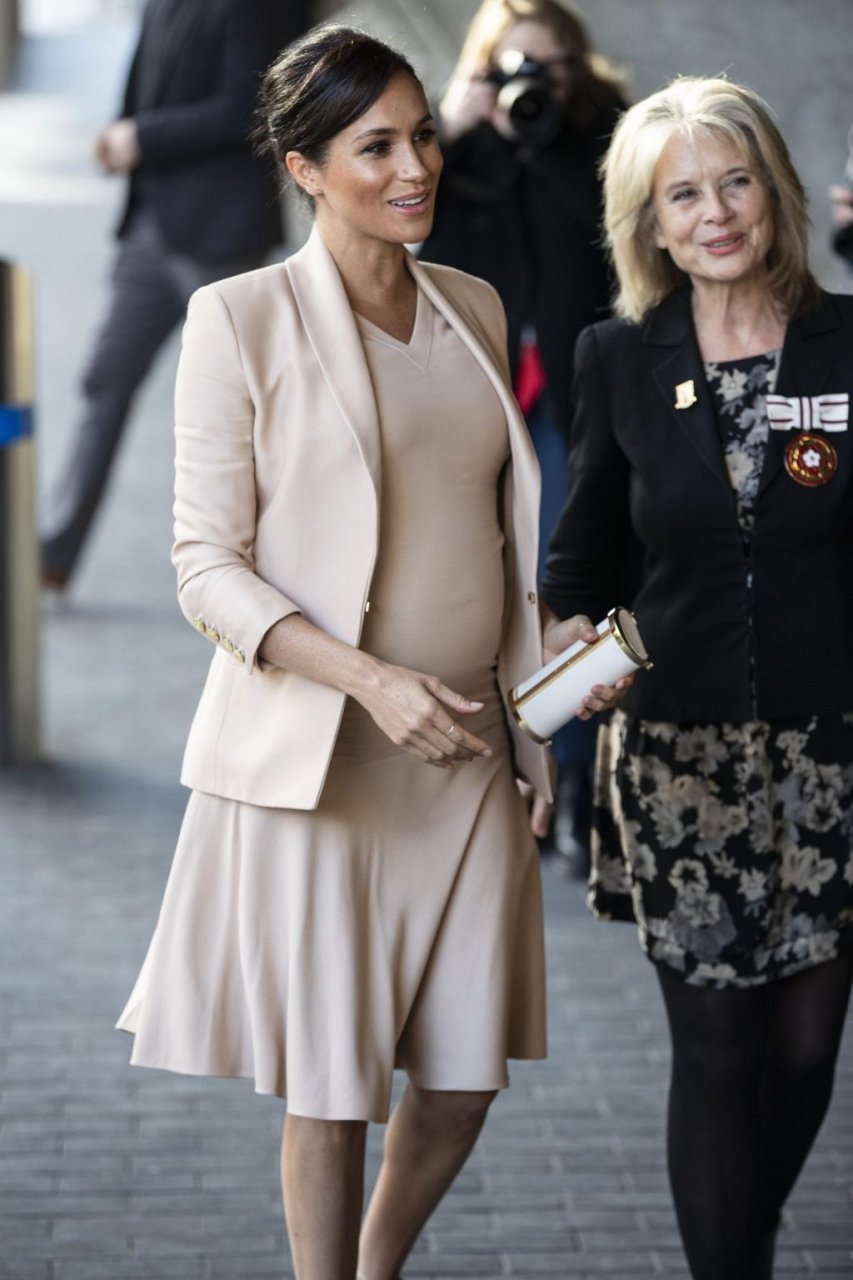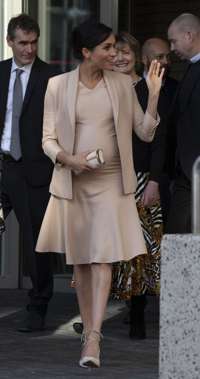 Meghan combinó un vestido nude en línea A con un blazer a juego, ambos de Brandon Maxwell. Ella complementó con un bolso clutch de Carolina Herrera y un par de tacones nude con cordones de Aquazurra.