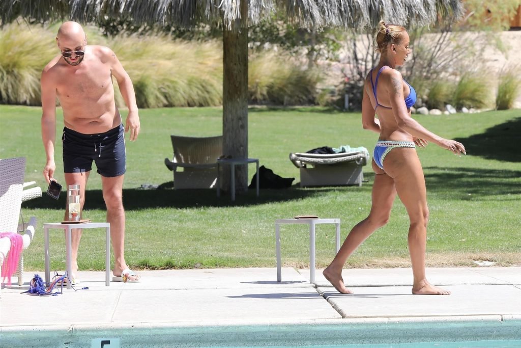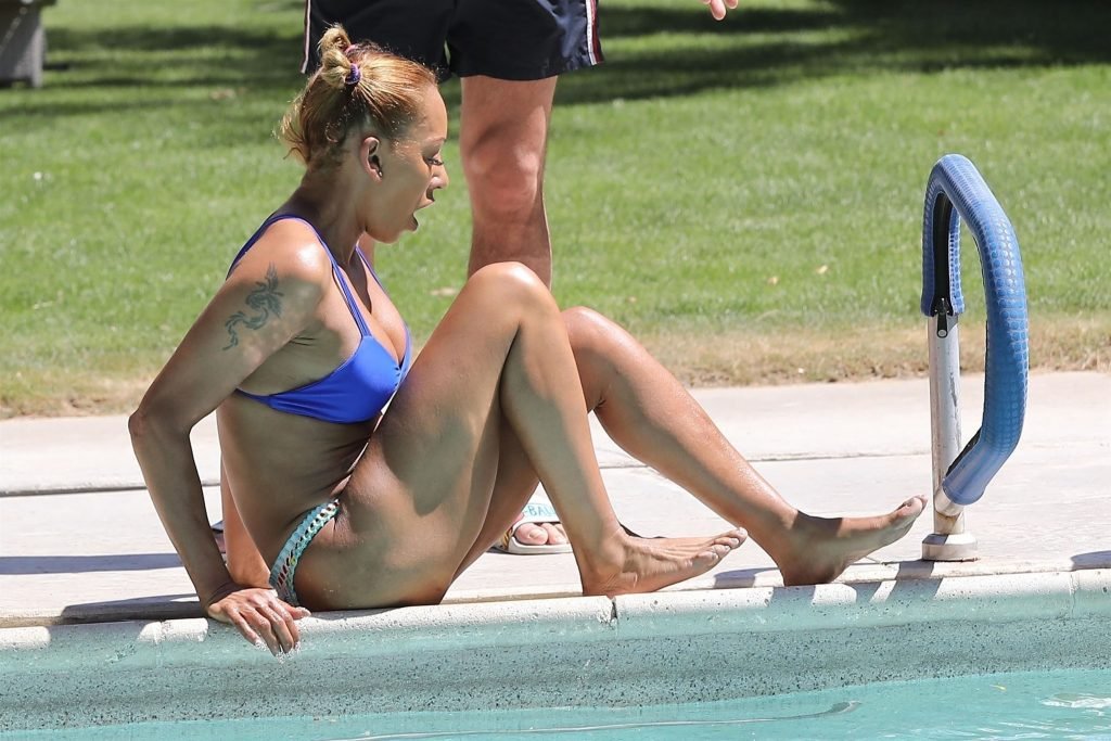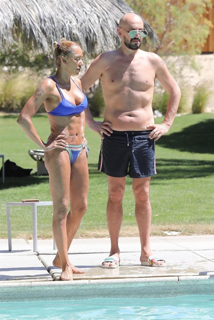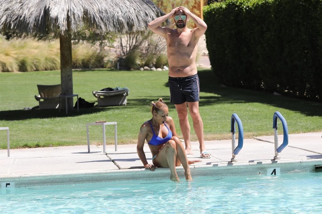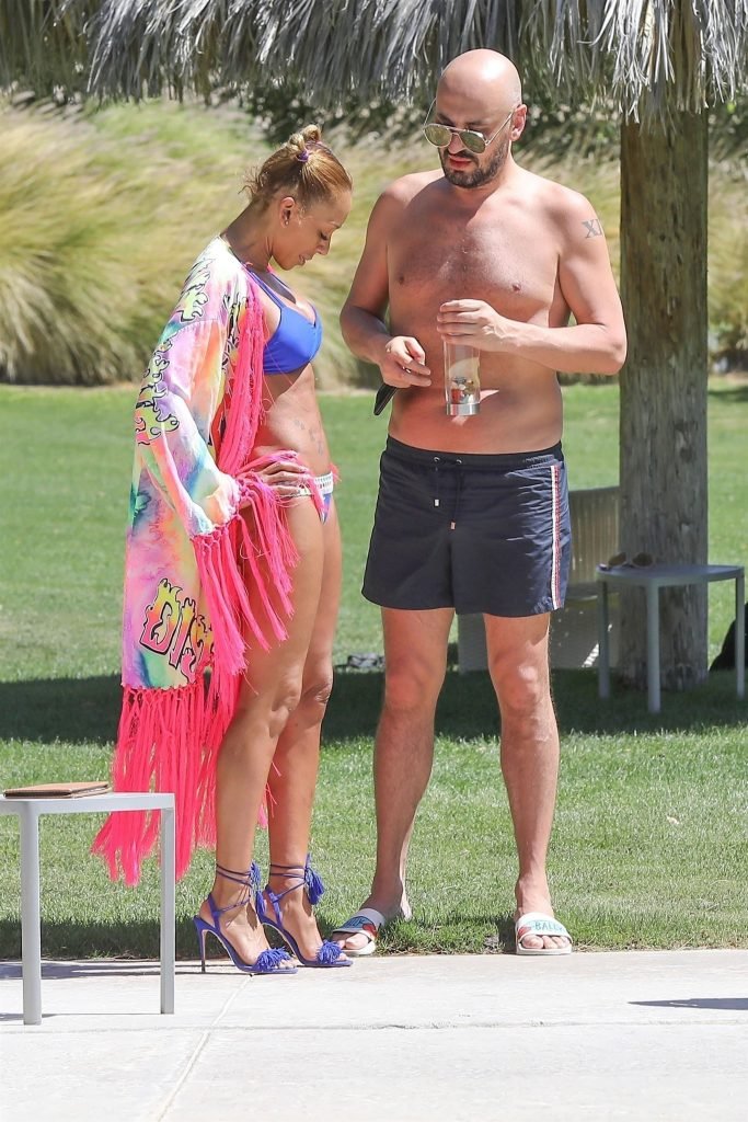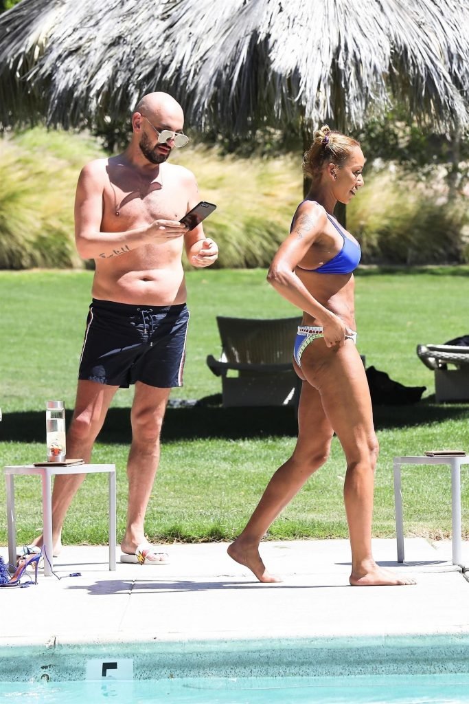 La estrella de televisión Mel B, 42, y Gary Madatyan se ven disfrutando en la piscina mientras están de vacaciones en Desert Hot Springs, 13/04/2018. Melanie Brown mostraba su cuerpo tonificado de milf en un diminuto bikini azul que combinó con sandalias de tacón aguja y una cubierta Di$count Universe.