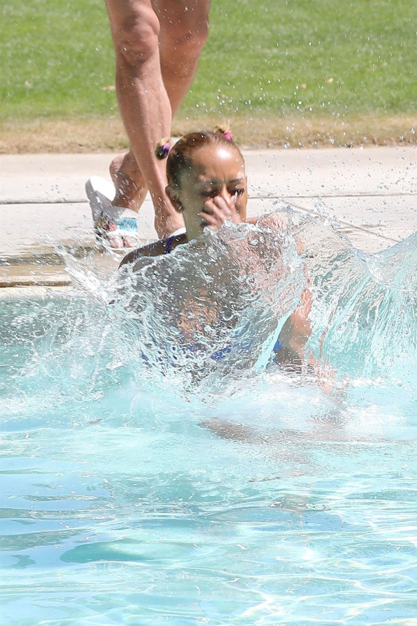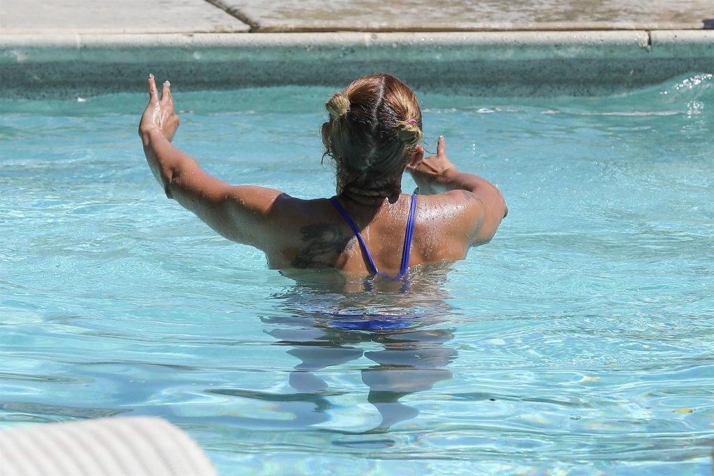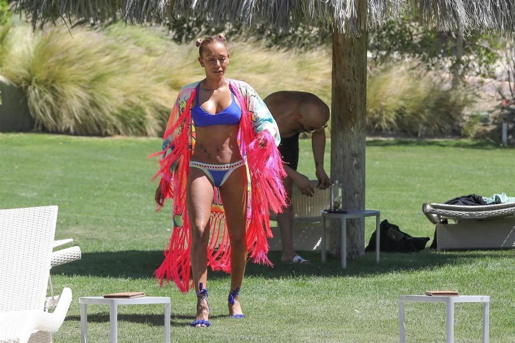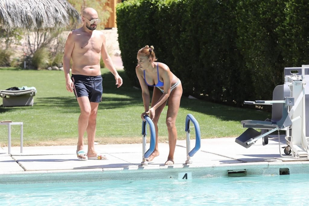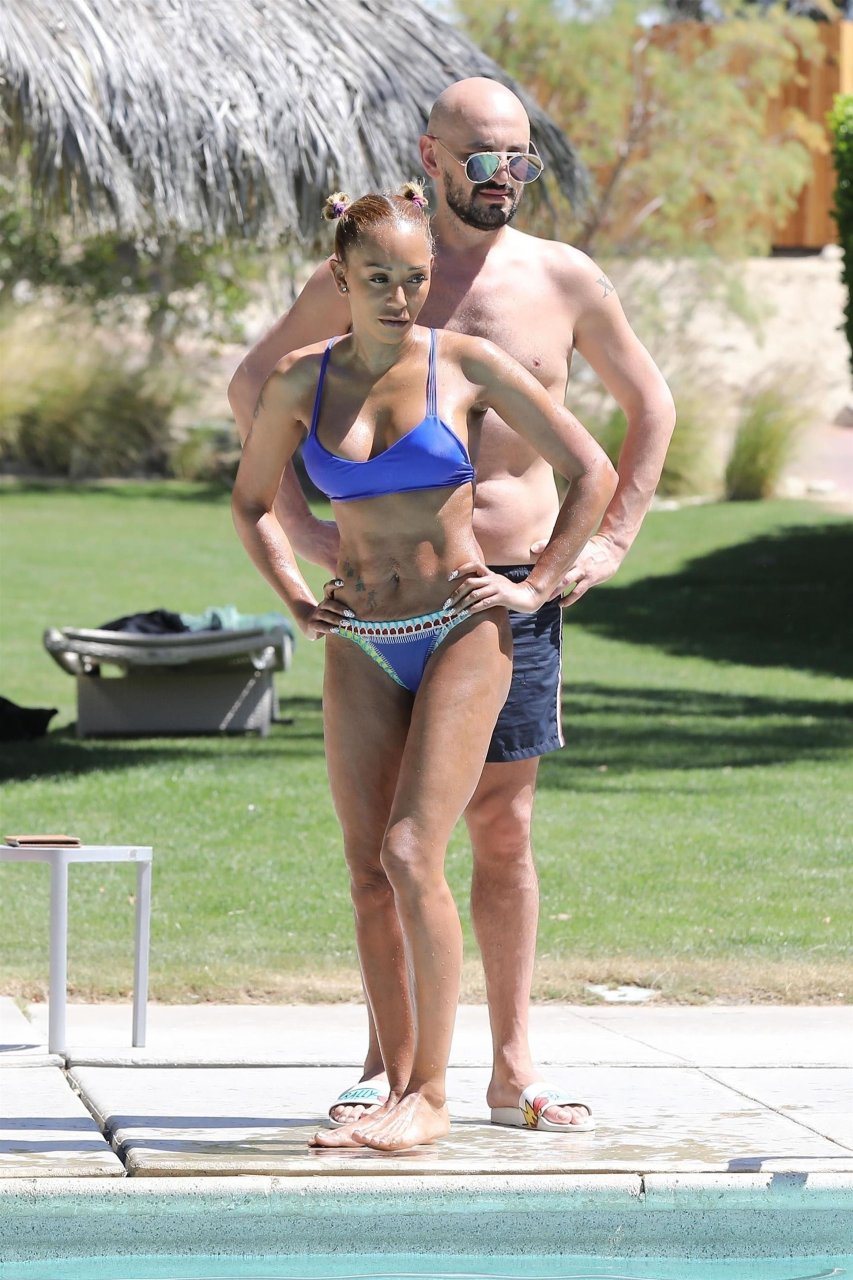 La estrella de televisión Mel B, 42, y Gary Madatyan se ven disfrutando en la piscina mientras están de vacaciones en Desert Hot Springs, 13/04/2018. Melanie Brown mostraba su cuerpo tonificado de milf en un diminuto bikini azul que combinó con sandalias de tacón aguja y una cubierta Di$count Universe.