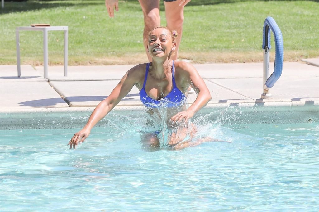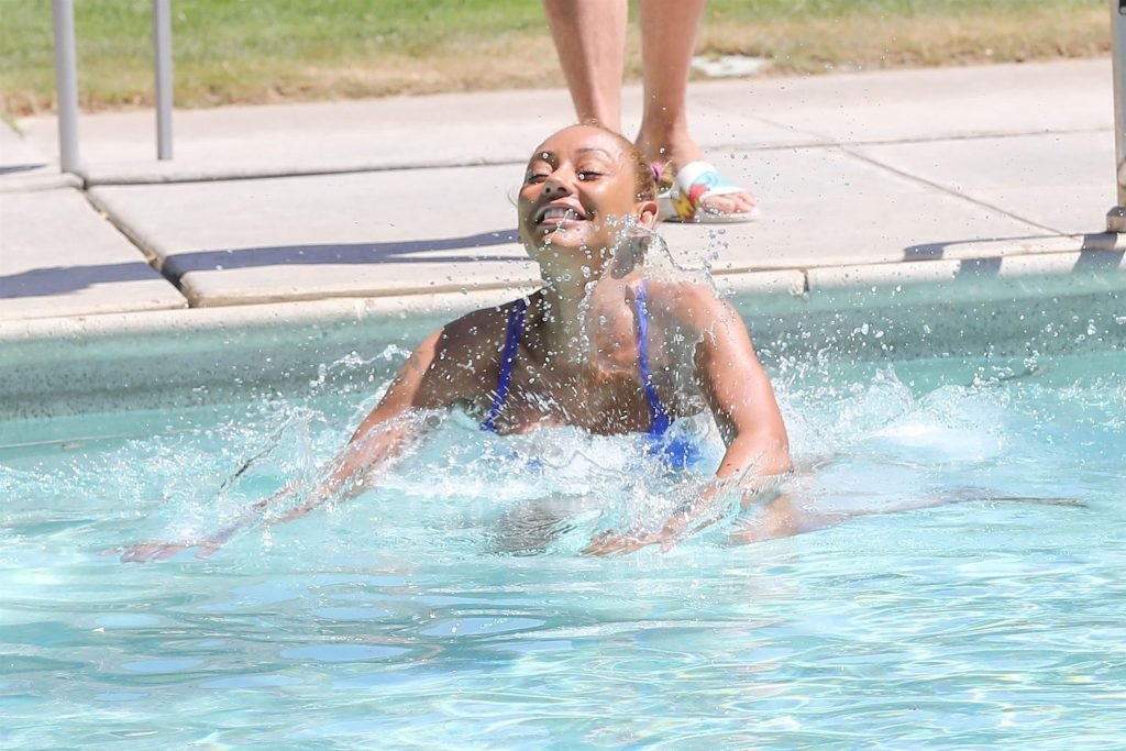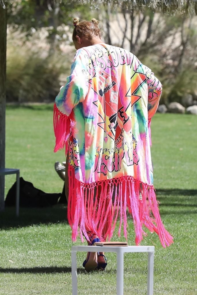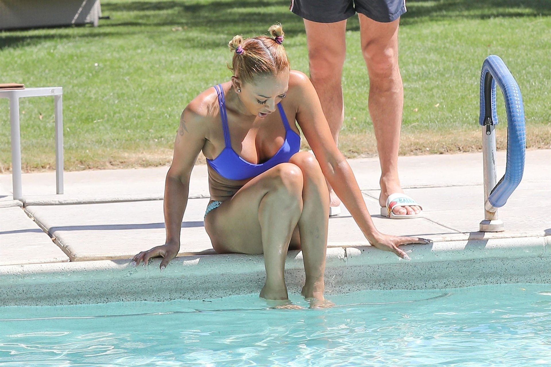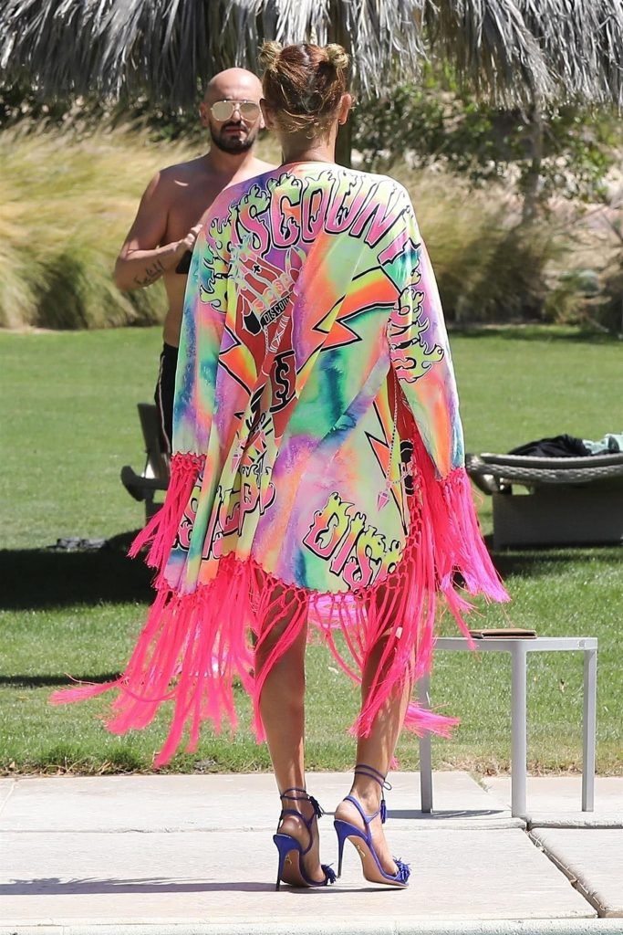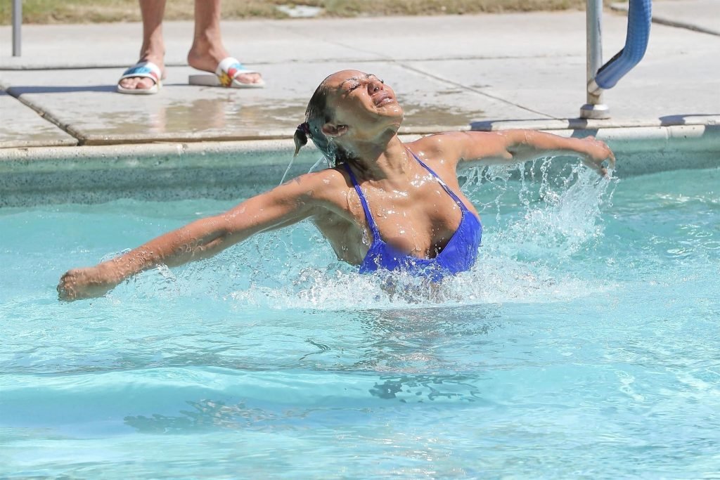 La estrella de televisión Mel B, 42, y Gary Madatyan se ven disfrutando en la piscina mientras están de vacaciones en Desert Hot Springs, 13/04/2018. Melanie Brown mostraba su cuerpo tonificado de milf en un diminuto bikini azul que combinó con sandalias de tacón aguja y una cubierta Di$count Universe.