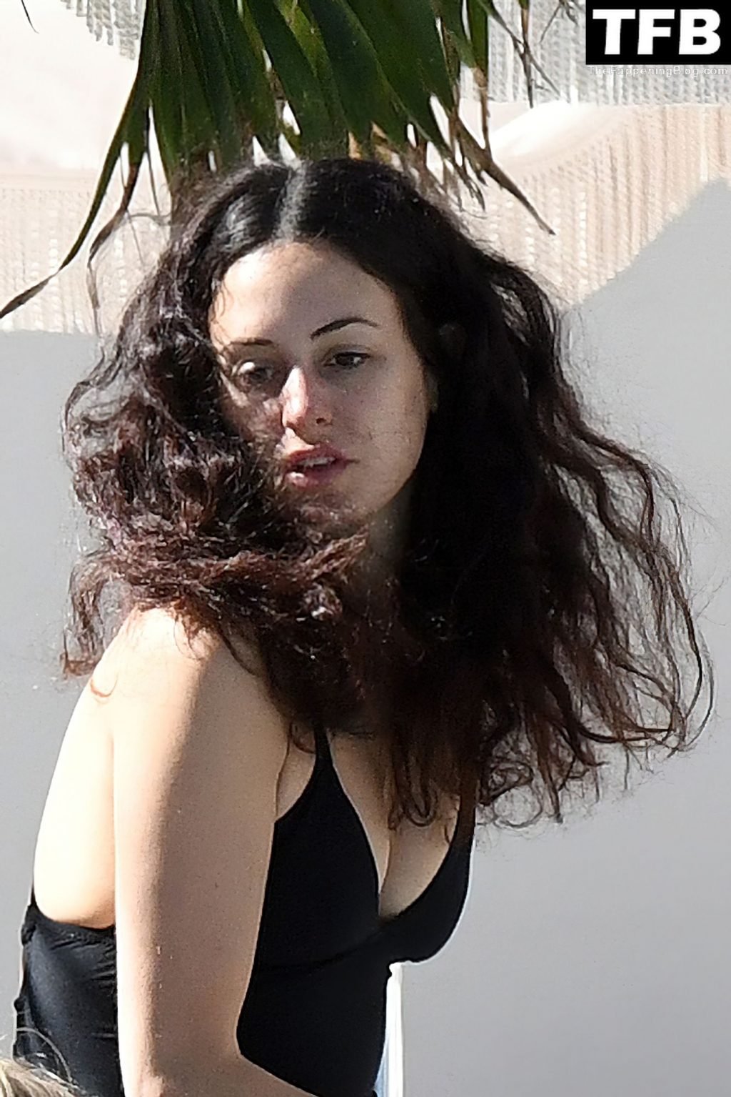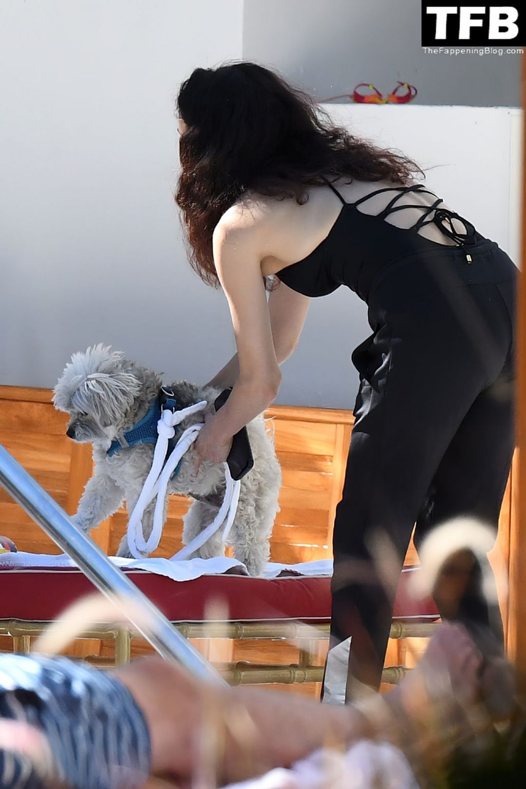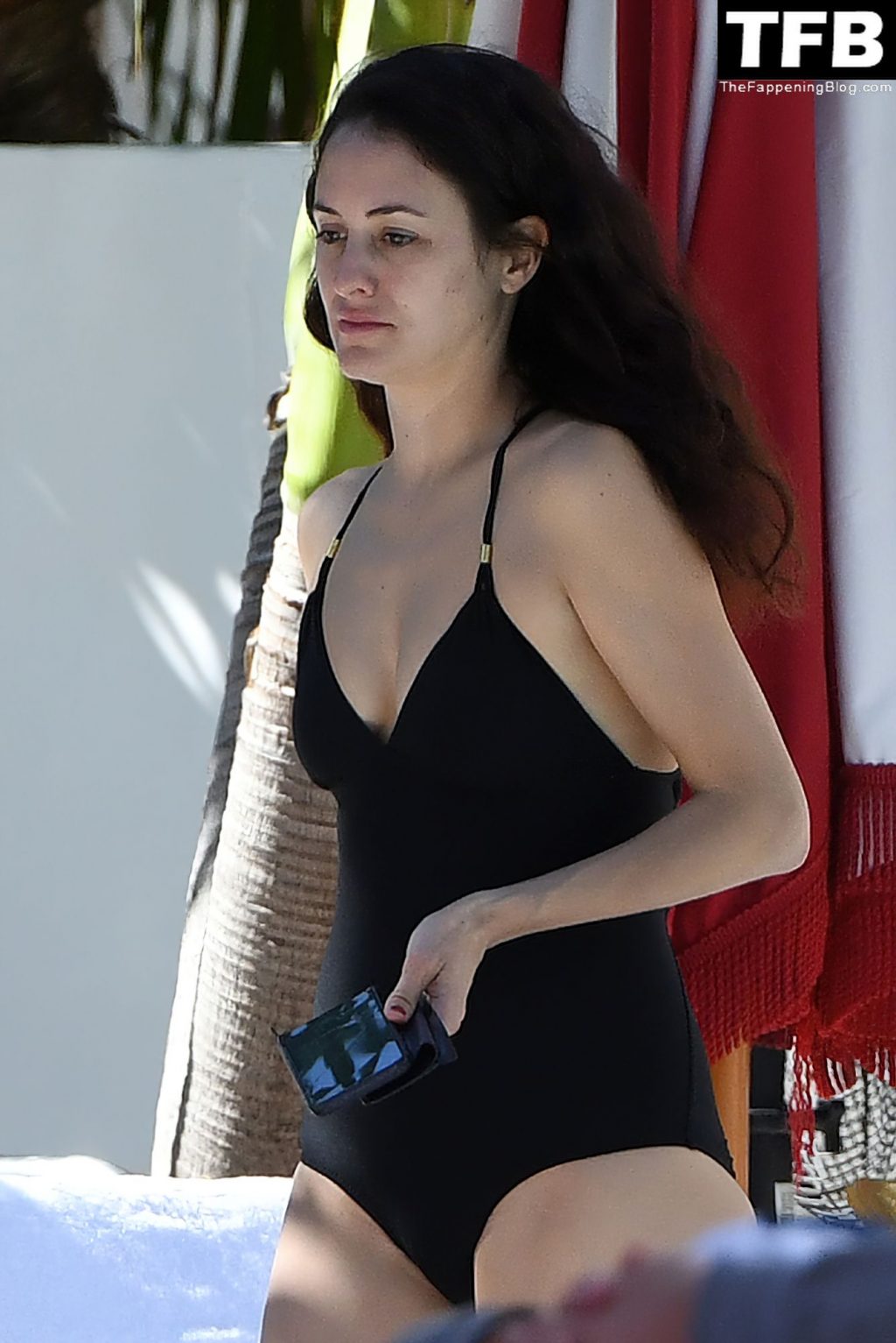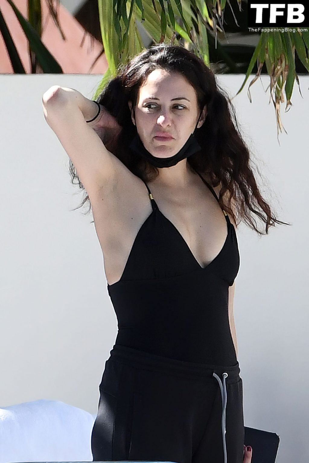 La novia de Mick Jagger, Melanie Hamrick, lleva un traje de baño negro mientras se relaja junto a la piscina con su hijo Deveraux Jagger en Miami, 23/11/2021.