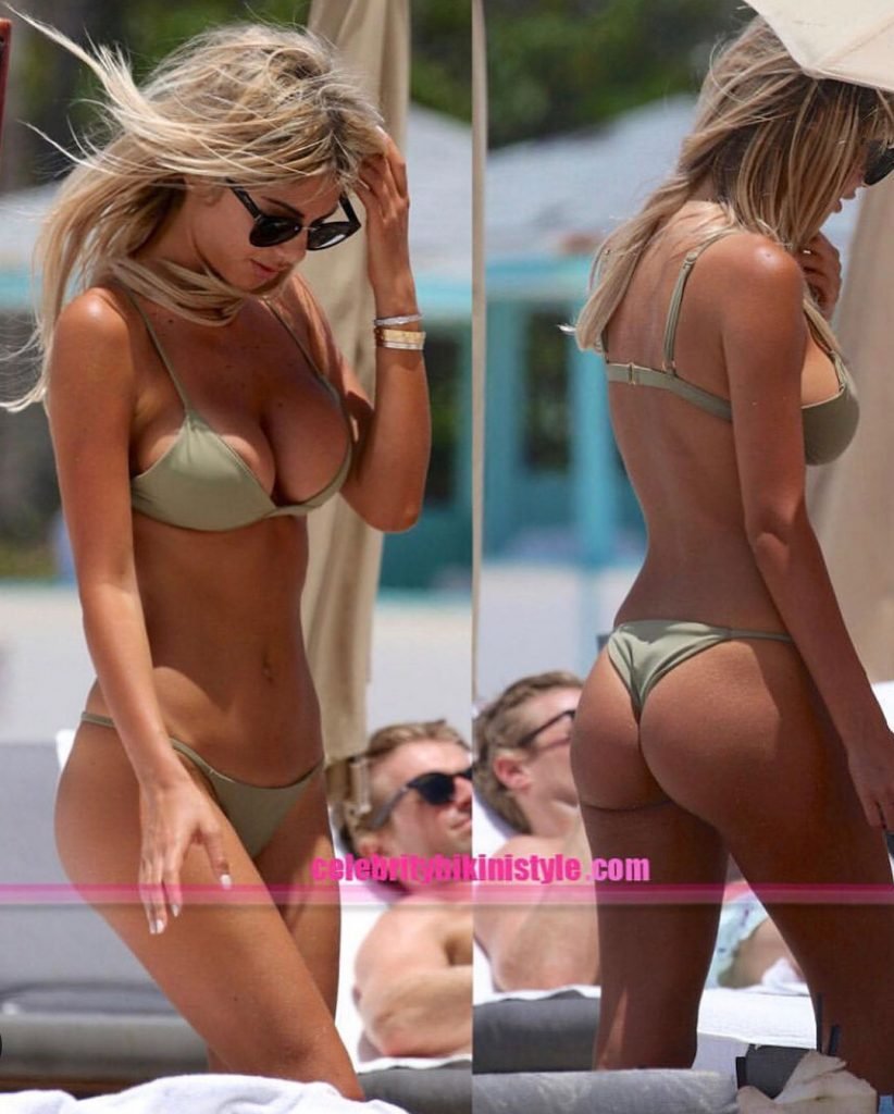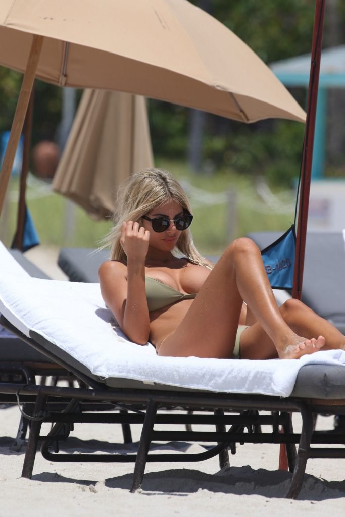 La modelo italiana Melissa Castagnoli se muestra con un bikini tanga beige en la playa de Miami Beach, 24/05/2018. Melissa es la exnovia del futbolista Mario Balotelli, modelo y estrella de las redes sociales. Edad: 27 años.