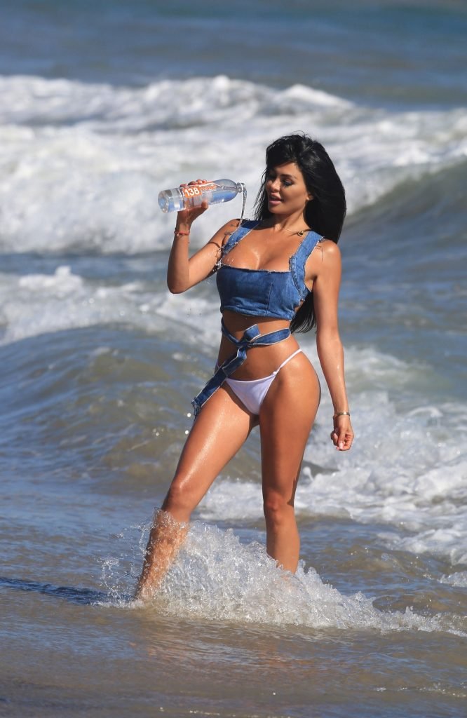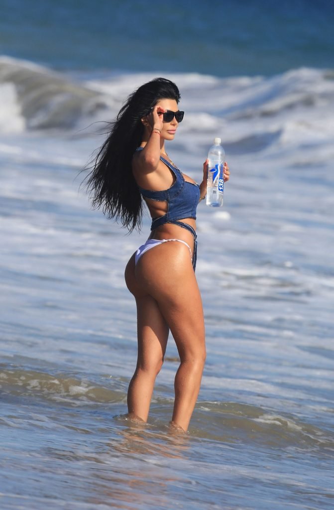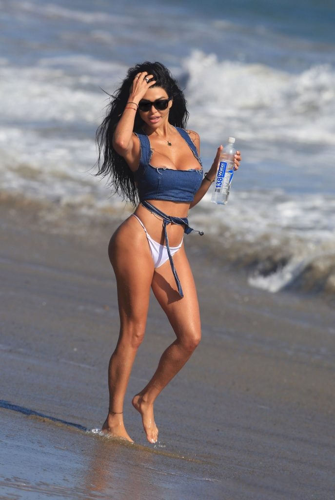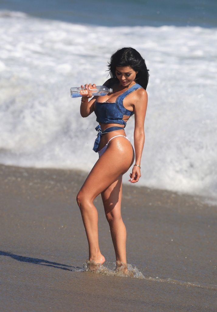 La modelo de Los Ángeles Melody Milani muestra sus curvas con un sexy bikini de mezclilla mientras realiza una sesión de fotos para 138 Water en Malibu, 30/08/2017.