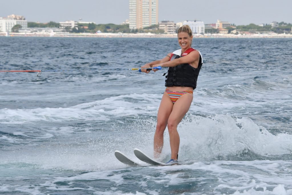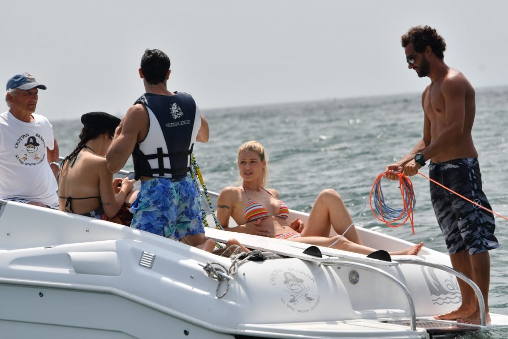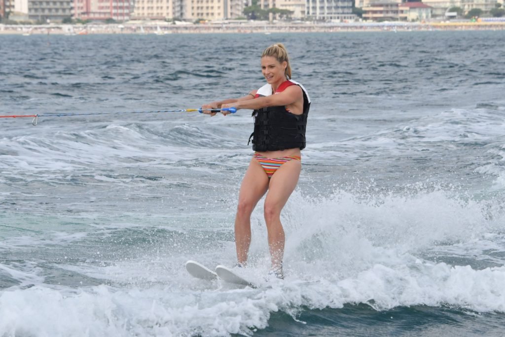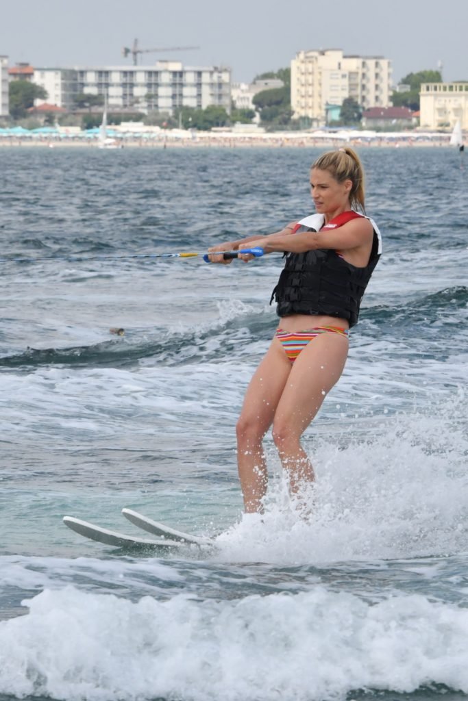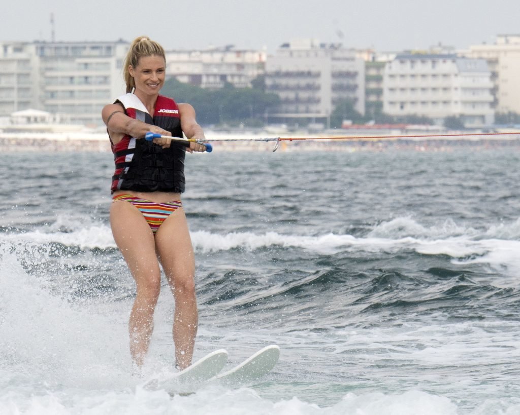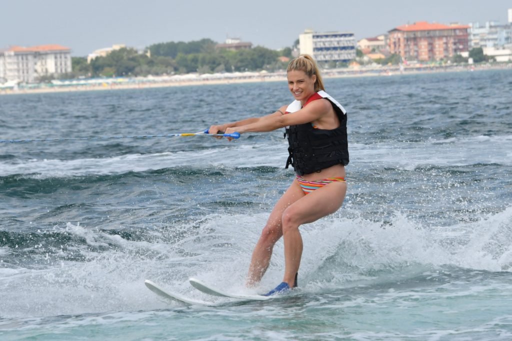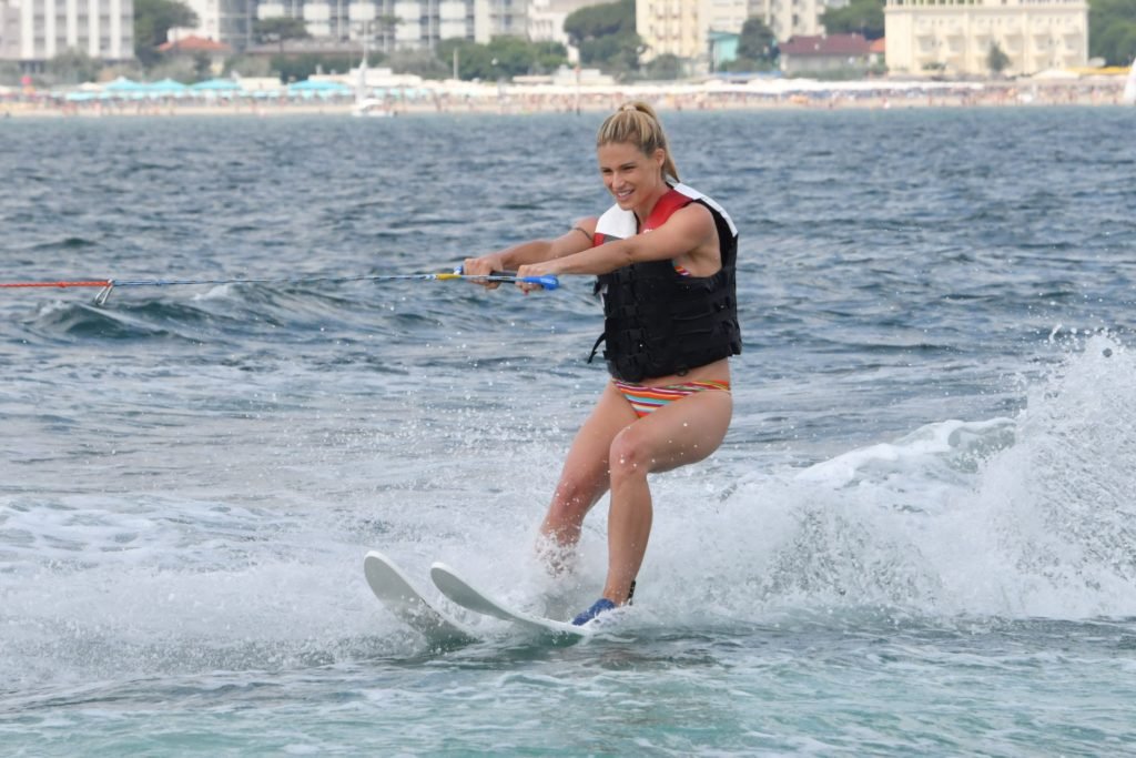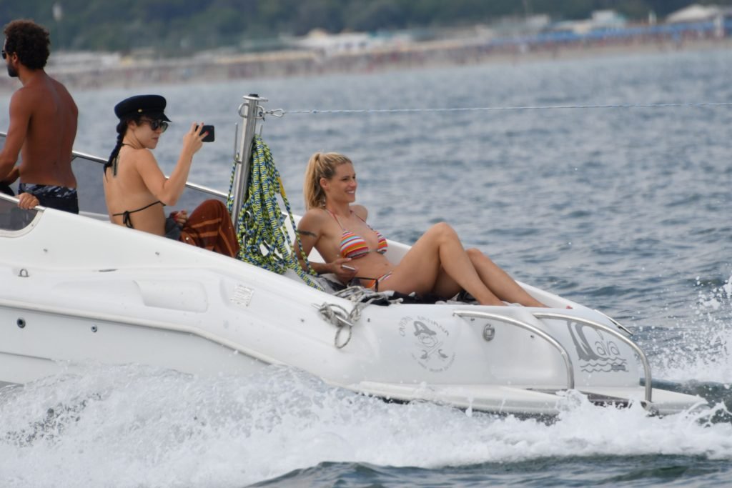 La actriz Michelle Hunziker (41) y su hija Aurora Ramazzotti (21) con su novio Goffredo practicaron esquí acuático en Milano Marittima, 07/06/2018. Michelle llevaba un bikini brillante que mostraba su cuerpo espectacular a los fotógrafos.