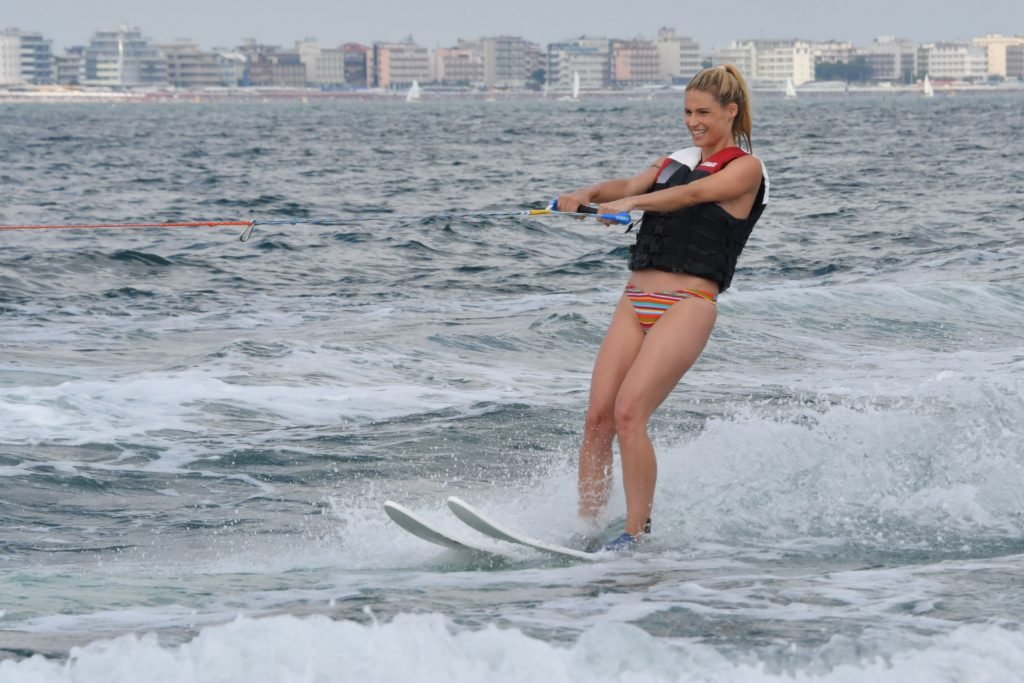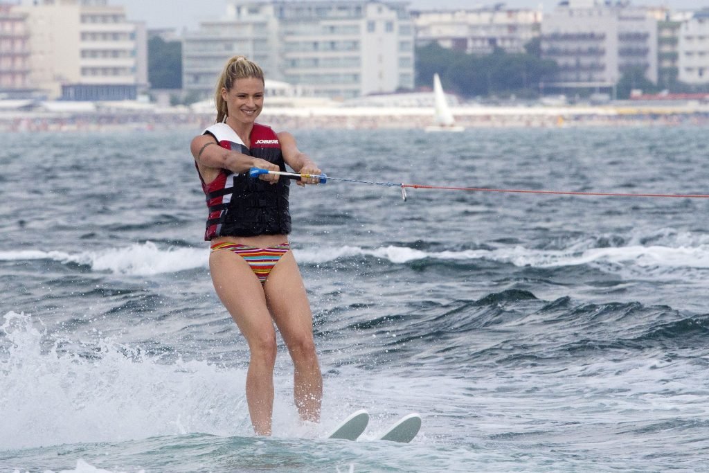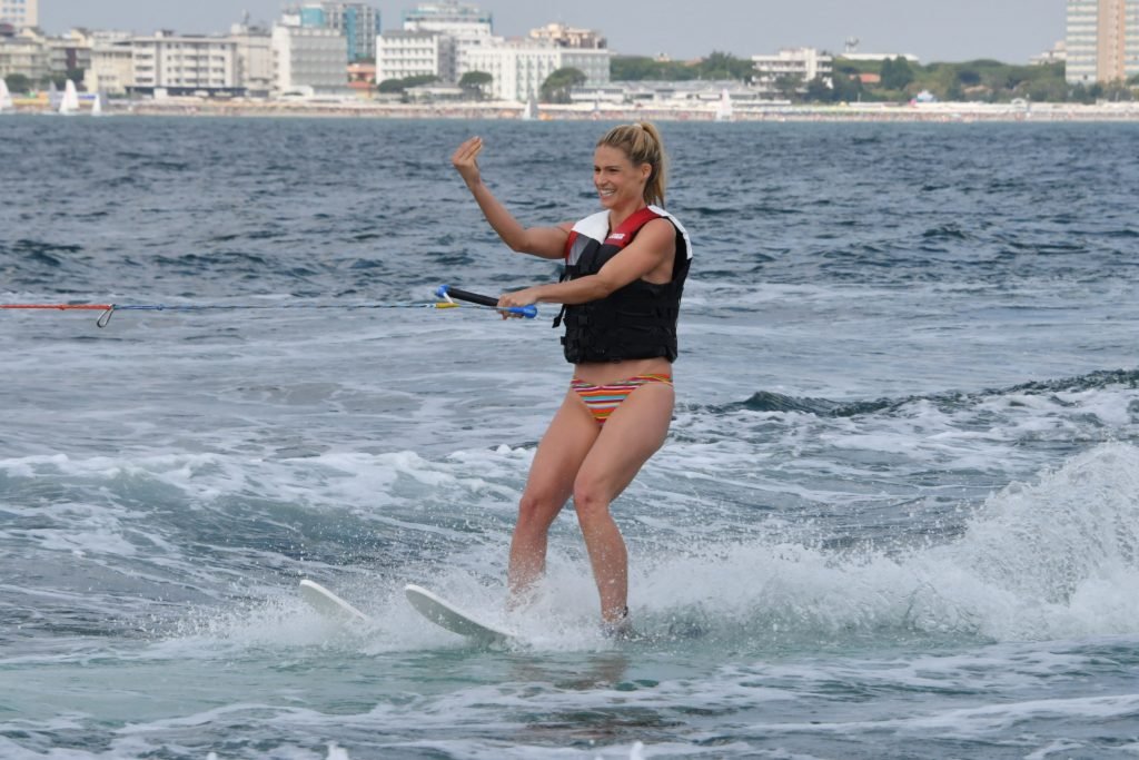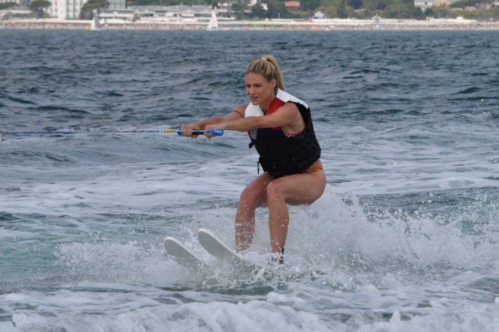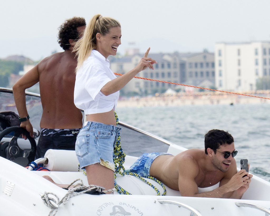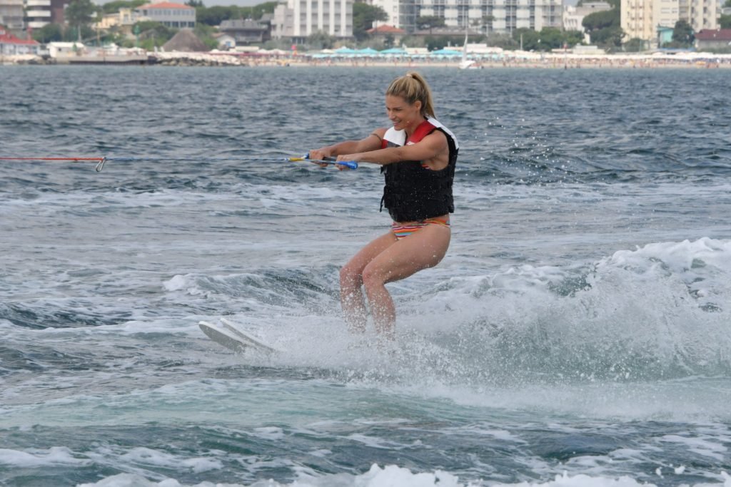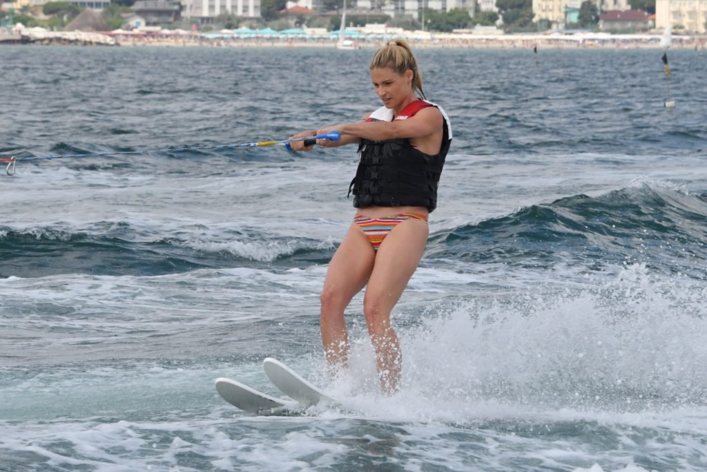 La actriz Michelle Hunziker (41) y su hija Aurora Ramazzotti (21) con su novio Goffredo practicaron esquí acuático en Milano Marittima, 07/06/2018. Michelle llevaba un bikini brillante que mostraba su cuerpo espectacular a los fotógrafos.