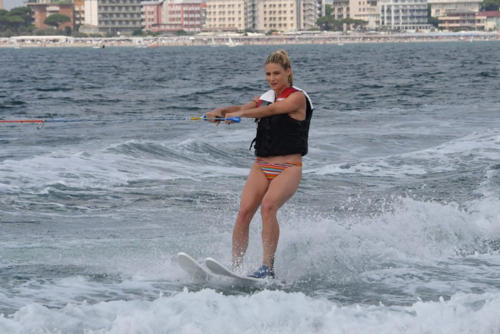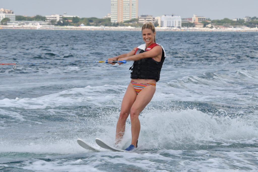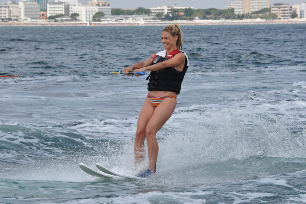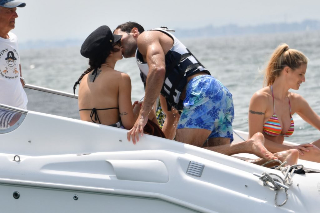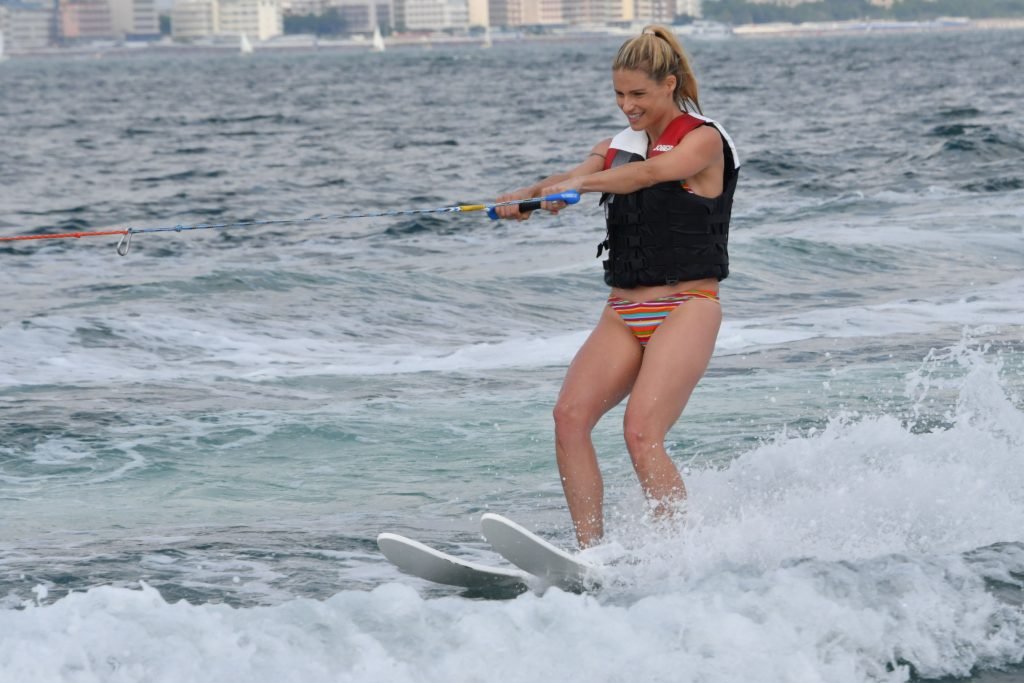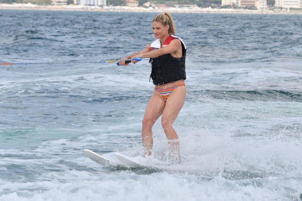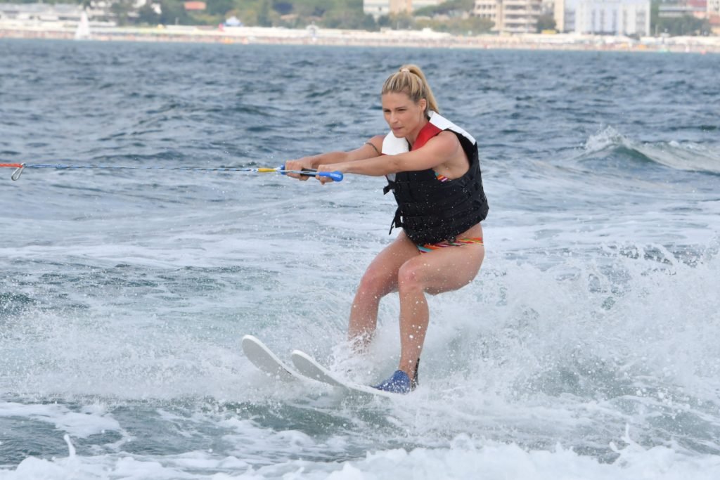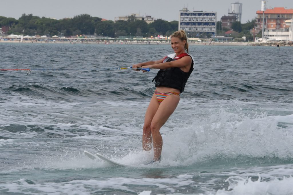 La actriz Michelle Hunziker (41) y su hija Aurora Ramazzotti (21) con su novio Goffredo practicaron esquí acuático en Milano Marittima, 07/06/2018. Michelle llevaba un bikini brillante que mostraba su cuerpo espectacular a los fotógrafos.