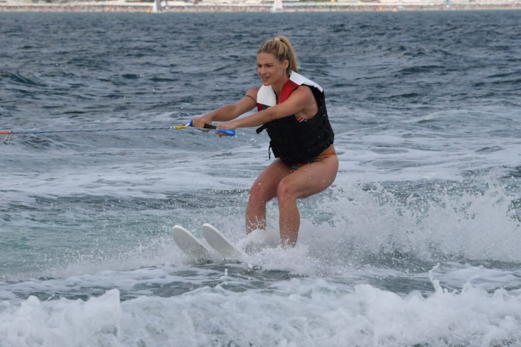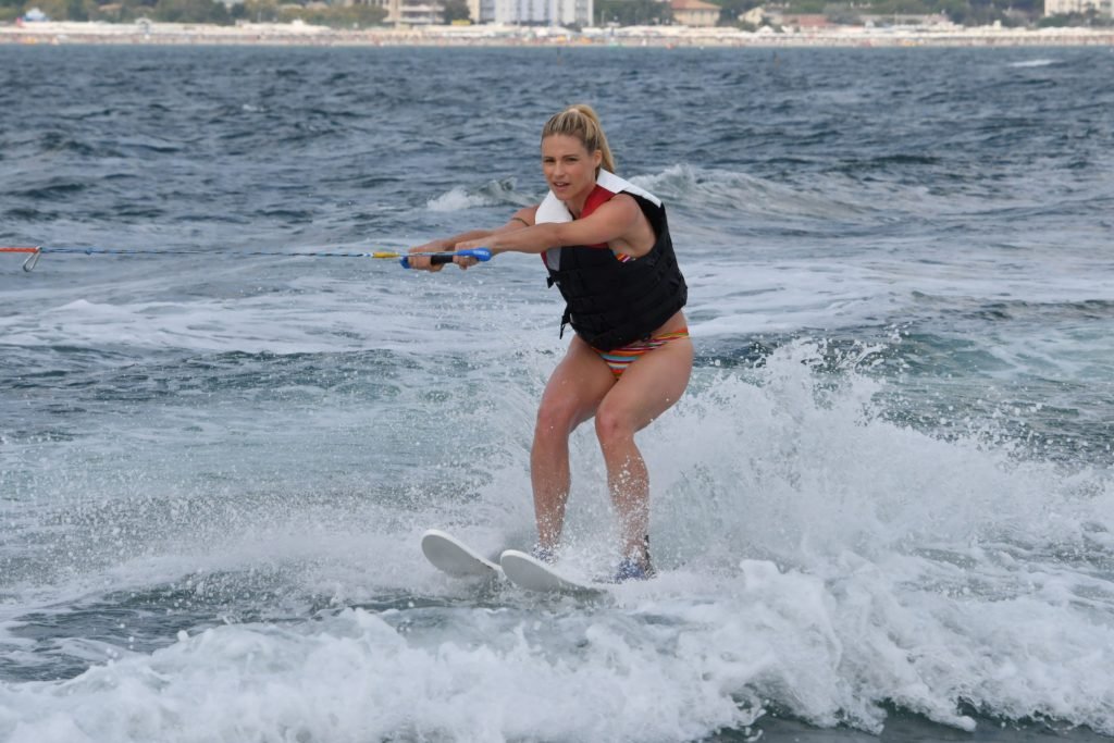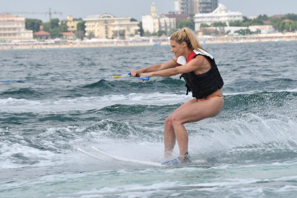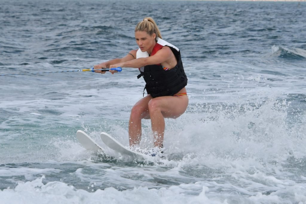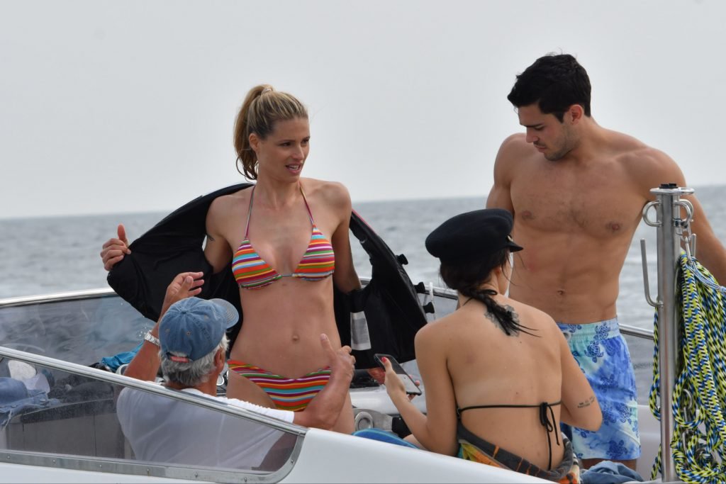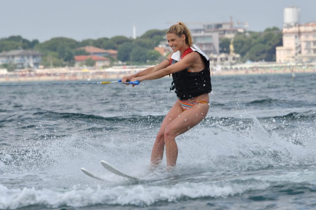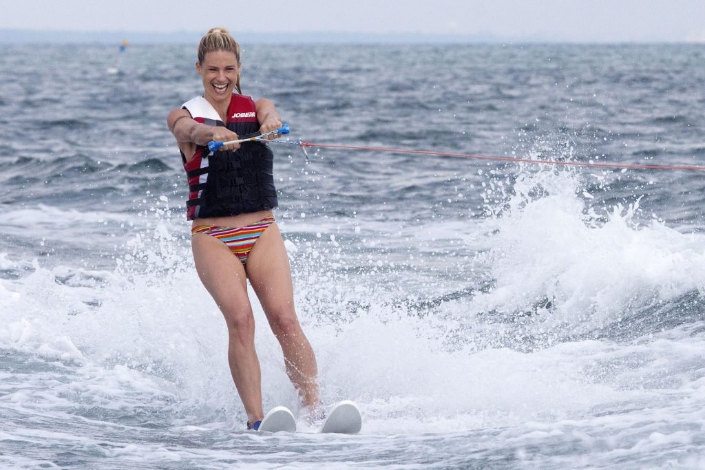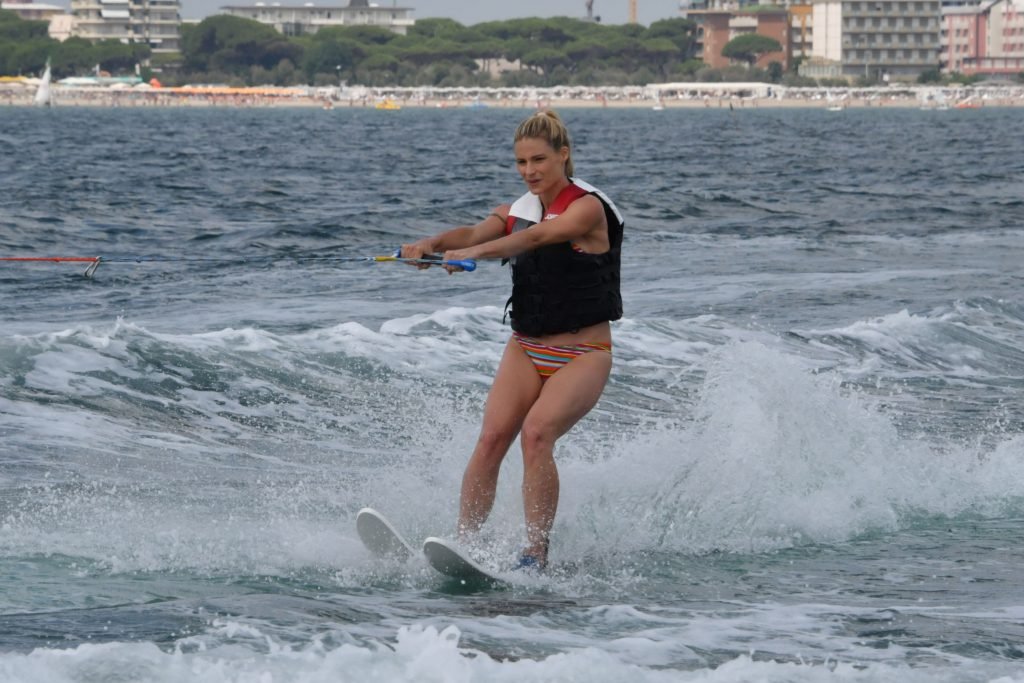 La actriz Michelle Hunziker (41) y su hija Aurora Ramazzotti (21) con su novio Goffredo practicaron esquí acuático en Milano Marittima, 07/06/2018. Michelle llevaba un bikini brillante que mostraba su cuerpo espectacular a los fotógrafos.
