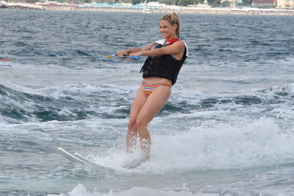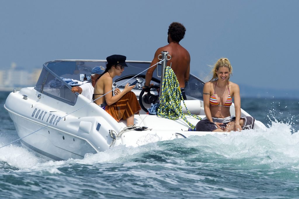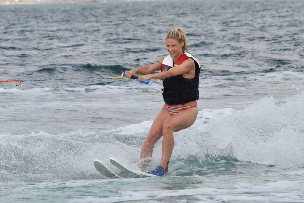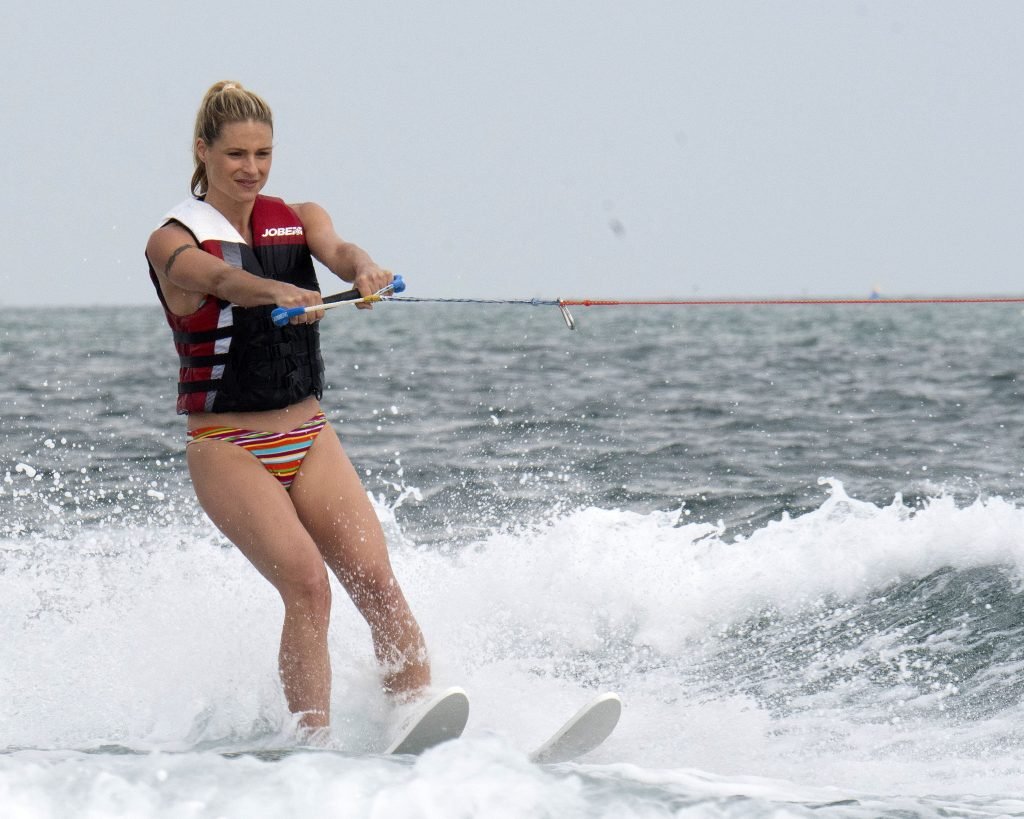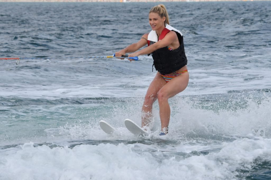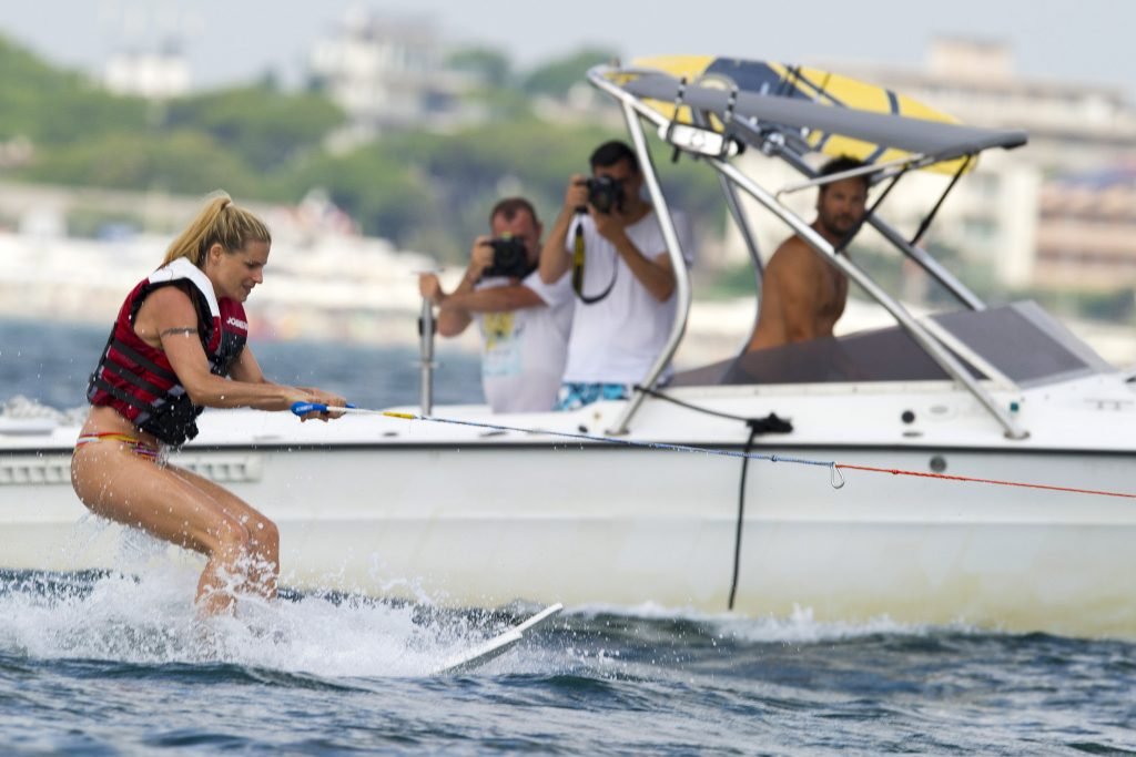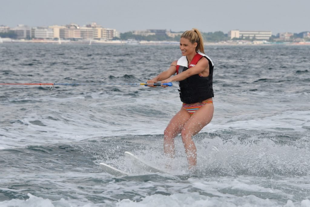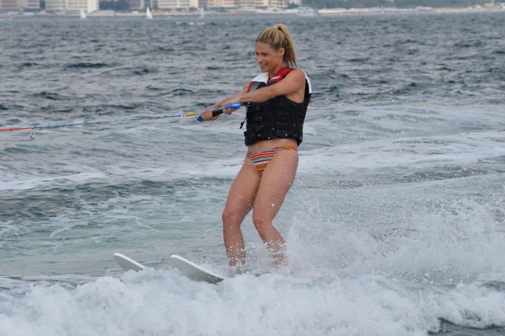 La actriz Michelle Hunziker (41) y su hija Aurora Ramazzotti (21) con su novio Goffredo practicaron esquí acuático en Milano Marittima, 07/06/2018. Michelle llevaba un bikini brillante que mostraba su cuerpo espectacular a los fotógrafos.