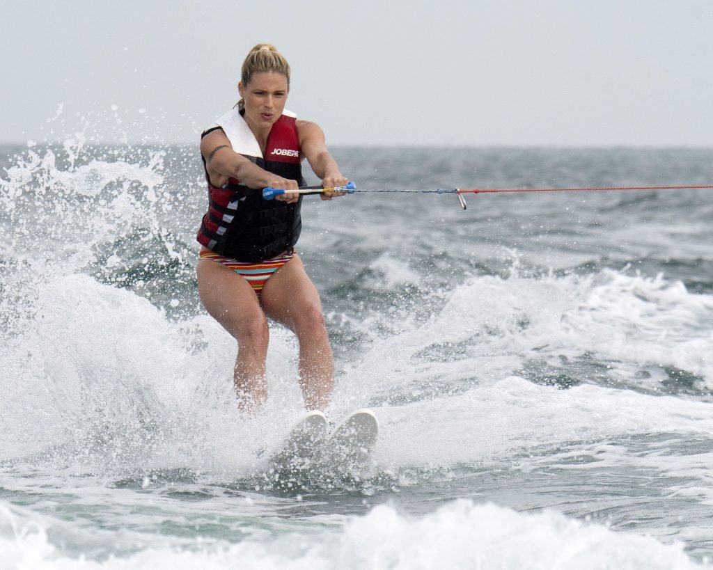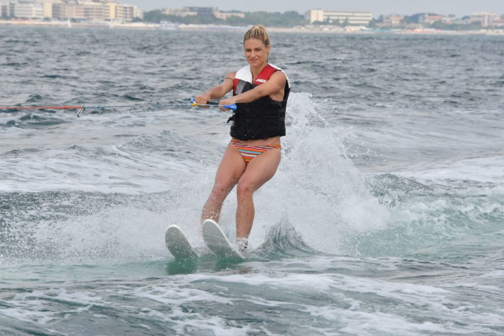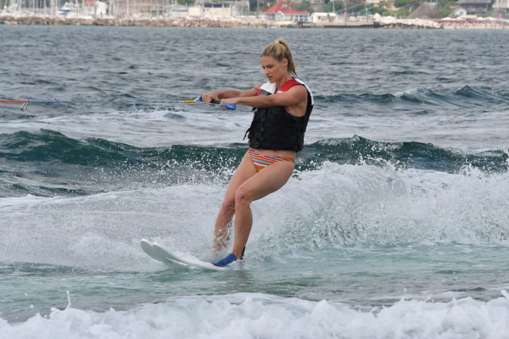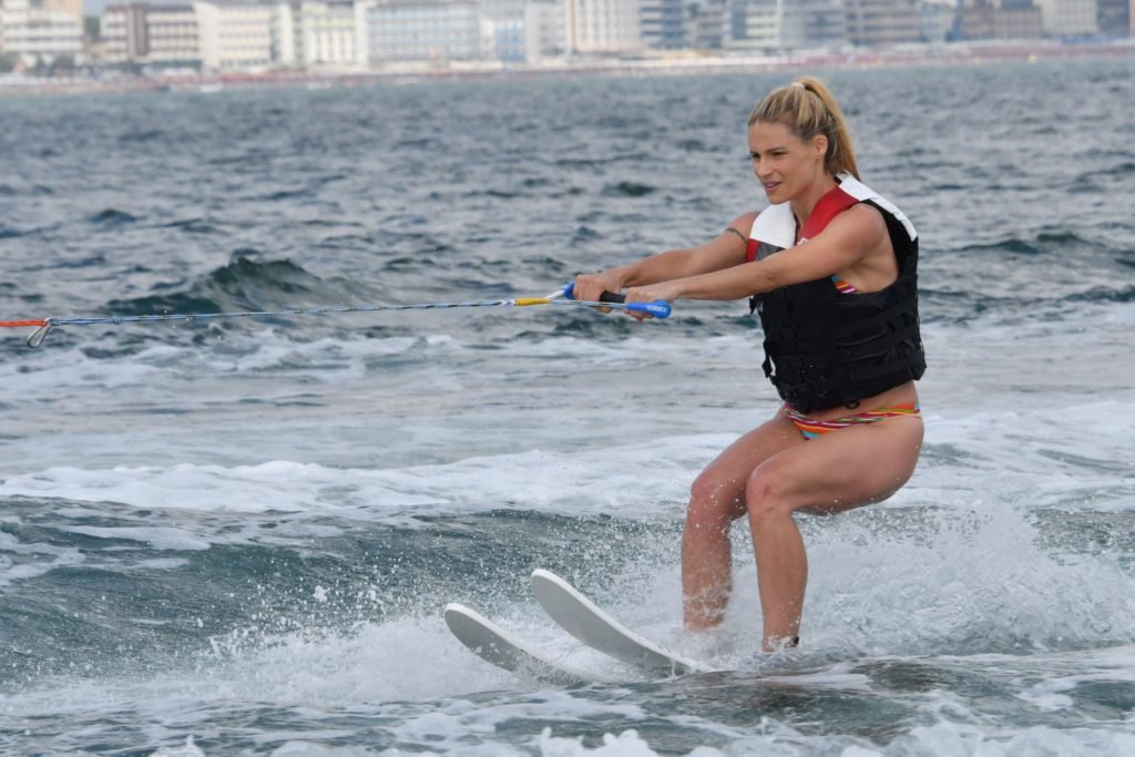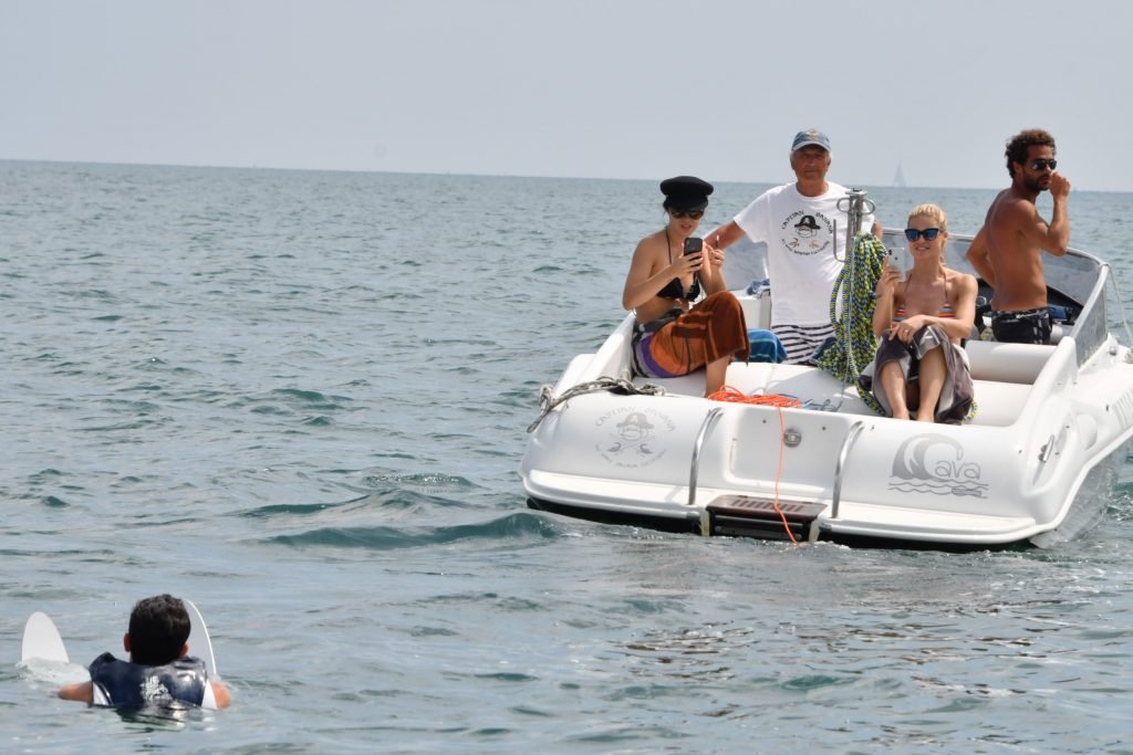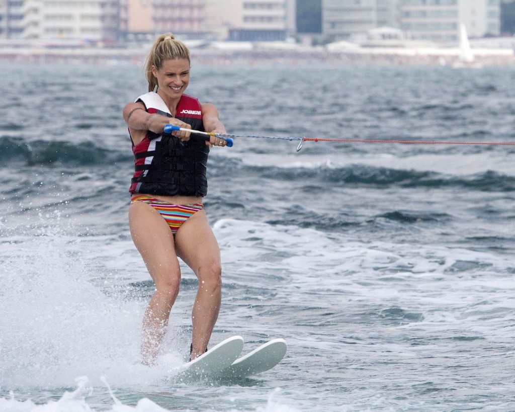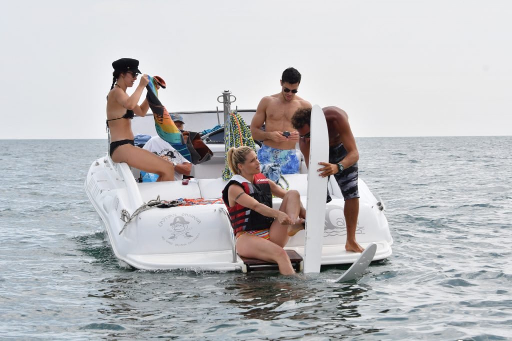 La actriz Michelle Hunziker (41) y su hija Aurora Ramazzotti (21) con su novio Goffredo practicaron esquí acuático en Milano Marittima, 07/06/2018. Michelle llevaba un bikini brillante que mostraba su cuerpo espectacular a los fotógrafos.