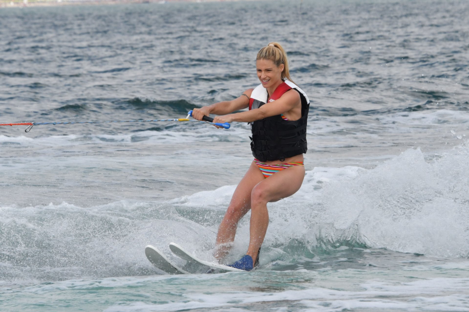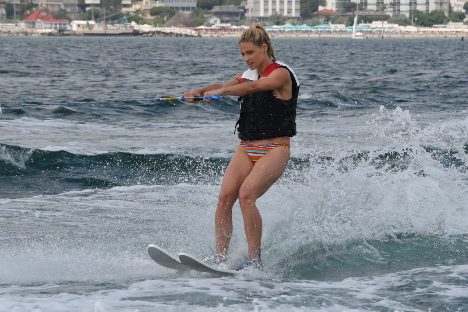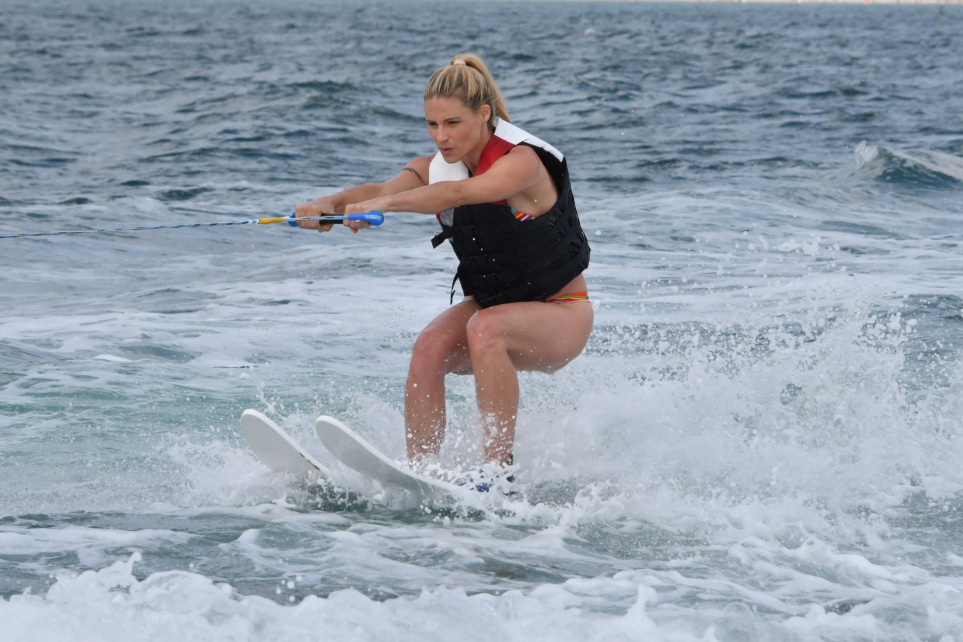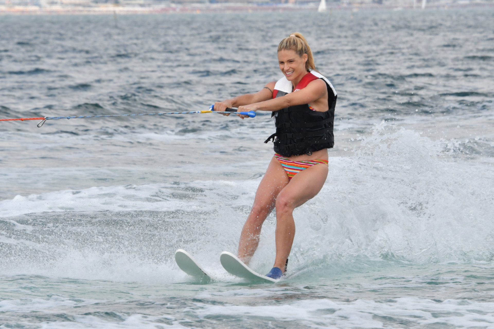 La actriz Michelle Hunziker (41) y su hija Aurora Ramazzotti (21) con su novio Goffredo practicaron esquí acuático en Milano Marittima, 07/06/2018. Michelle llevaba un bikini brillante que mostraba su cuerpo espectacular a los fotógrafos.
