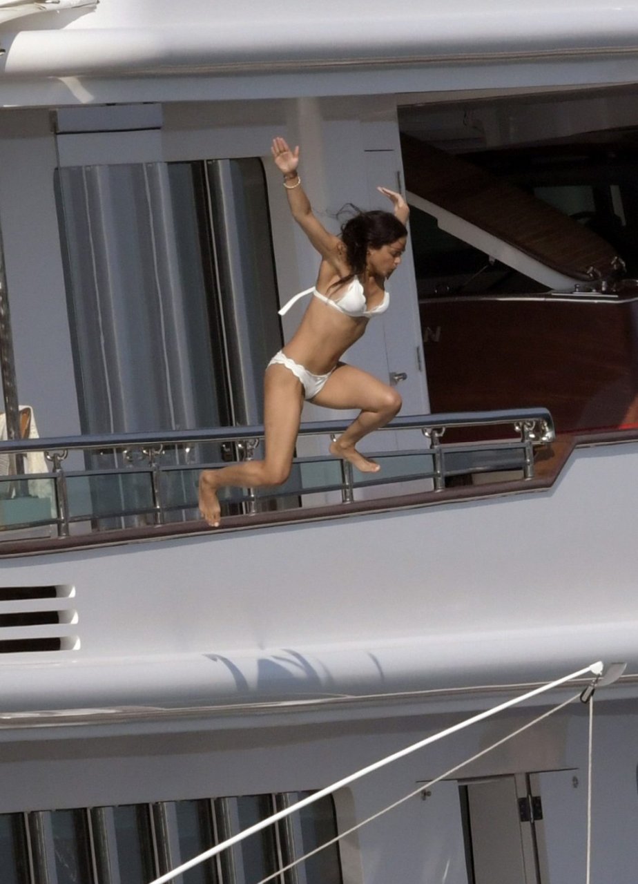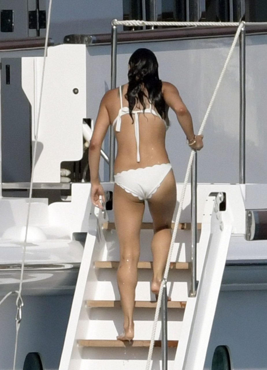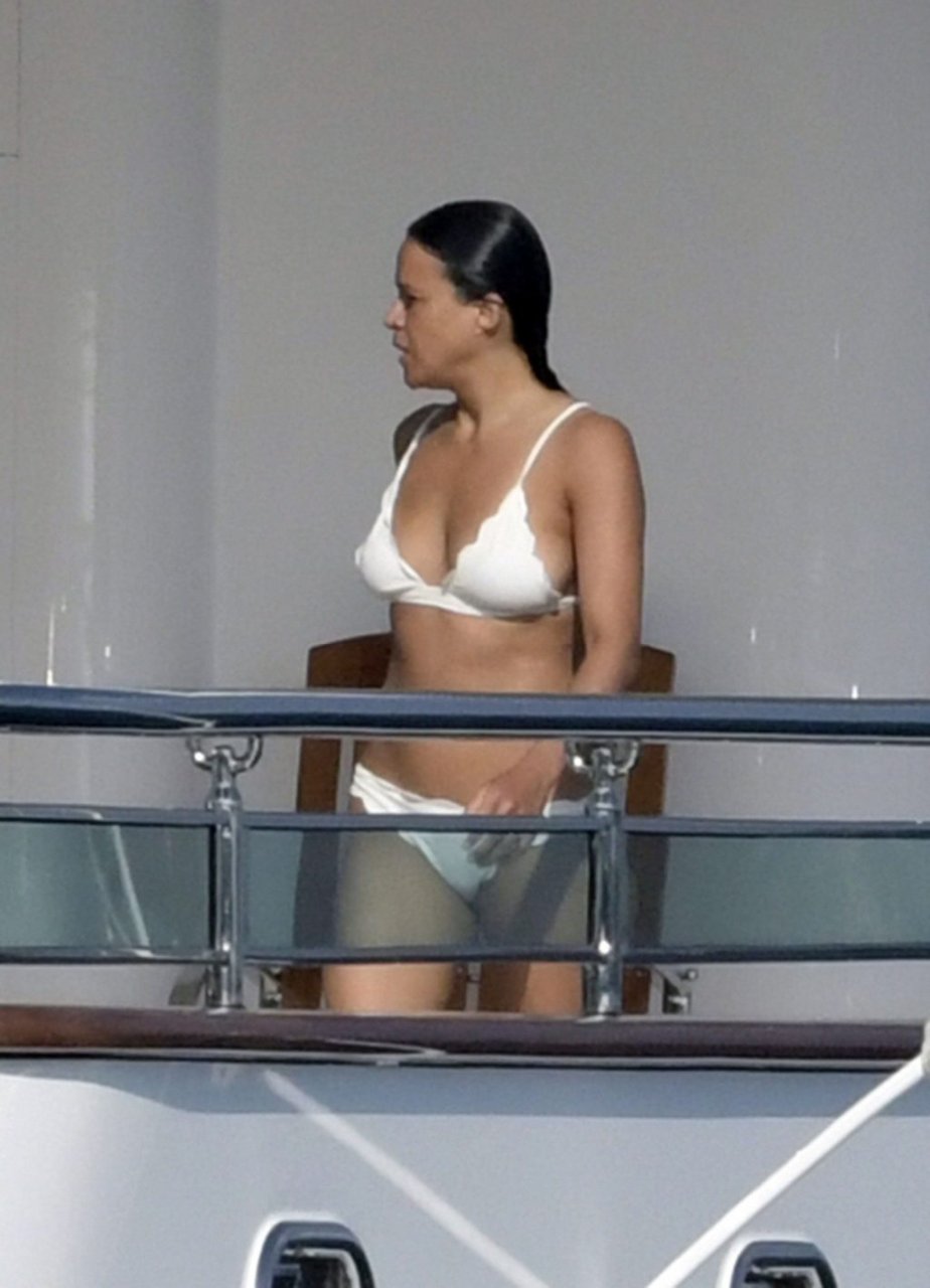 La actriz bisexual Michelle Rodriguez (40) fue vista usando un bikini blanco en un yate en Porto Cervo, Italia, 10/08/2018.