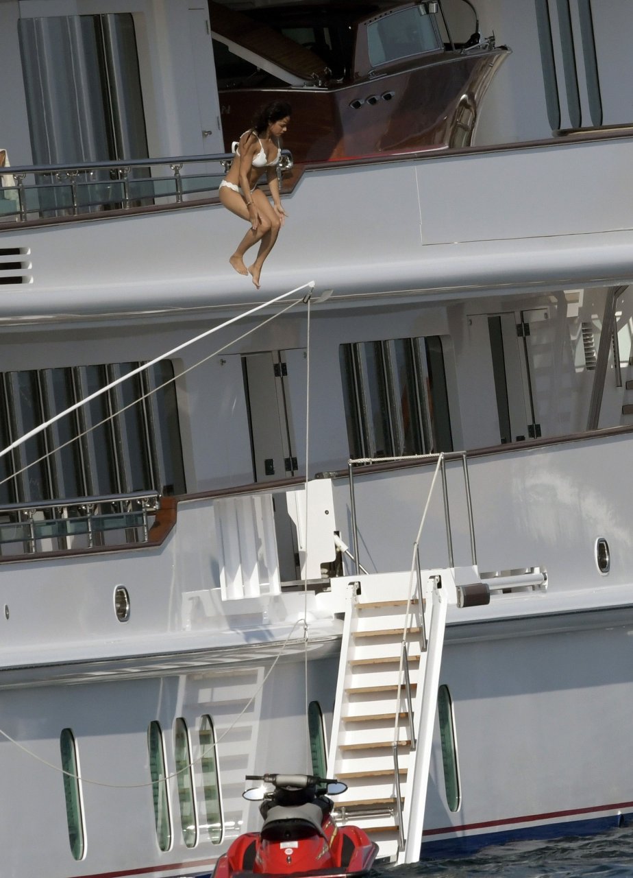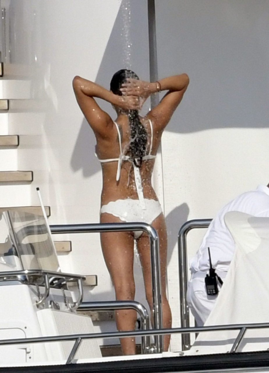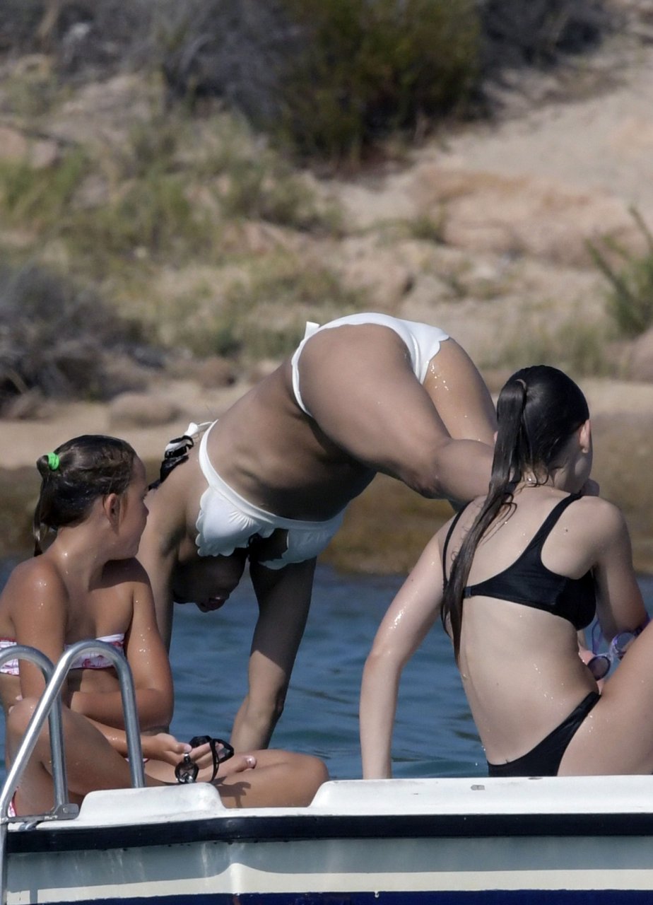 La actriz bisexual Michelle Rodriguez (40) fue vista usando un bikini blanco en un yate en Porto Cervo, Italia, 10/08/2018.