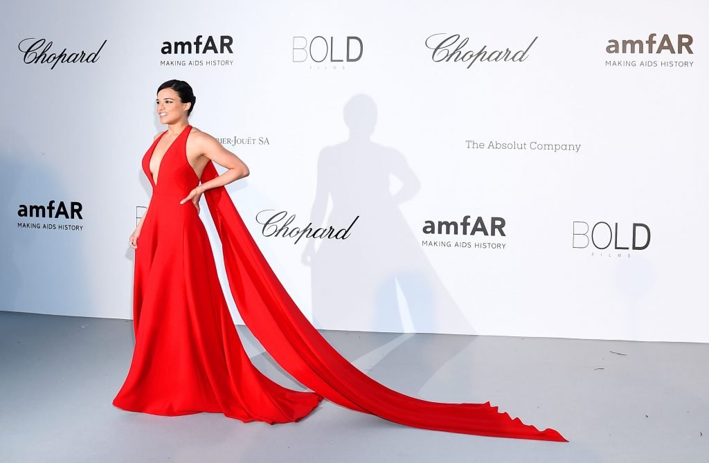 Michelle Rodriguez asiste a la 25ª Gala de Cine contra el SIDA de amfAR durante el 71º Festival de Cine de Cannes en Cannes, 17/05/2018. La actriz de 39 años llevaba un vestido rojo sin sujetador.