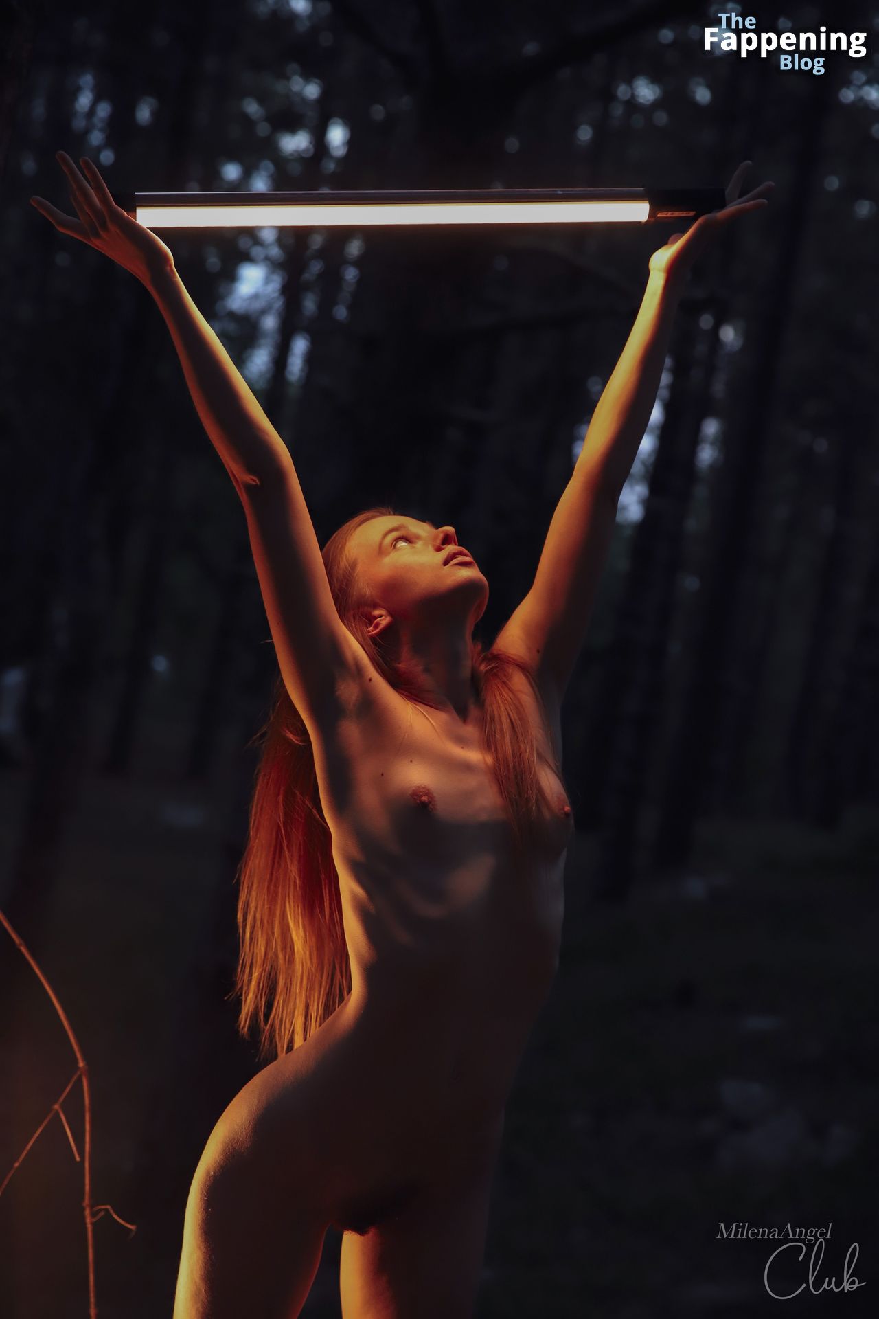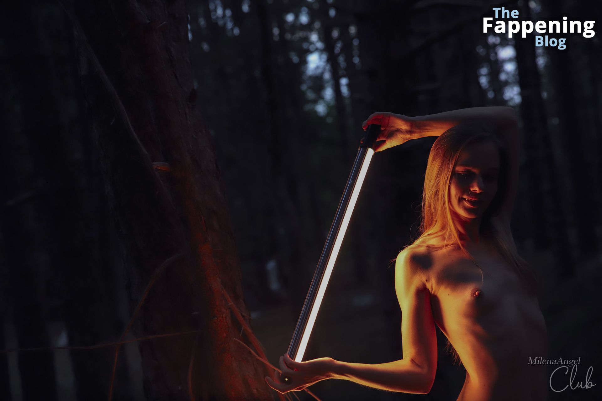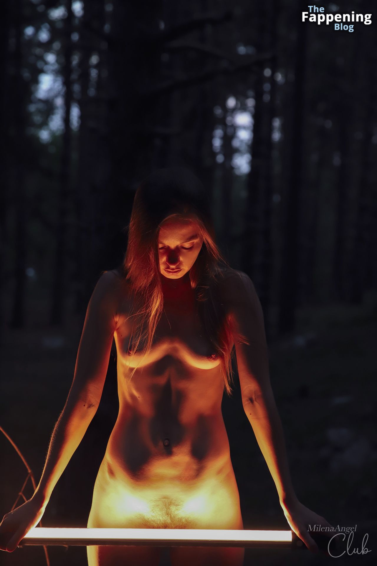 ¡Mira estas increíbles fotos de la famosa modelo adulta, Milena Angel, haciendo una sesión salvaje desnuda en el bosque! Estas imágenes están increíbles, con una iluminación que da una vibra de fogata en el bosque nocturno.