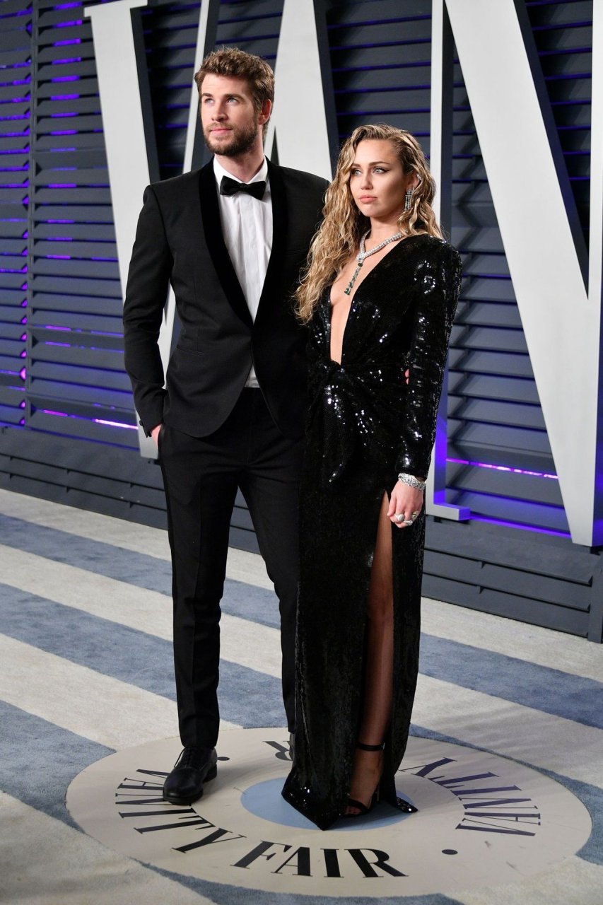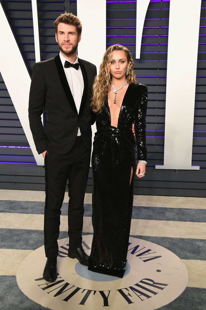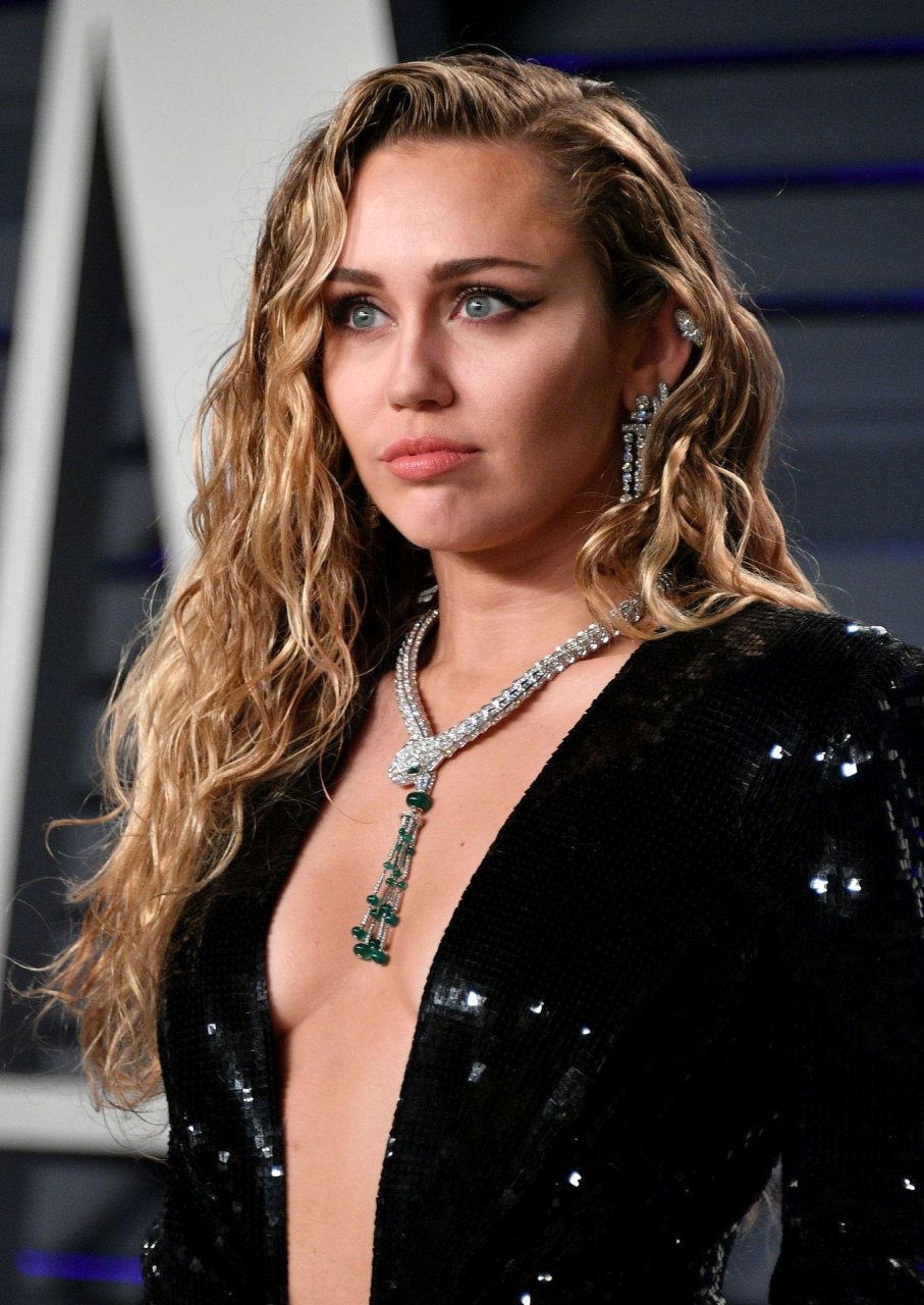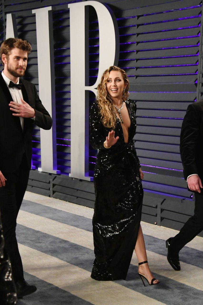 Miley Cyrus muestra su escote en la Fiesta de los Oscar Vanity Fair 2019 en Beverly Hills, 24/02/2019. La cantante apareció en la alfombra roja con su amado, Liam Hemsworth.
