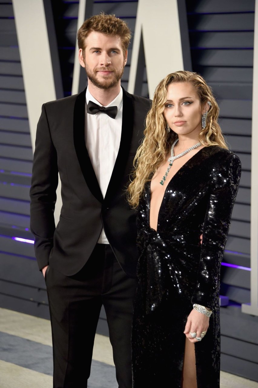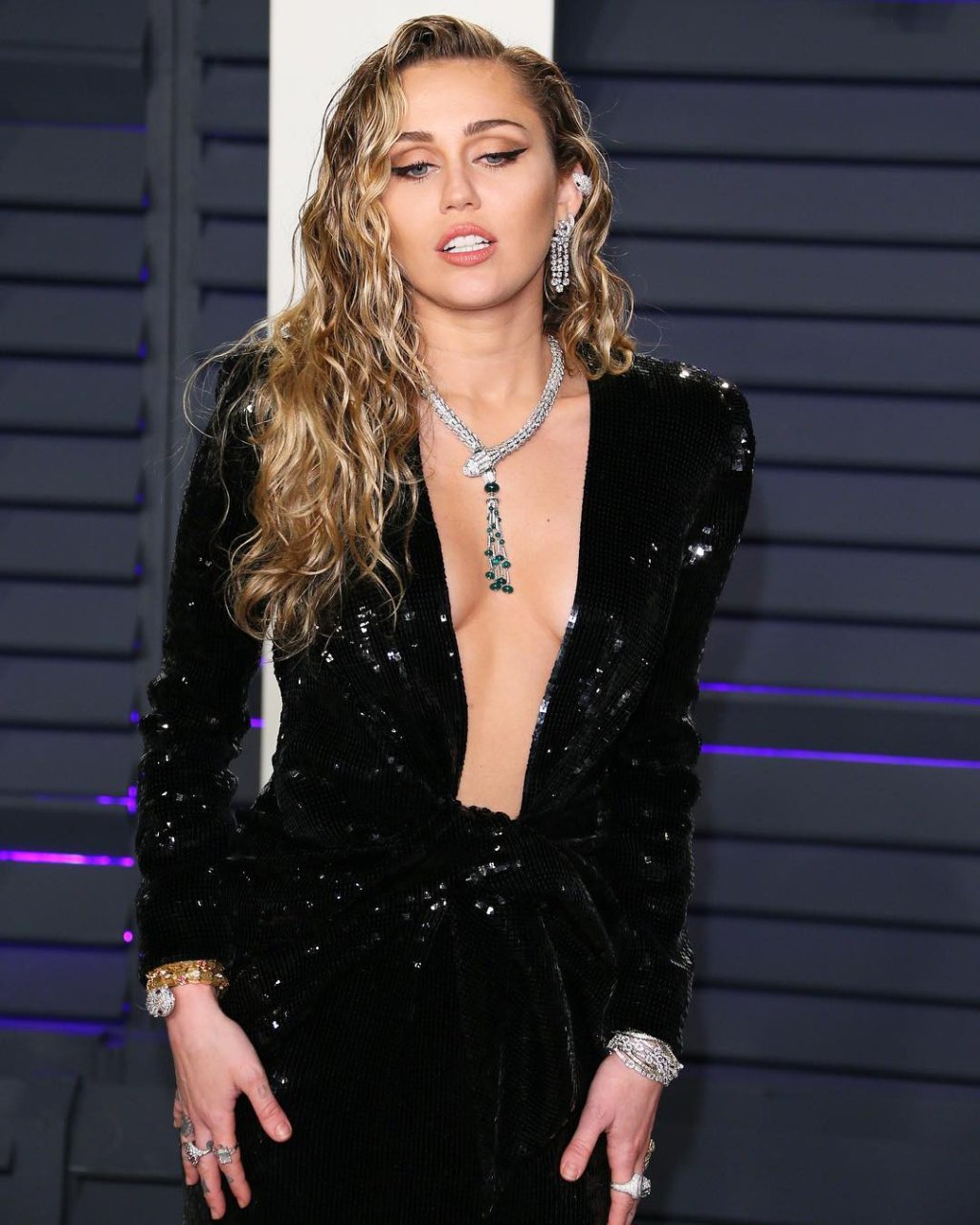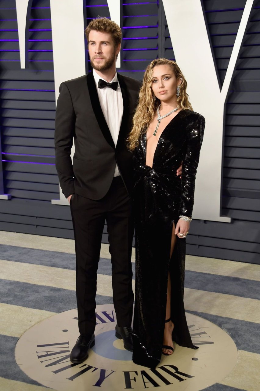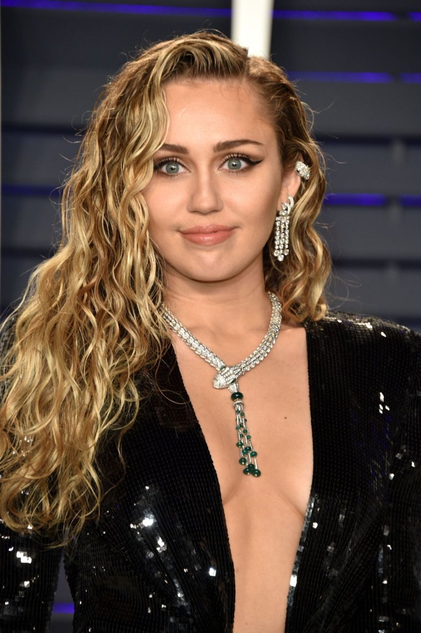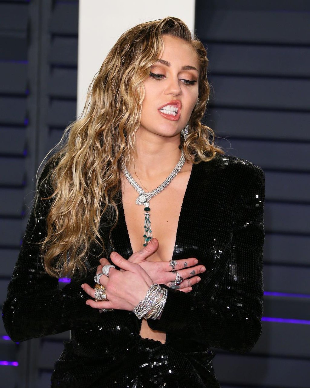 Miley Cyrus muestra su escote en la Fiesta de los Oscar Vanity Fair 2019 en Beverly Hills, 24/02/2019. La cantante apareció en la alfombra roja con su amado, Liam Hemsworth.