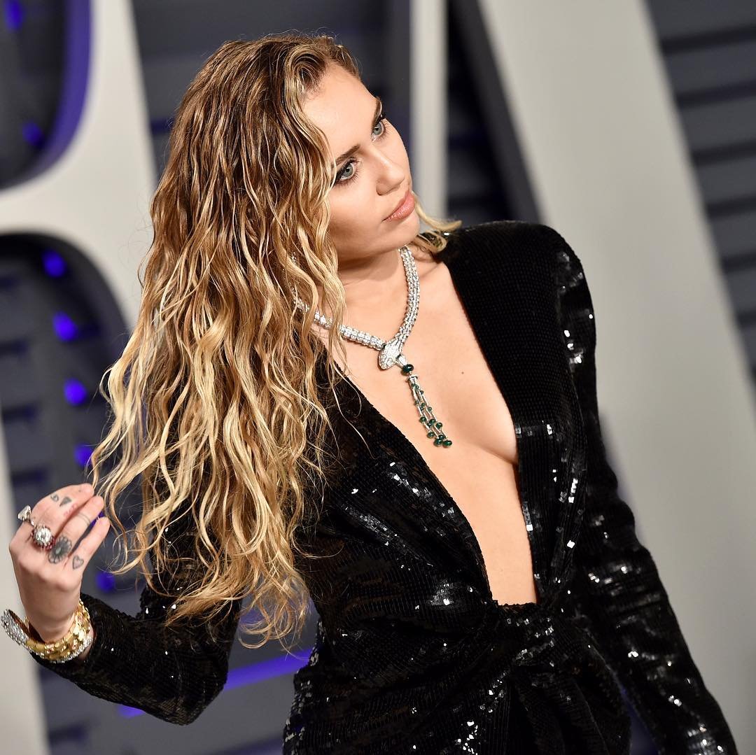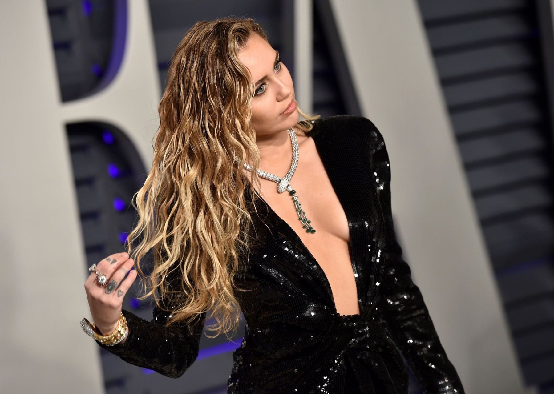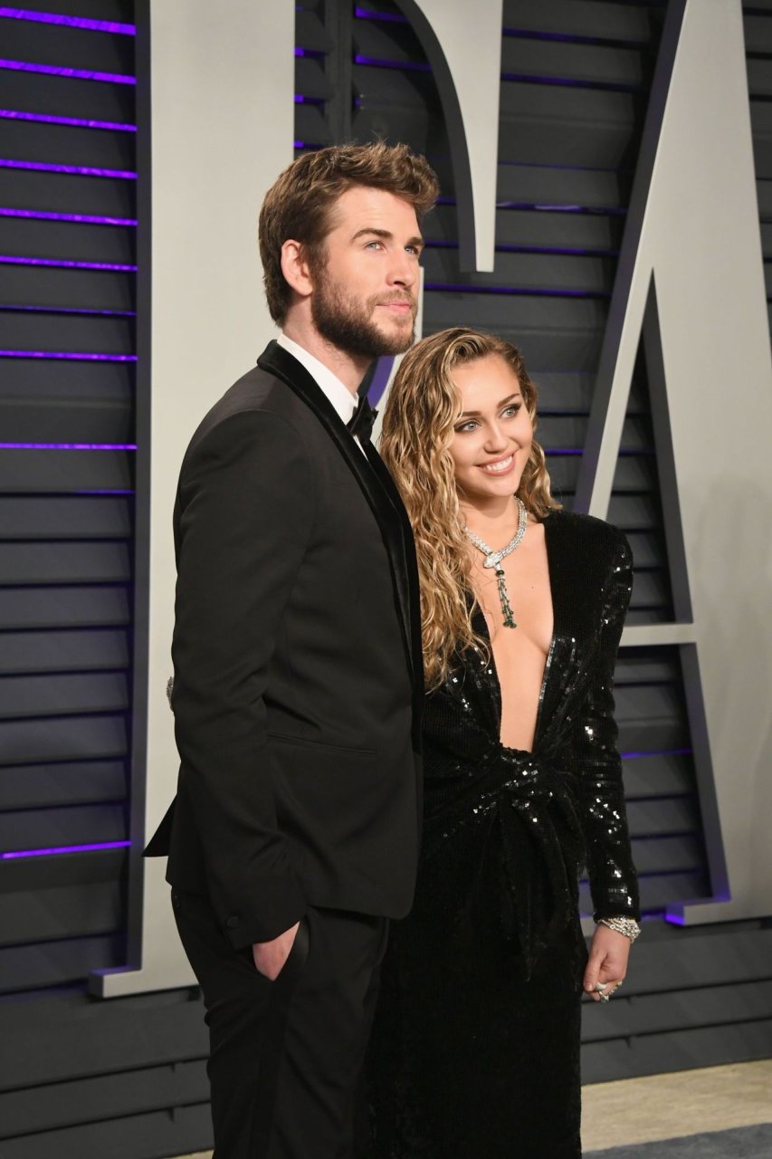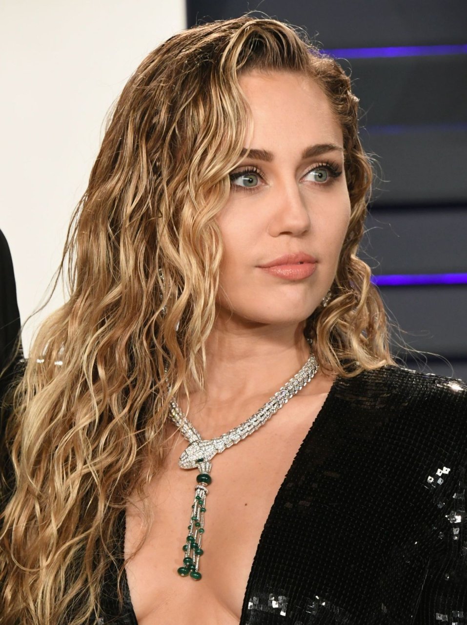 Miley Cyrus muestra su escote en la Fiesta de los Oscar Vanity Fair 2019 en Beverly Hills, 24/02/2019. La cantante apareció en la alfombra roja con su amado, Liam Hemsworth.