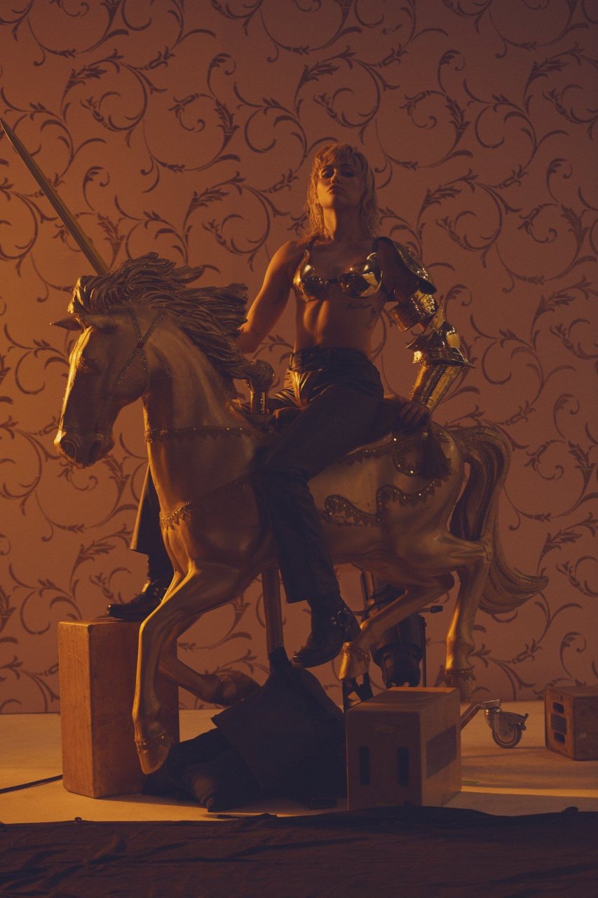 Las palabras ‘TOUGH TITTIES’ parpadean en la pantalla mientras Miley se acerca a la hermosa modelo calva Vendela, que lleva un conjunto de kinkwear de plástico transparente y color nude con un collar de perro a juego. La modelo trans y con discapacidad Aaron Phillips aparece en su silla de ruedas eléctrica, luciendo un look feroz con piel blanca y un bob rubio. El modelo trans Casil McArthur muestra su físico tonificado, vistiendo solo algunas cadenas plateadas y un par de pantalones a rayas verdes, antes de untarse lápiz labial en la cara. La bailarina y coreógrafa Paige Fralix aparece luego sin camiseta con jeans, una corona floral y las palabras ‘I AM FREE’ pintadas en el torso. Miley se acurruca con su madre Tish en un sofá mientras ambas lucen conjuntos Chanel a juego.