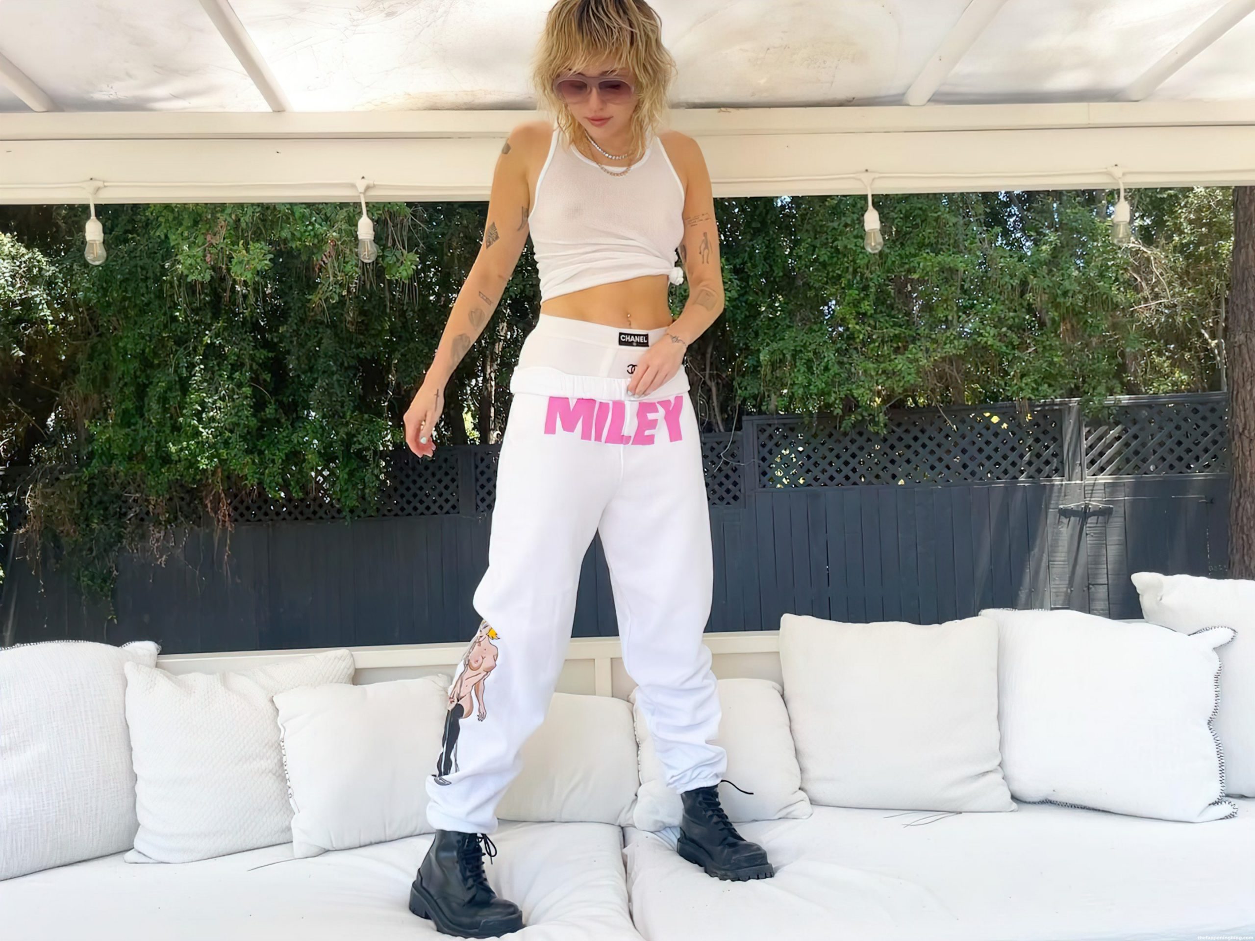 La estrella de The Fappening Miley Cyrus realiza una nueva sesión de fotos promocional para sus productos en redes sociales, posando con una camiseta blanca transparente sin sujetador (julio de 2021).