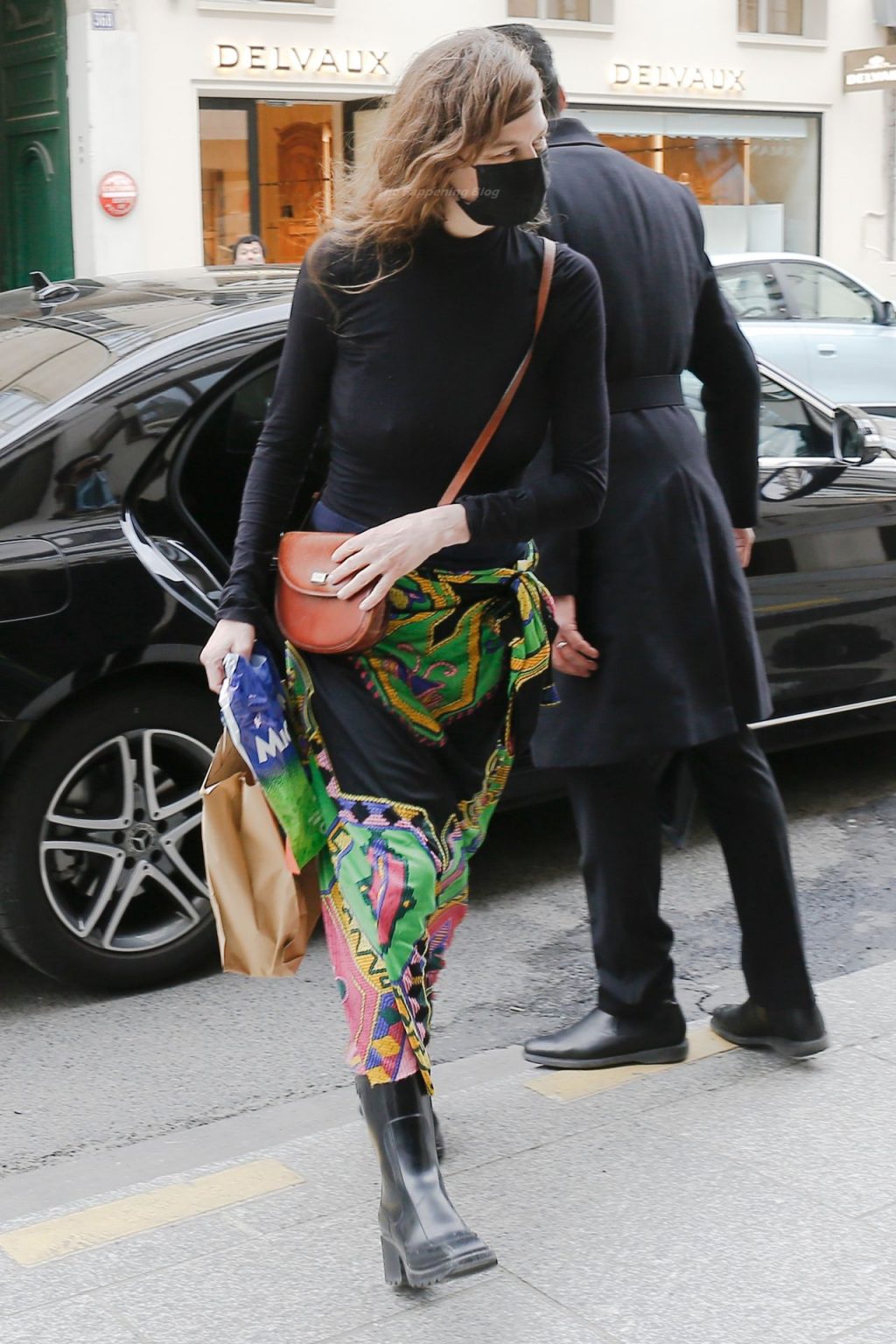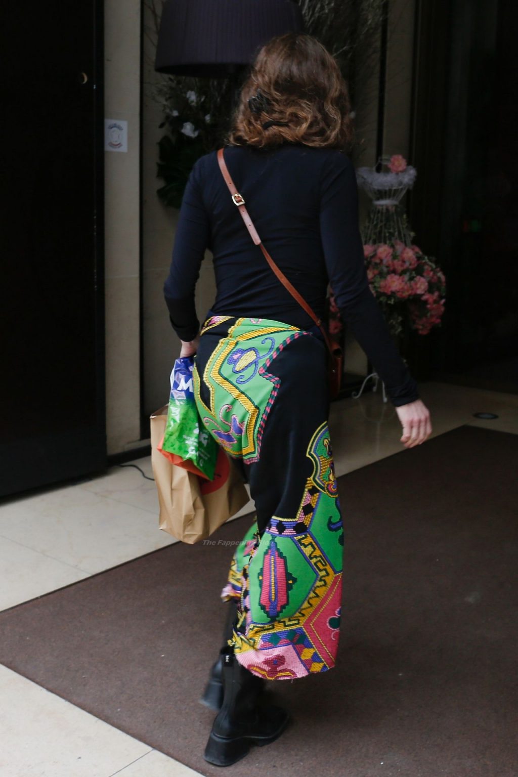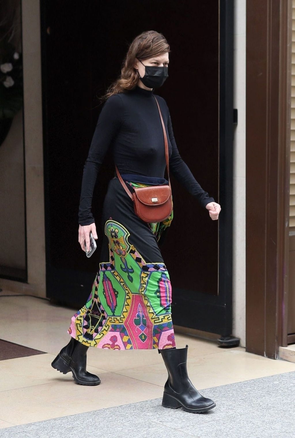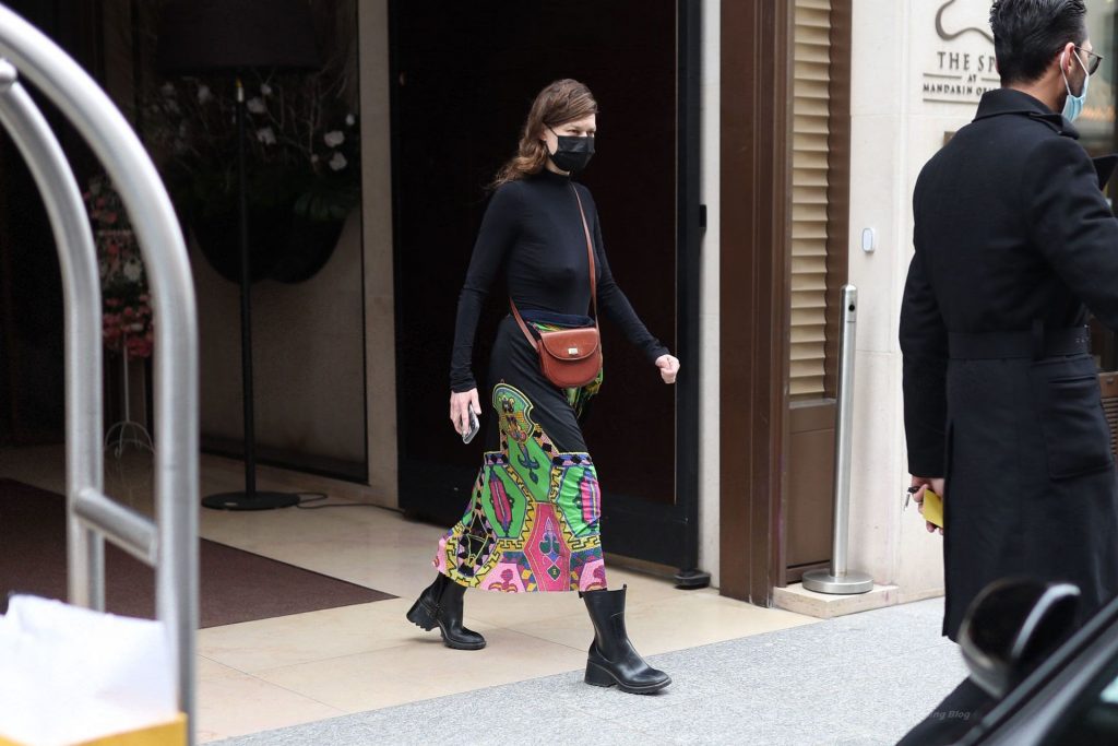 La actriz estadounidense Milla Jovovich muestra estilo al salir del Hotel Mandarin. Llevaba puesta su mascarilla y una falda multicolor con botas negras durante la semana de la moda en París, 05/03/2021.