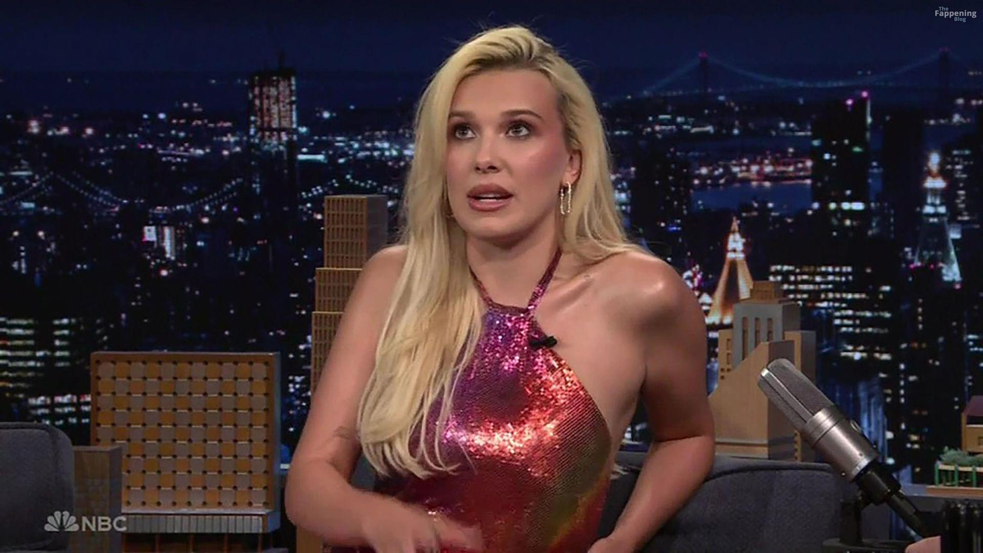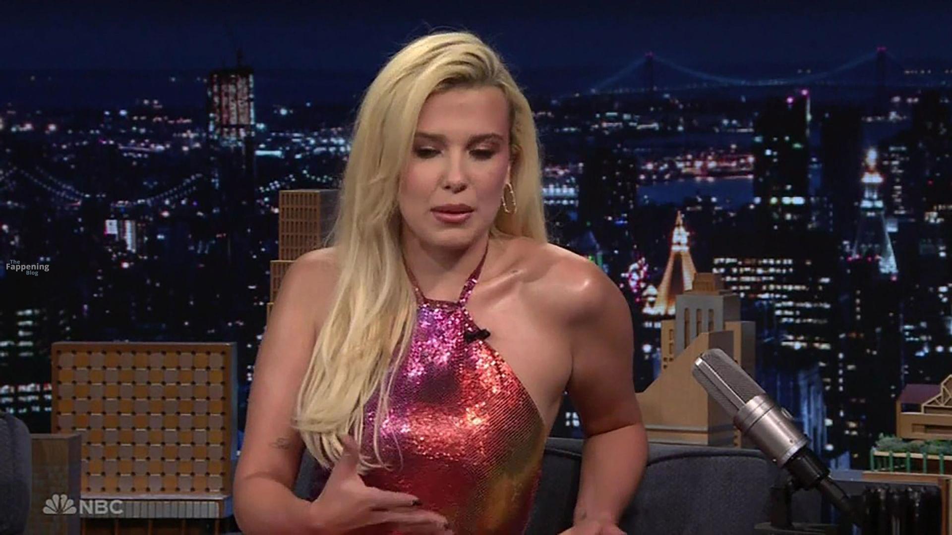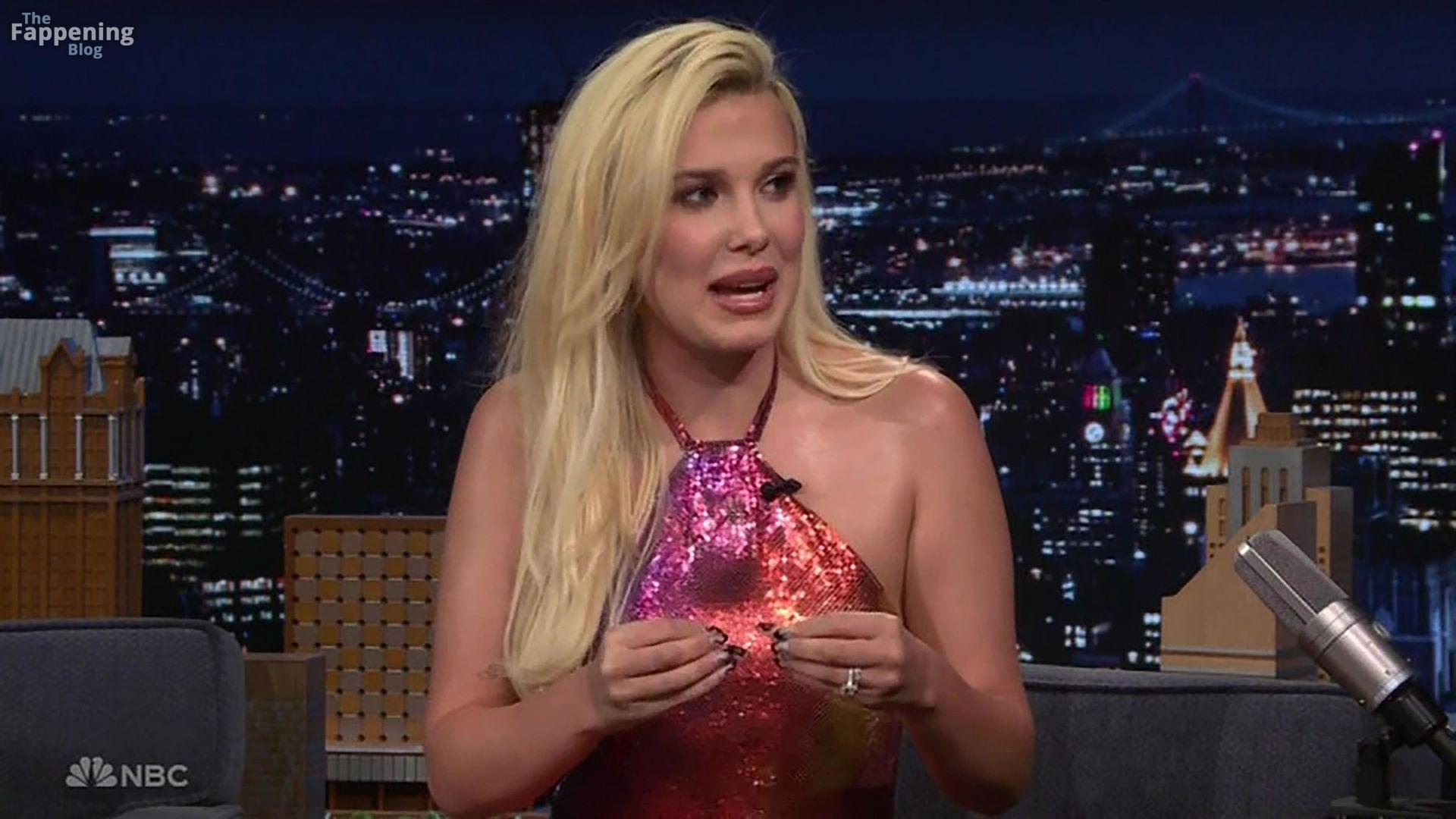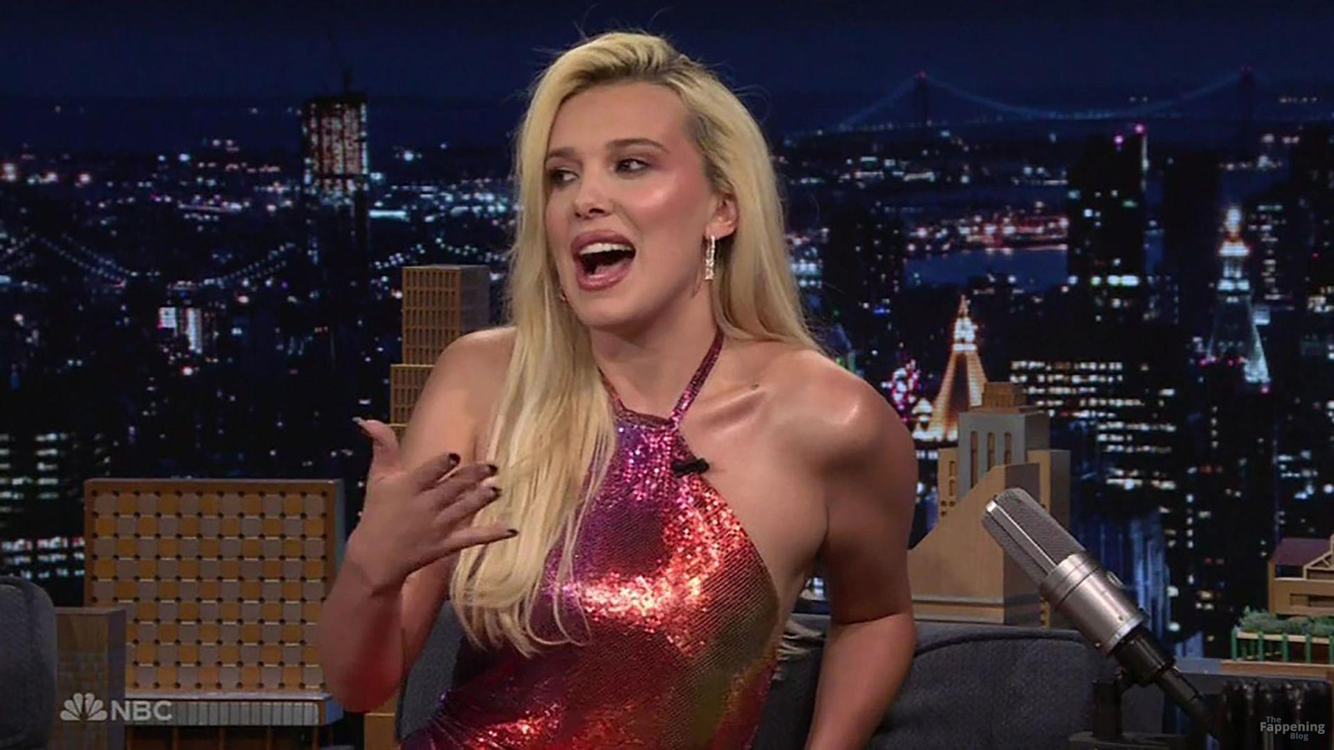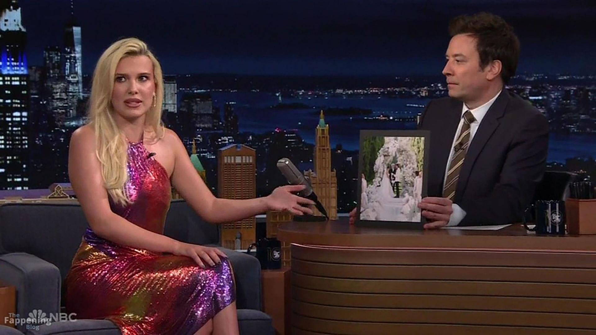 Millie Bobby Brown aparece luciendo sexy y sin sujetador, mostrando sus pezones a través de un vestido metálico en “The Tonight Show Starring Jimmy Fallon”. La actriz estuvo en el programa nocturno estadounidense para promocionar su nueva película “Electric State”, donde compartió recuerdos de su boda con Jake Bongiovi el año pasado.