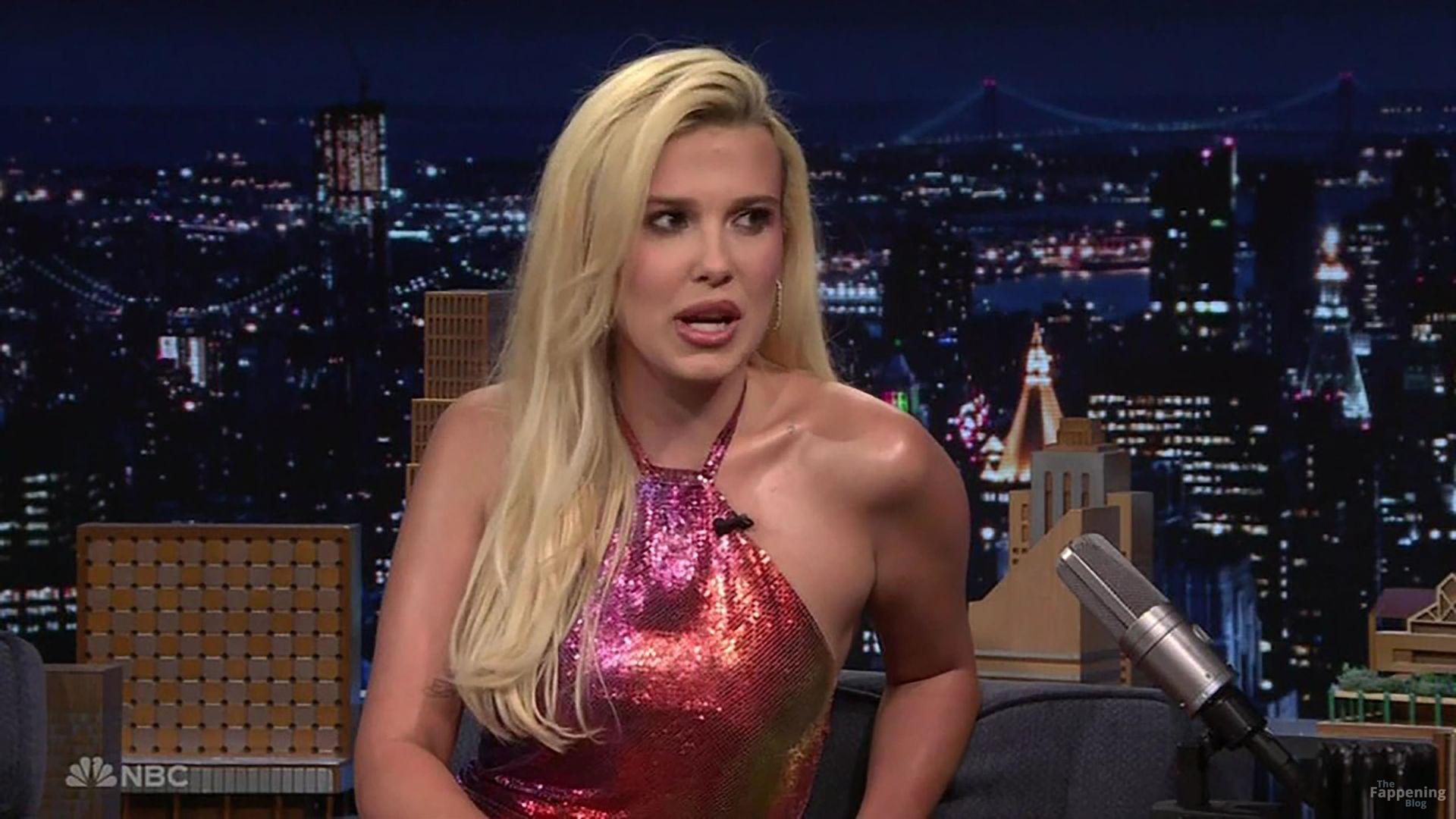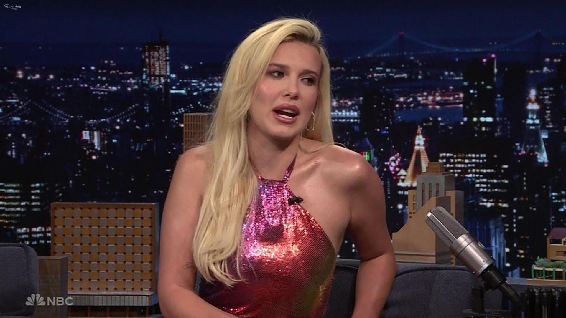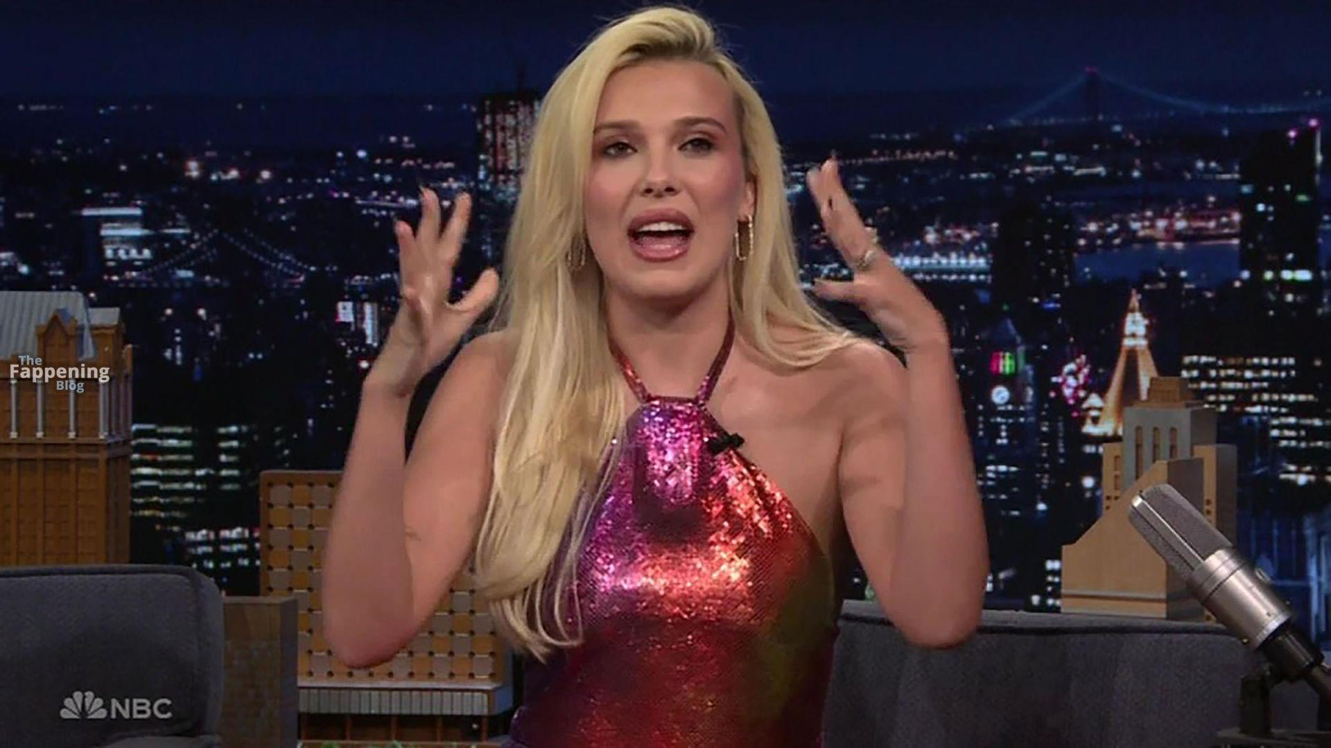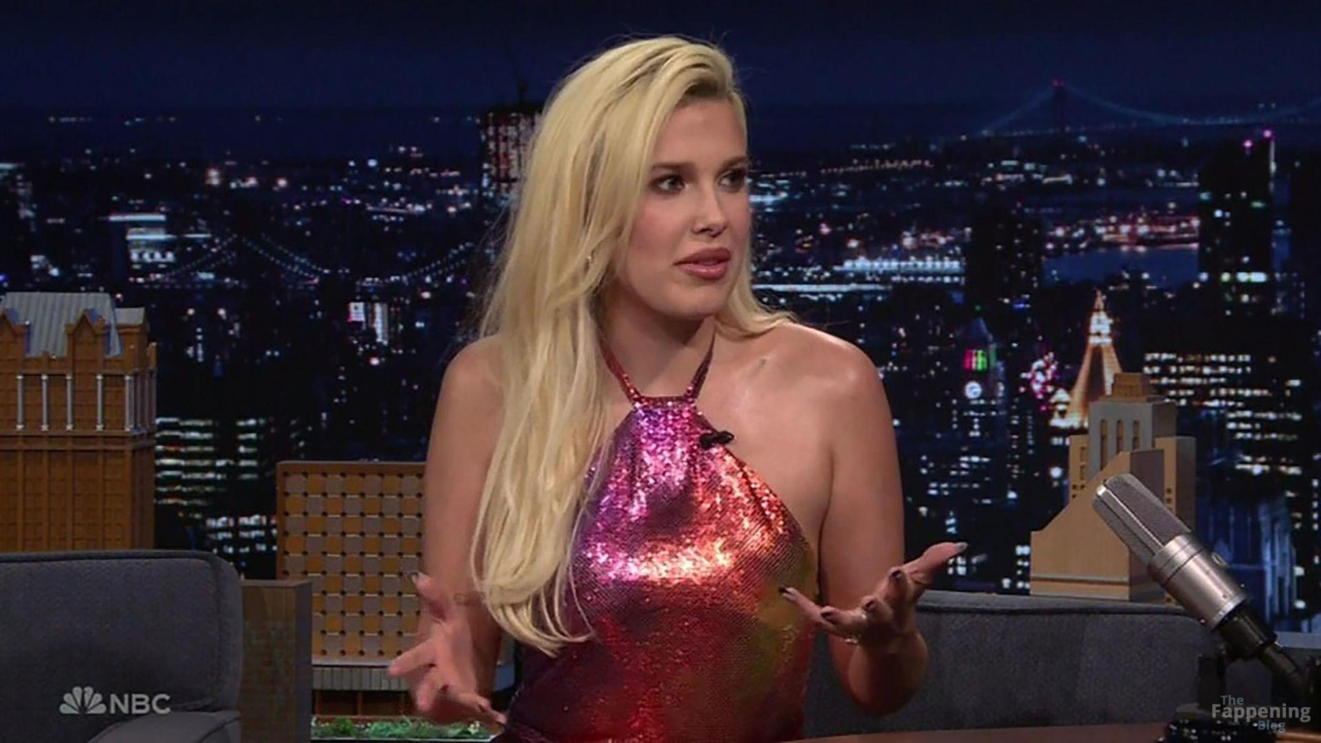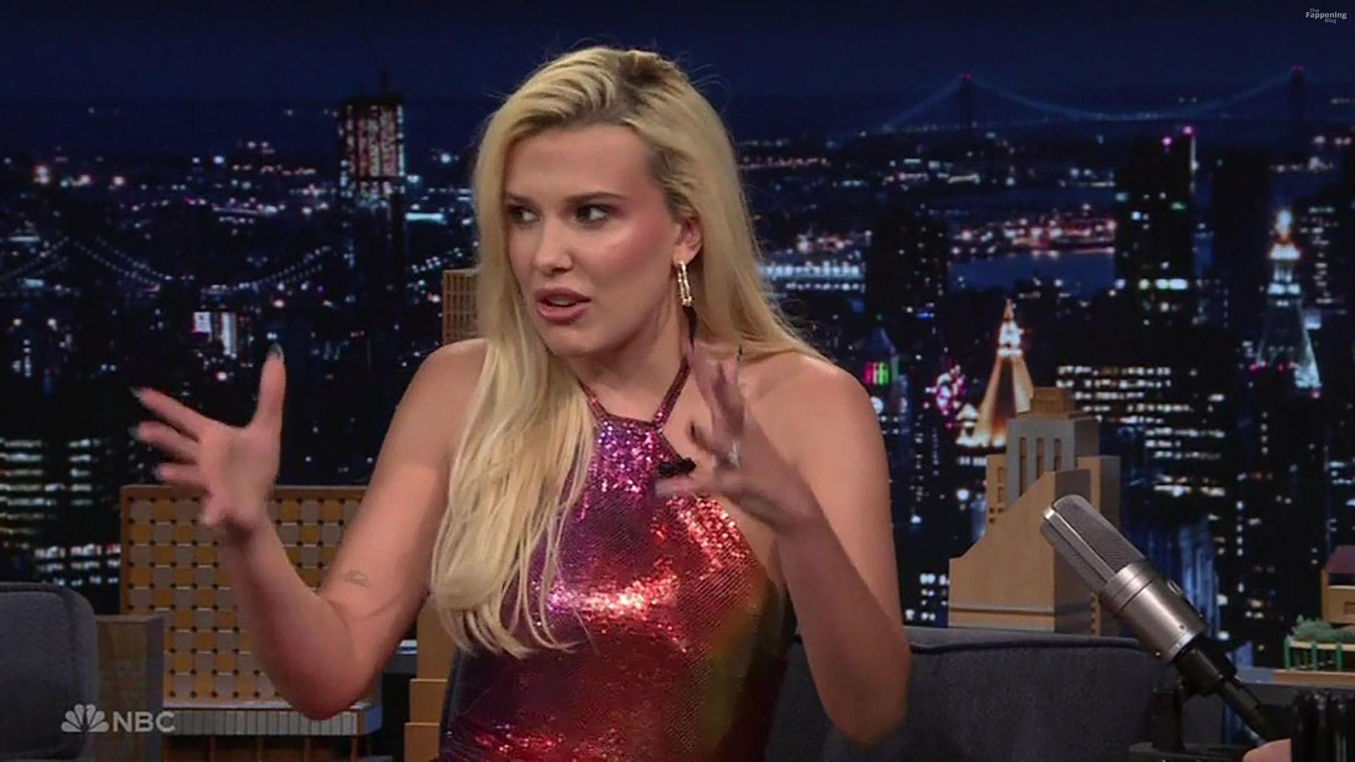 Millie Bobby Brown aparece luciendo sexy y sin sujetador, mostrando sus pezones a través de un vestido metálico en “The Tonight Show Starring Jimmy Fallon”. La actriz estuvo en el programa nocturno estadounidense para promocionar su nueva película “Electric State”, donde compartió recuerdos de su boda con Jake Bongiovi el año pasado.