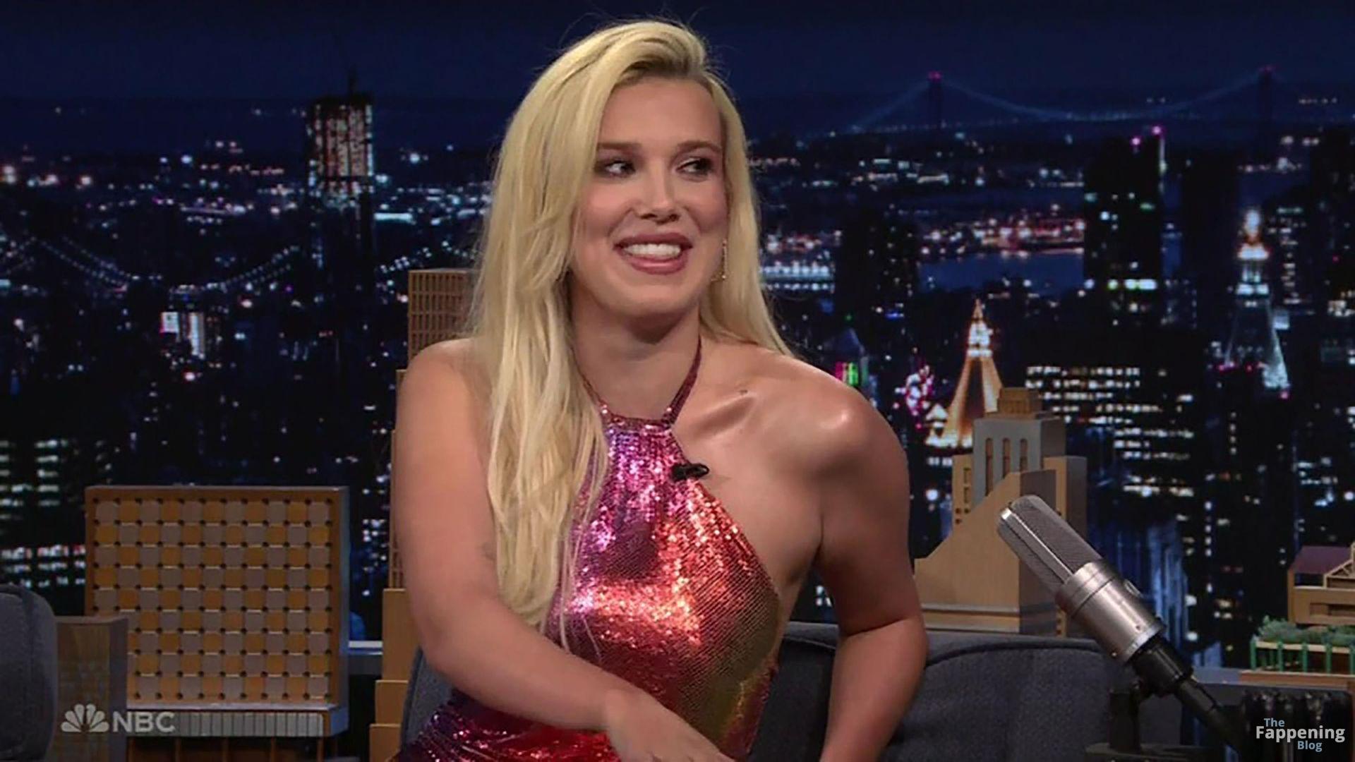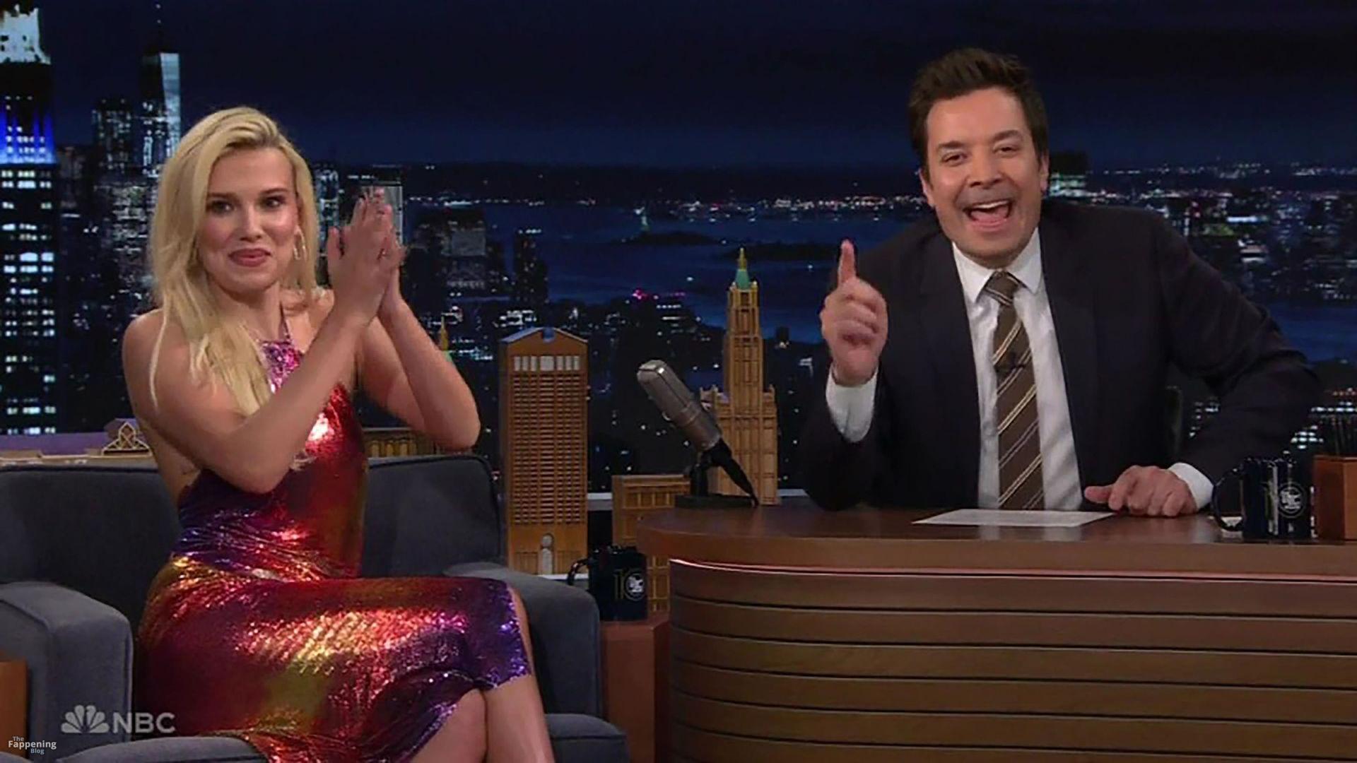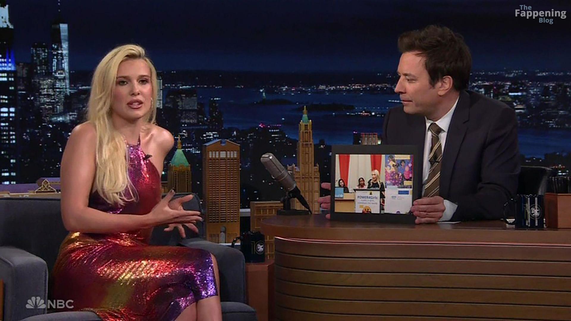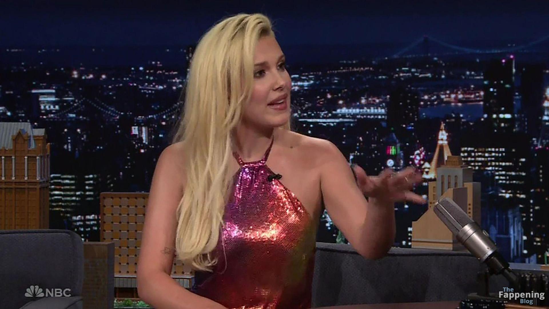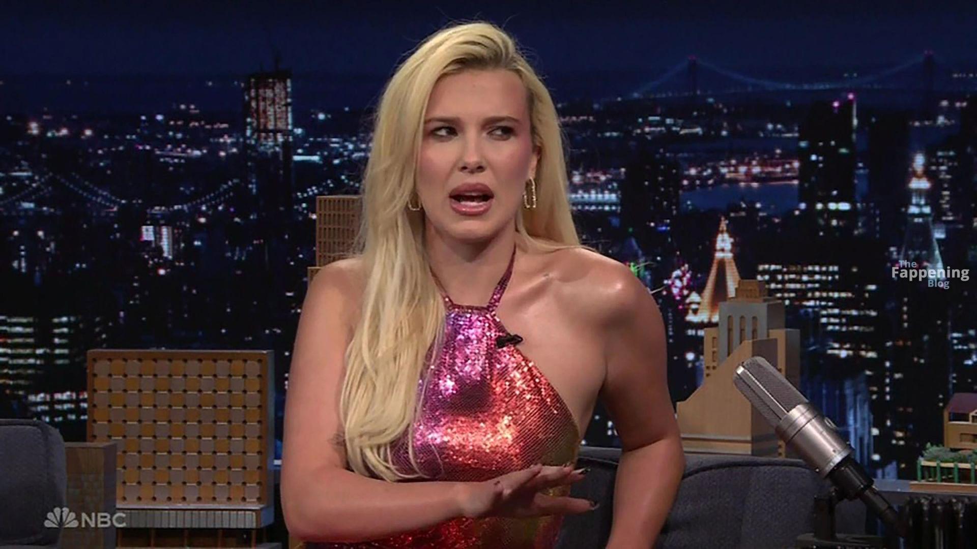 Millie Bobby Brown aparece luciendo sexy y sin sujetador, mostrando sus pezones a través de un vestido metálico en “The Tonight Show Starring Jimmy Fallon”. La actriz estuvo en el programa nocturno estadounidense para promocionar su nueva película “Electric State”, donde compartió recuerdos de su boda con Jake Bongiovi el año pasado.