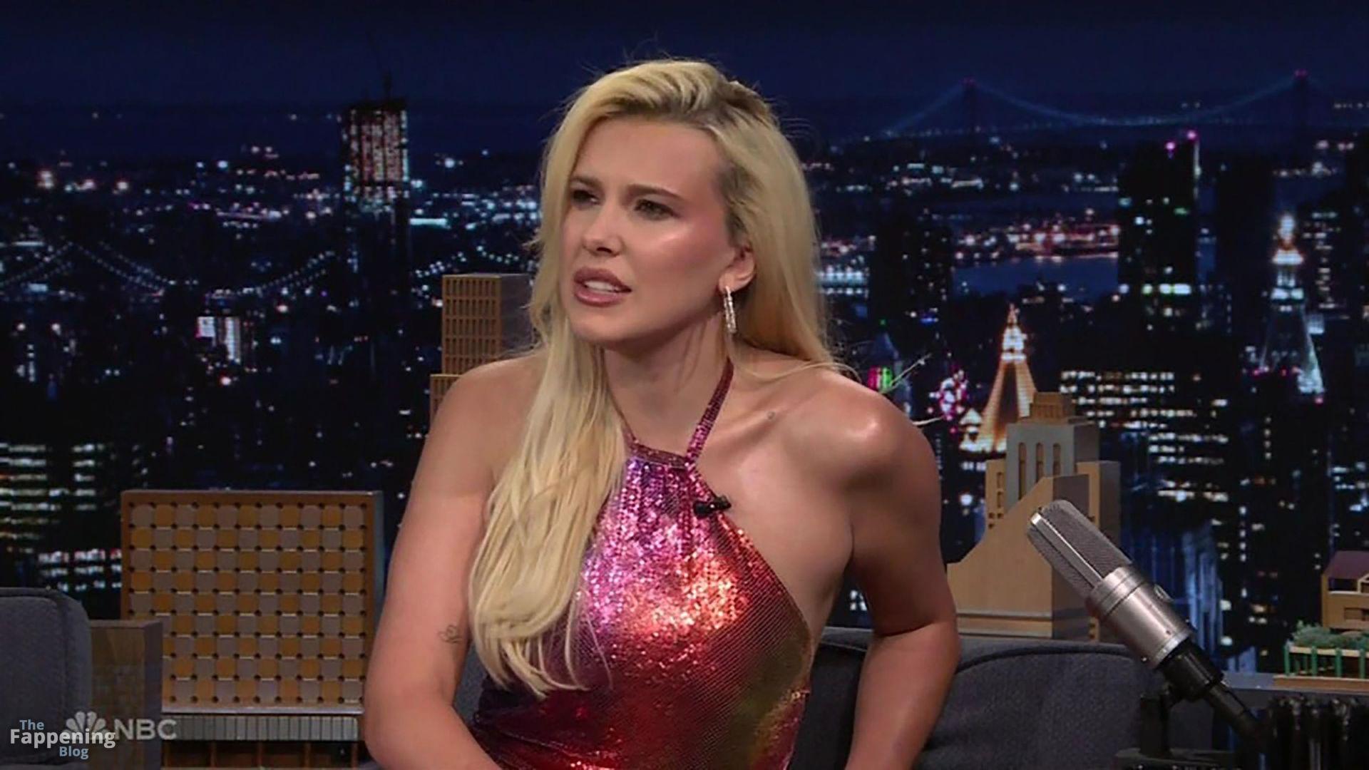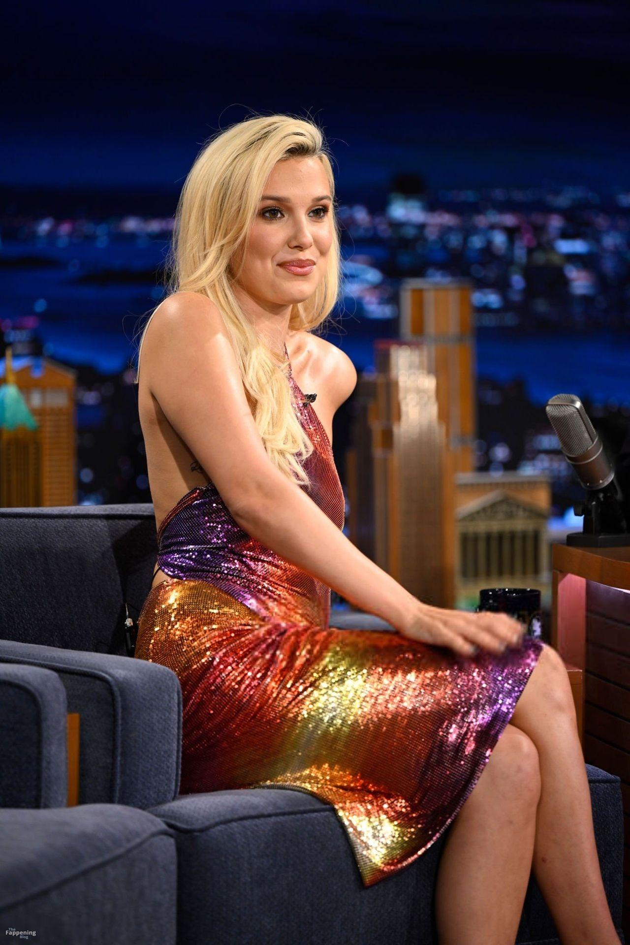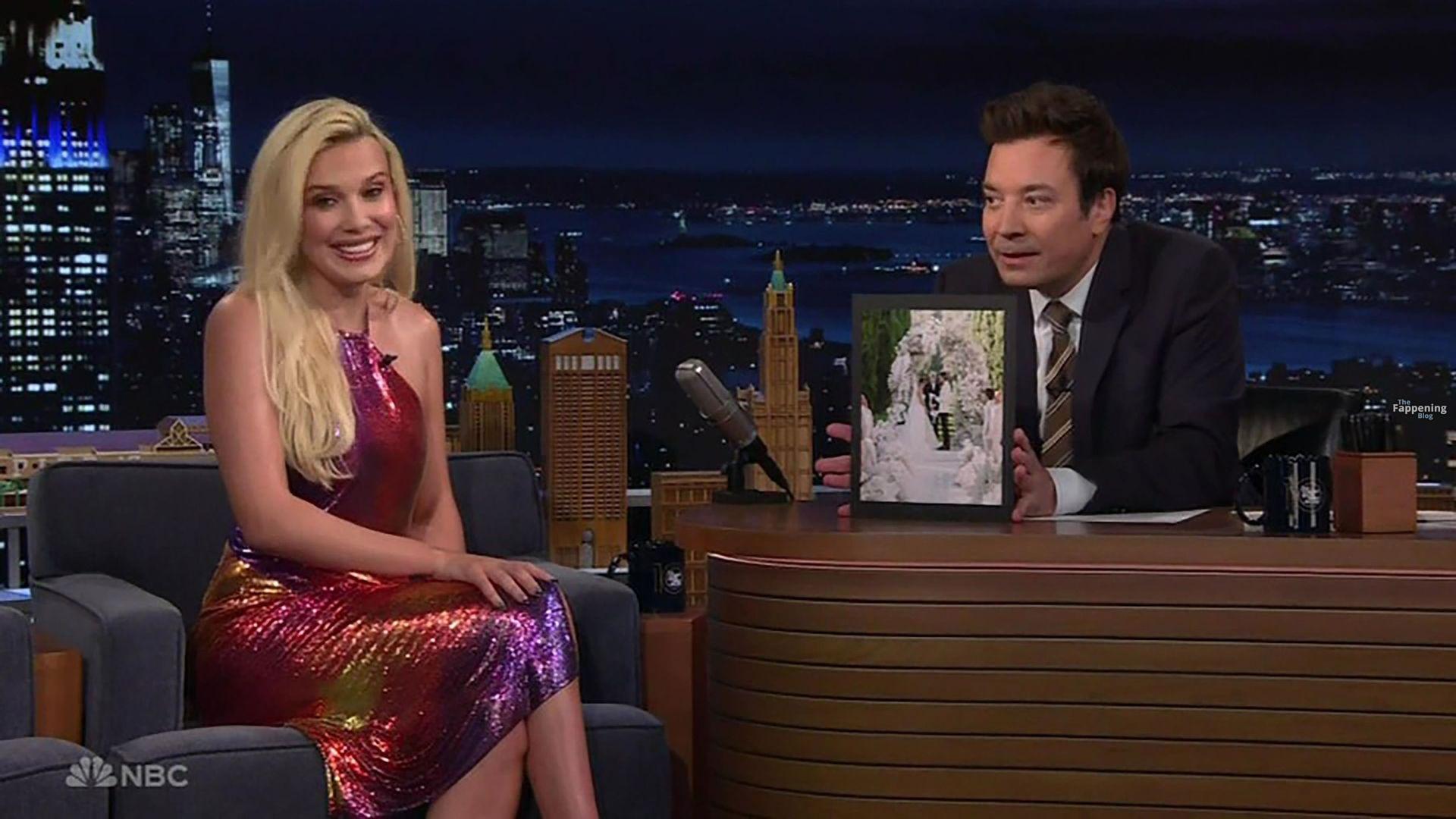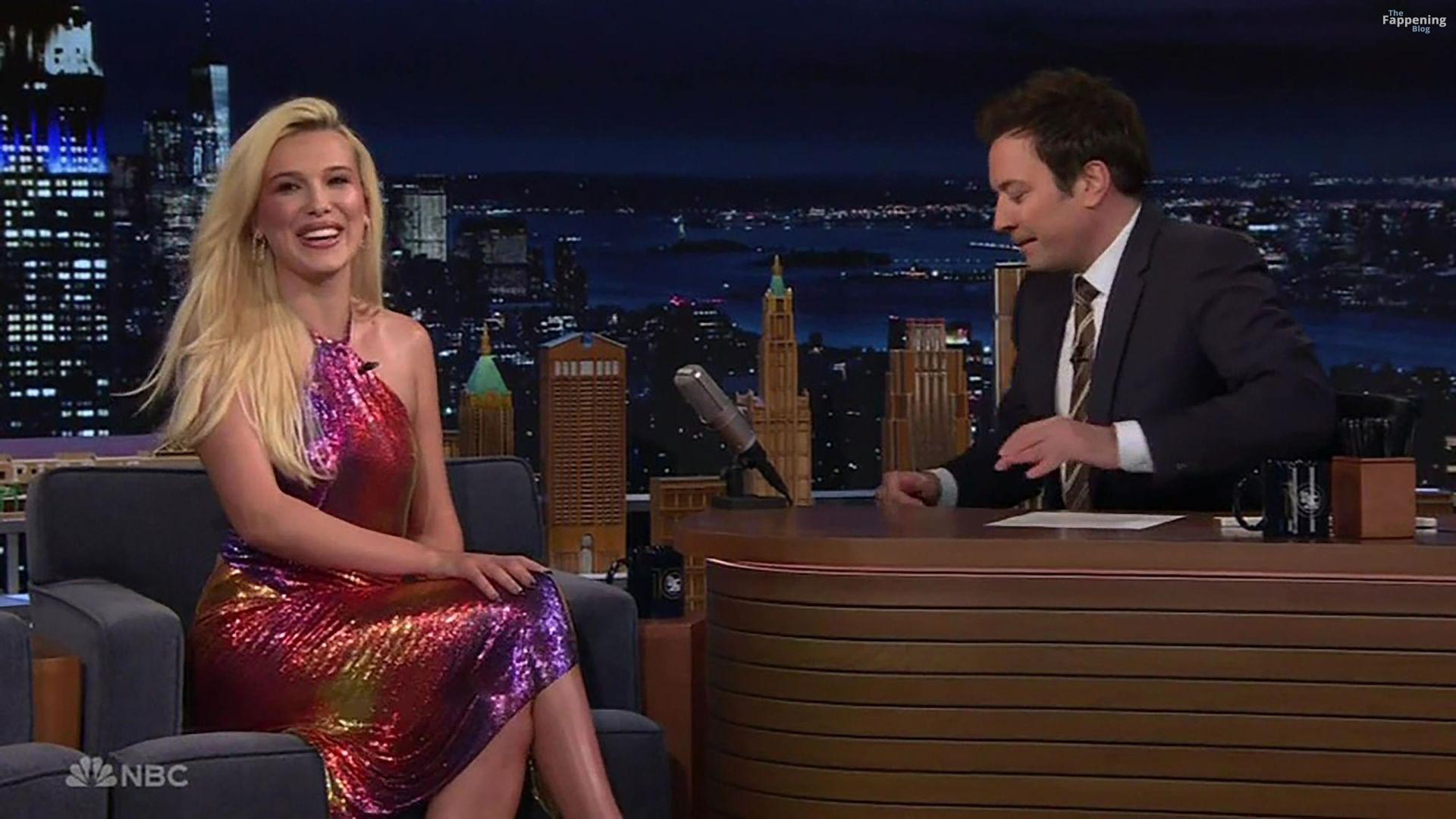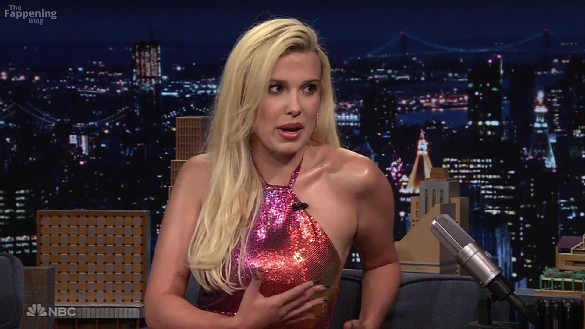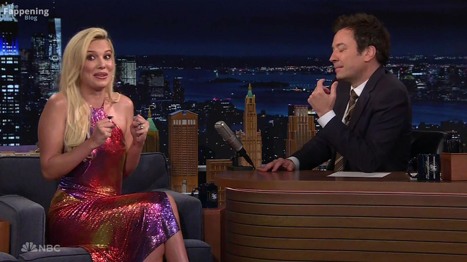 Millie Bobby Brown aparece luciendo sexy y sin sujetador, mostrando sus pezones a través de un vestido metálico en “The Tonight Show Starring Jimmy Fallon”. La actriz estuvo en el programa nocturno estadounidense para promocionar su nueva película “Electric State”, donde compartió recuerdos de su boda con Jake Bongiovi el año pasado.
