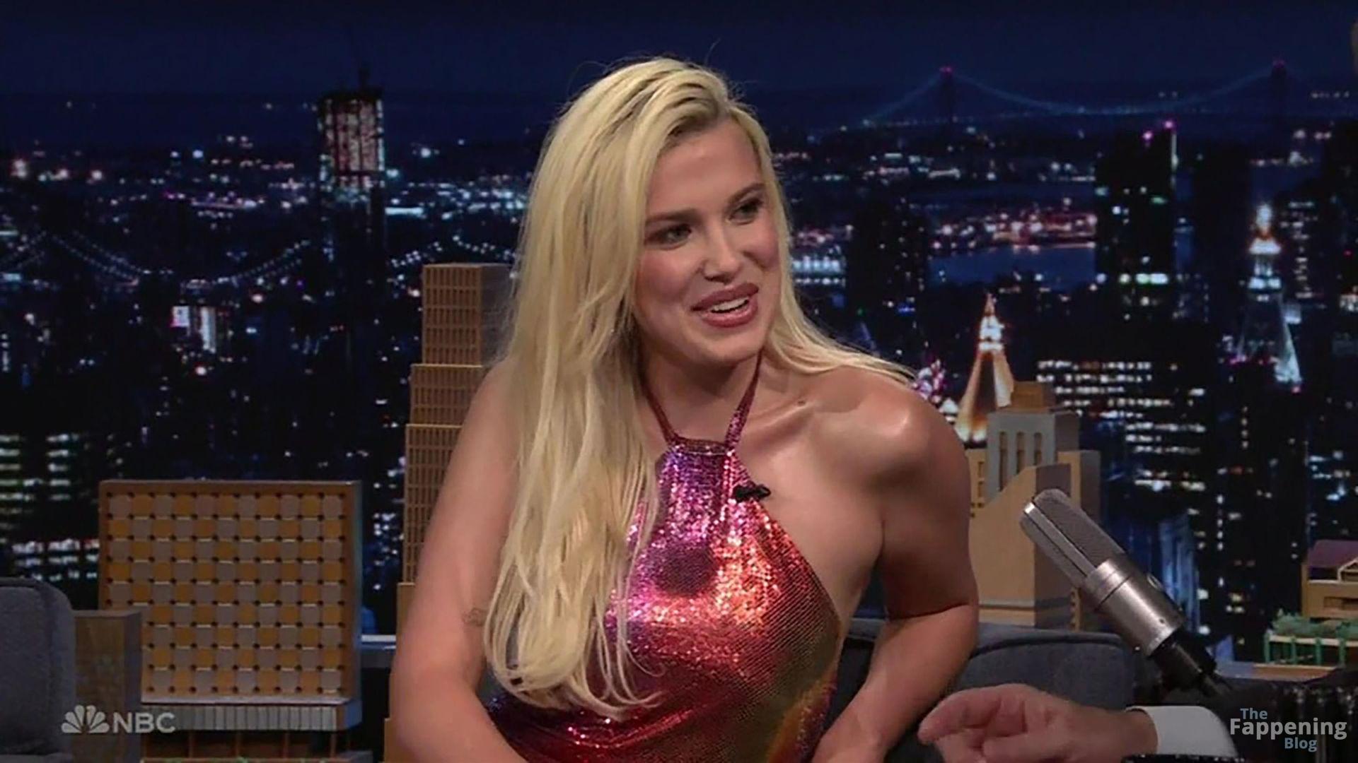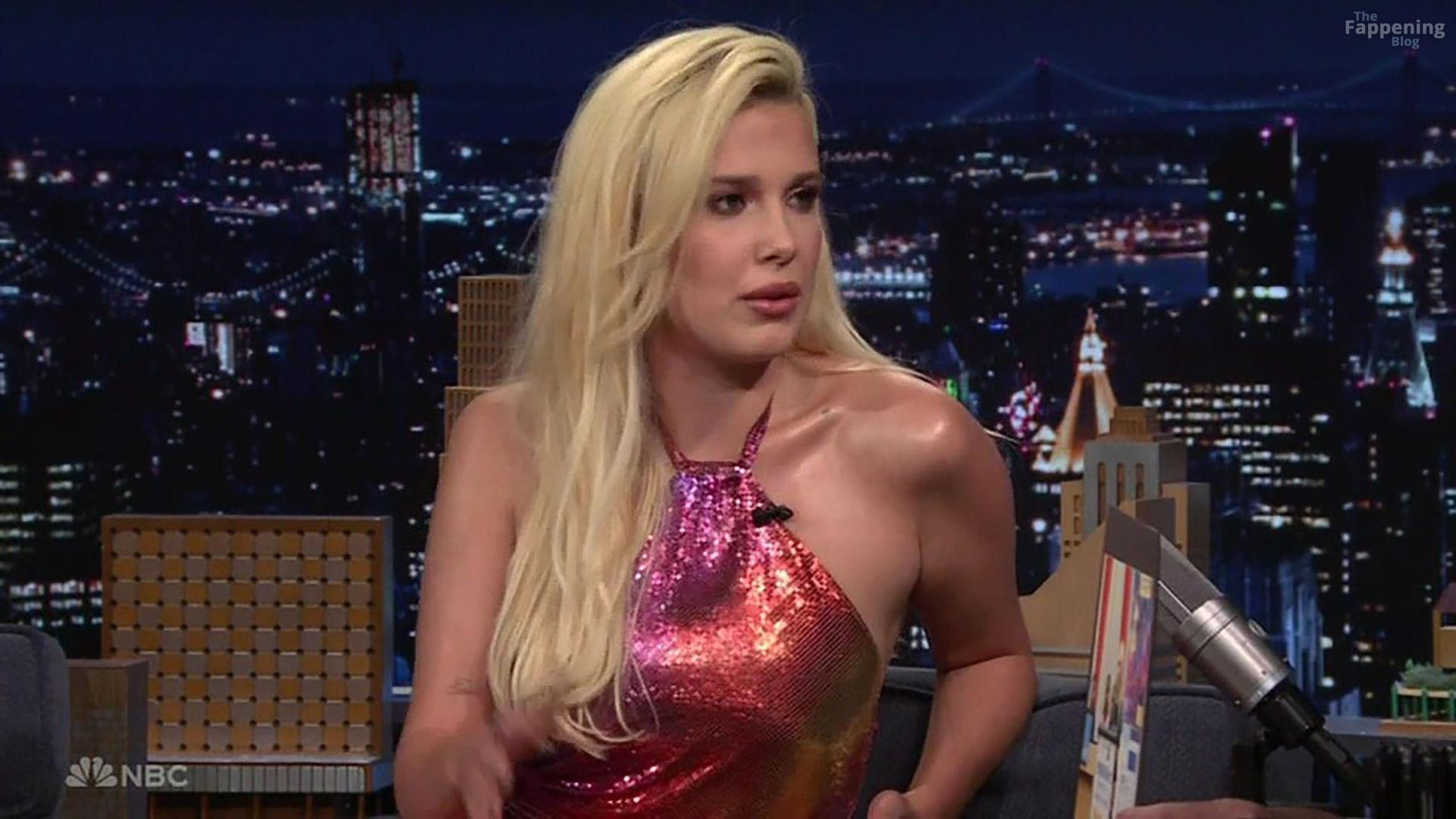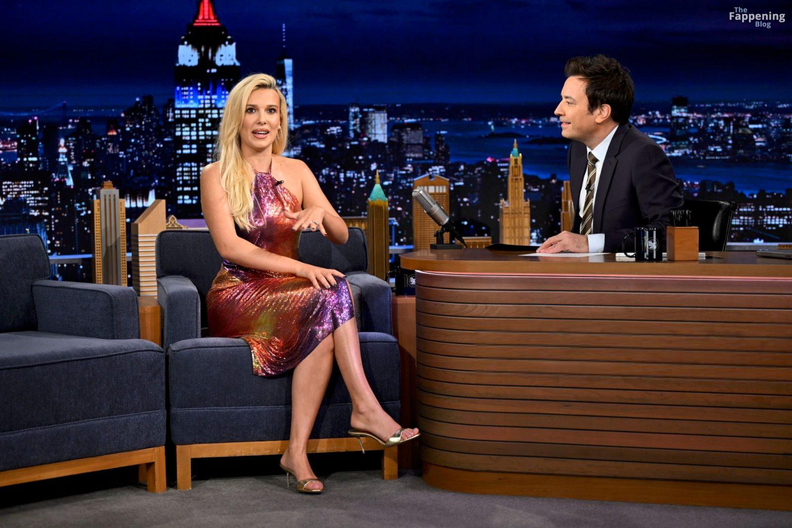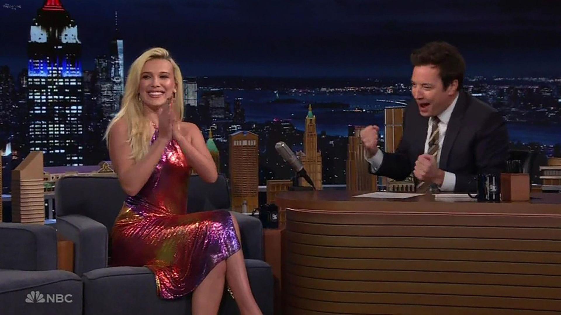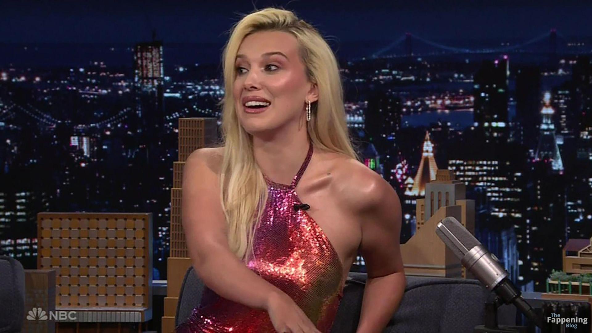 Millie Bobby Brown aparece luciendo sexy y sin sujetador, mostrando sus pezones a través de un vestido metálico en “The Tonight Show Starring Jimmy Fallon”. La actriz estuvo en el programa nocturno estadounidense para promocionar su nueva película “Electric State”, donde compartió recuerdos de su boda con Jake Bongiovi el año pasado.