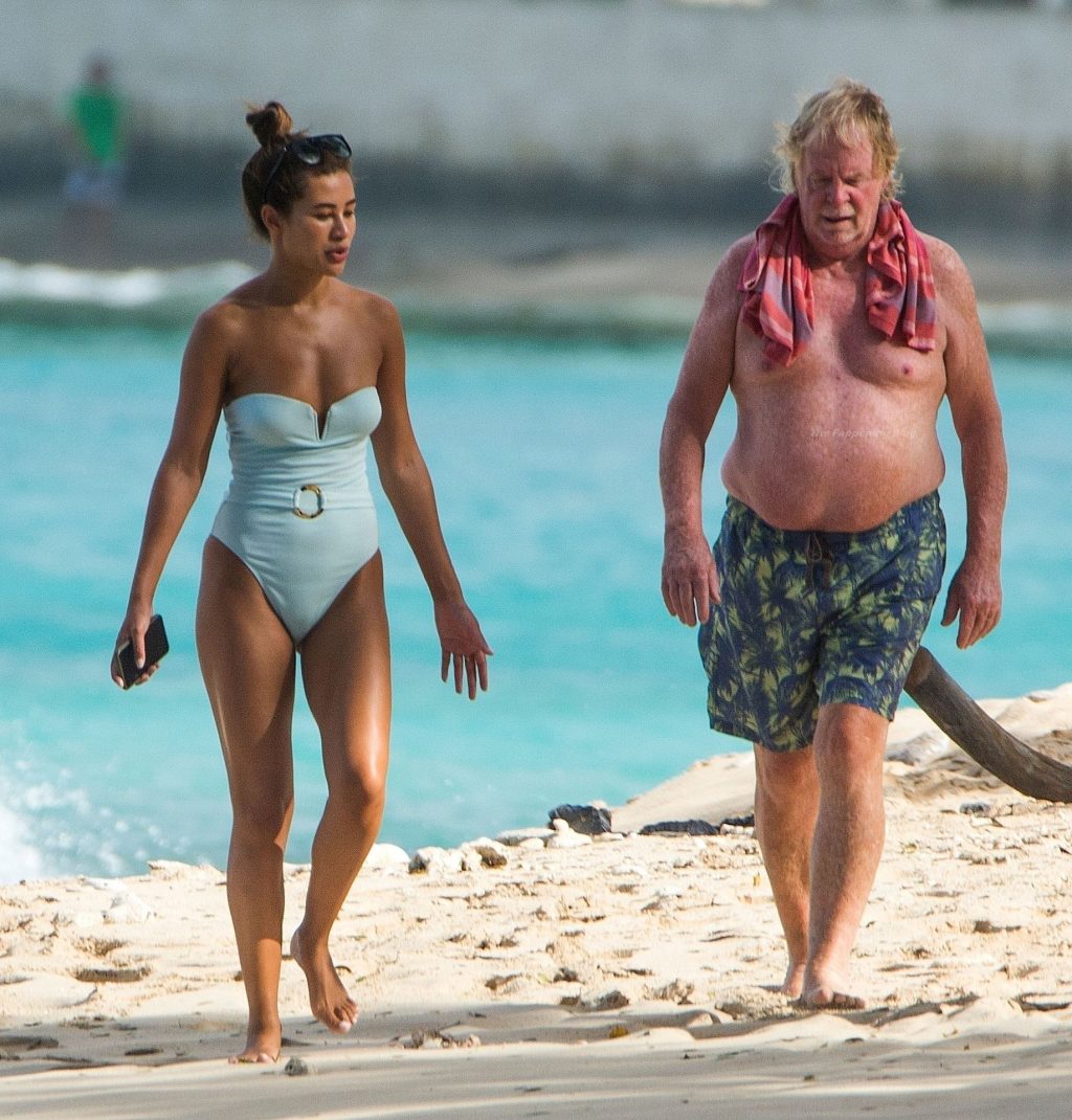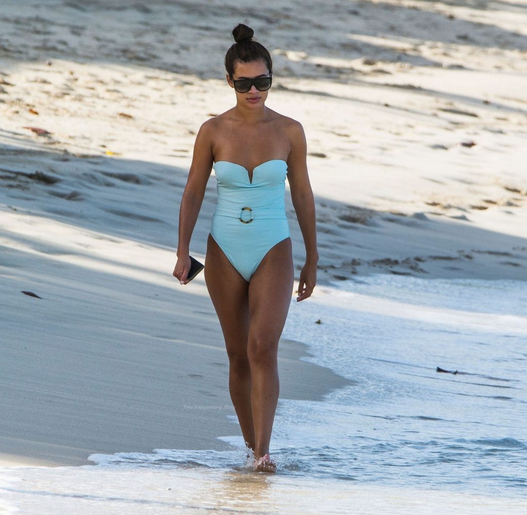 Llevando su pequeño traje de baño azul claro, la sexy estrella caminó dando un paseo por la playa de arena dorada en la parroquia de St. Peter.