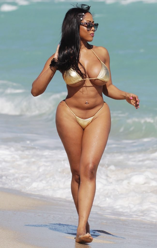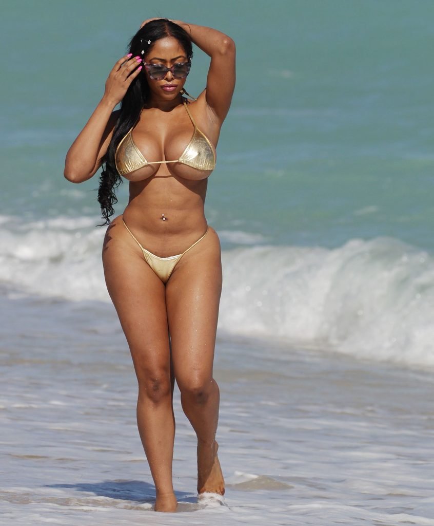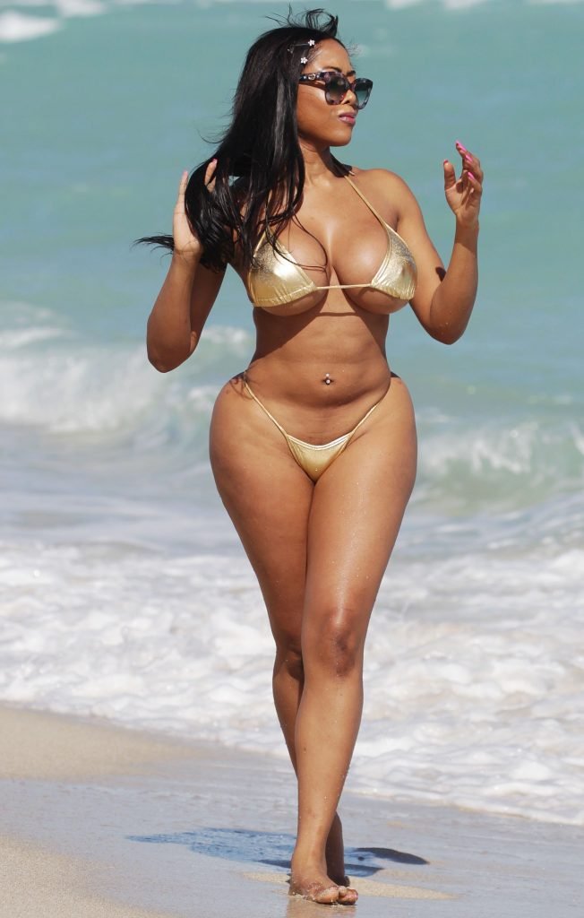 Instagram estrella Moriah Mills lleva un diminuto bikini dorado en la playa de Miami Beach, 17/01/2018.