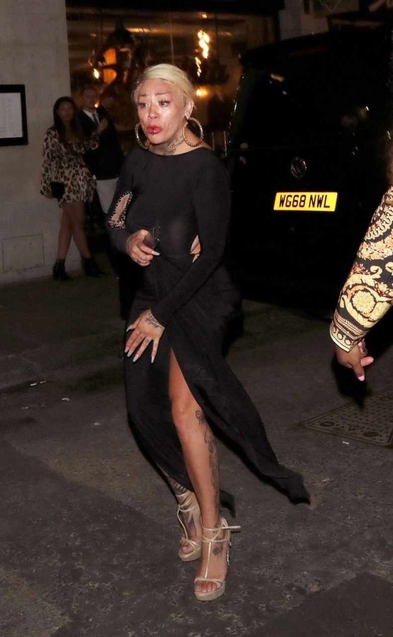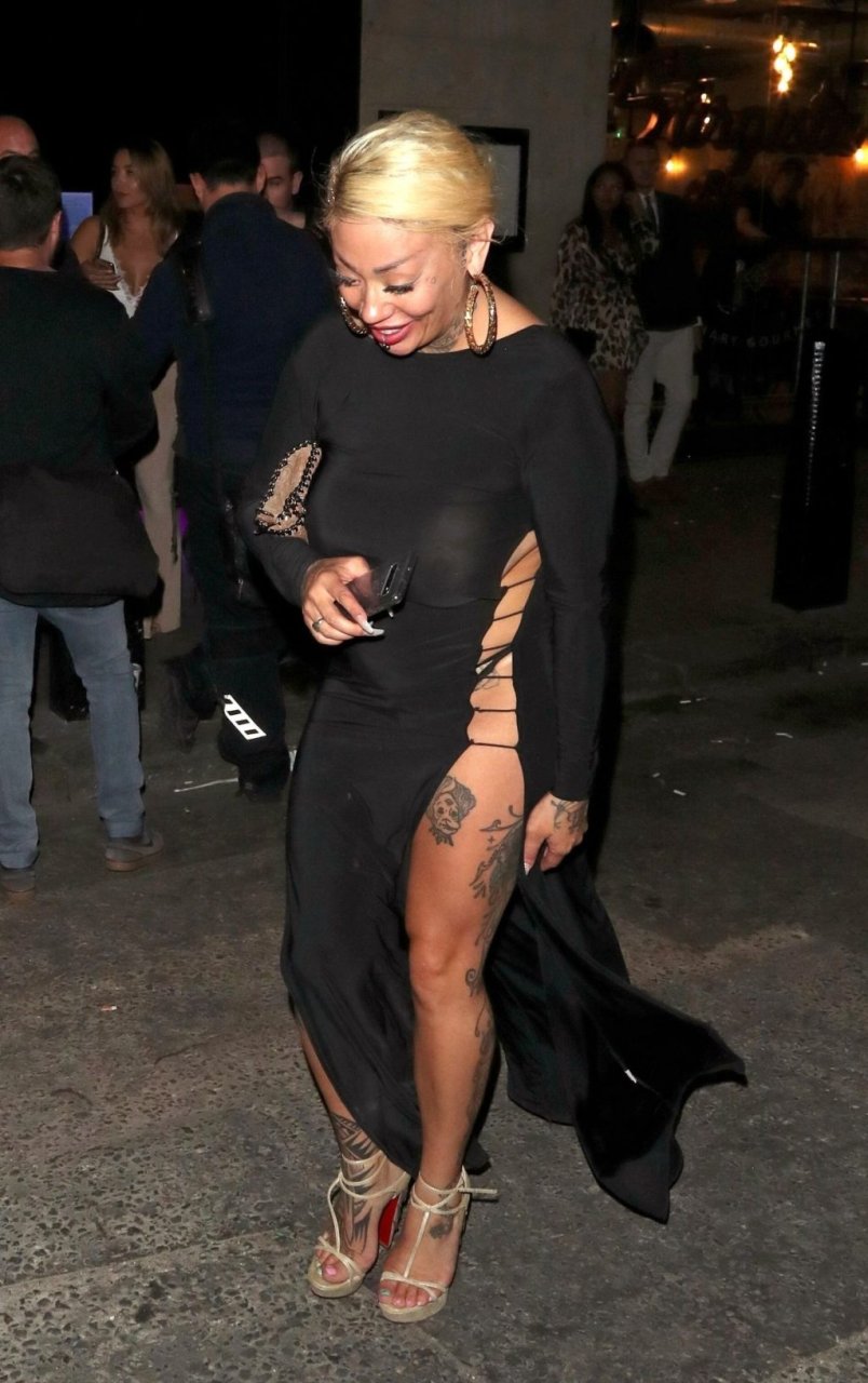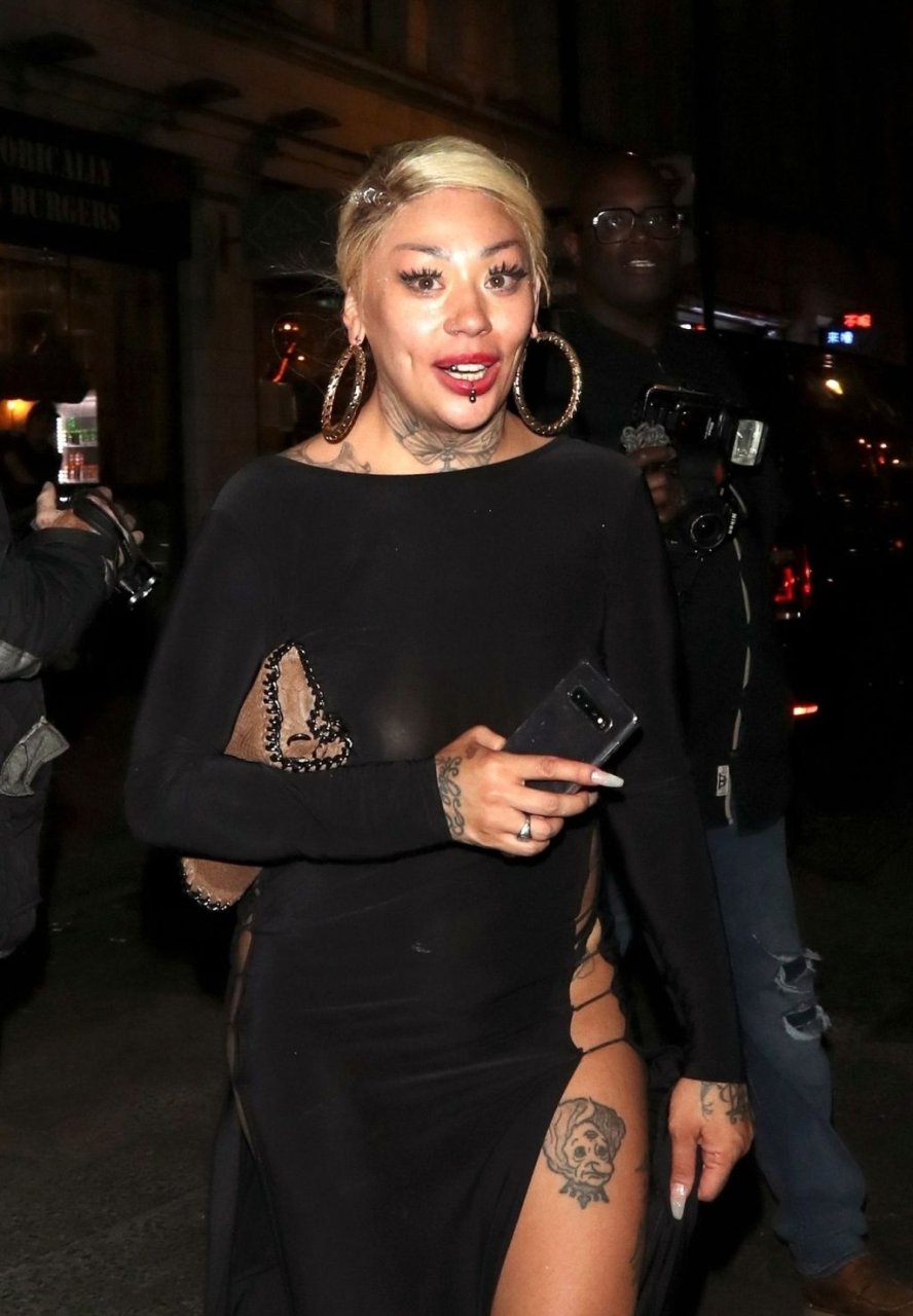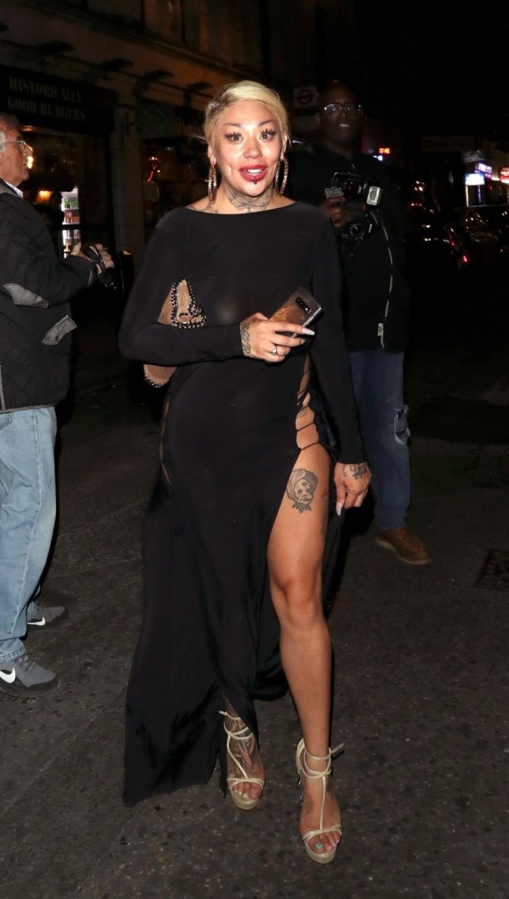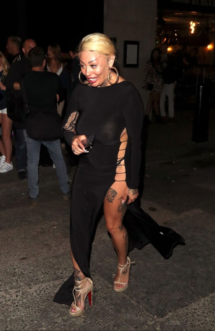 La cantante y compositora Mutya Buena fue vista con un vestido negro transparente sin sujetador al salir de la filmación de Celebs Go Dating en el club Opium de Londres, 08/07/2019.