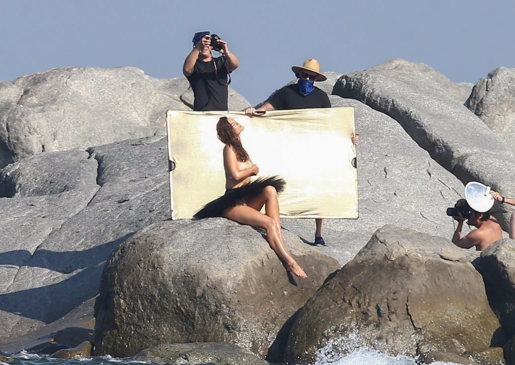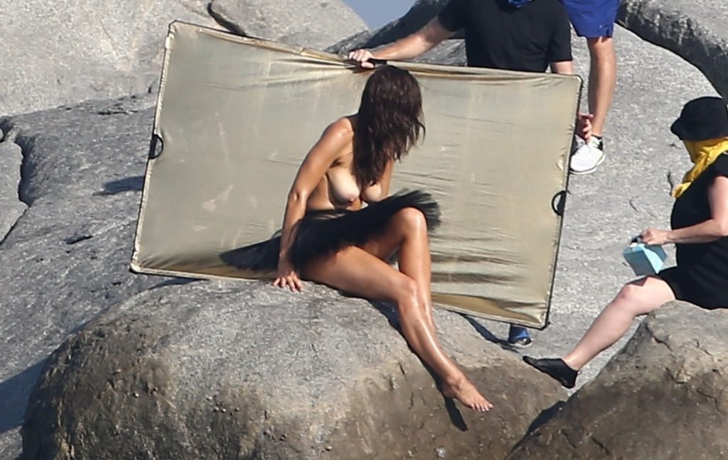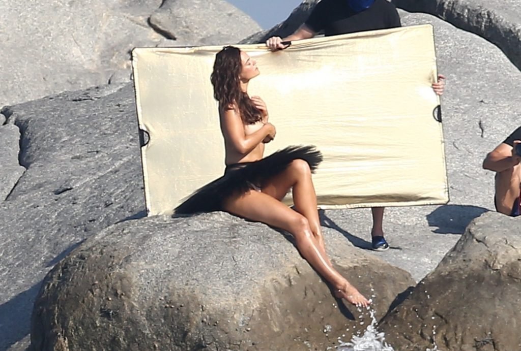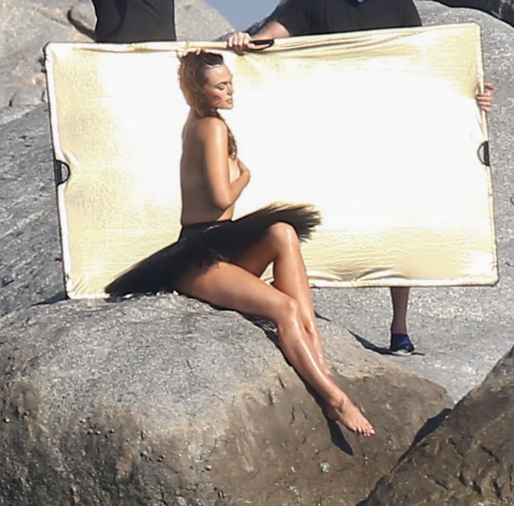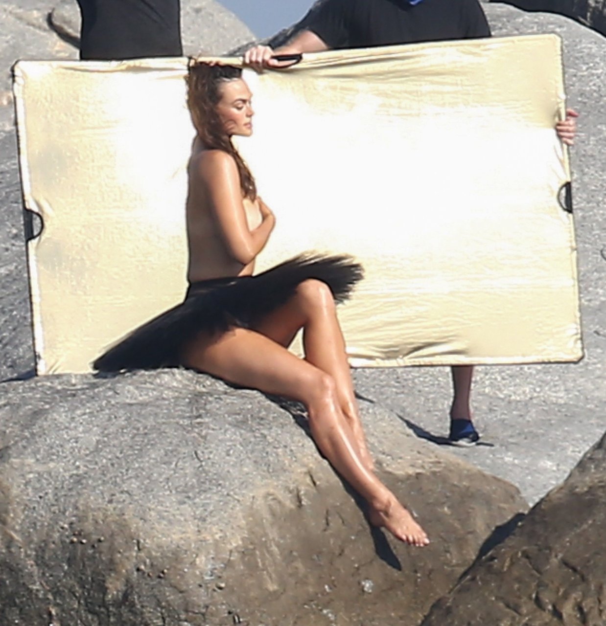 La modelo estadounidense Myla Dalbesio, de 30 años, posa topless con un tutú para una sesión fotográfica de Sports Illustrated en las costas de Aruba, 10/10/2017.