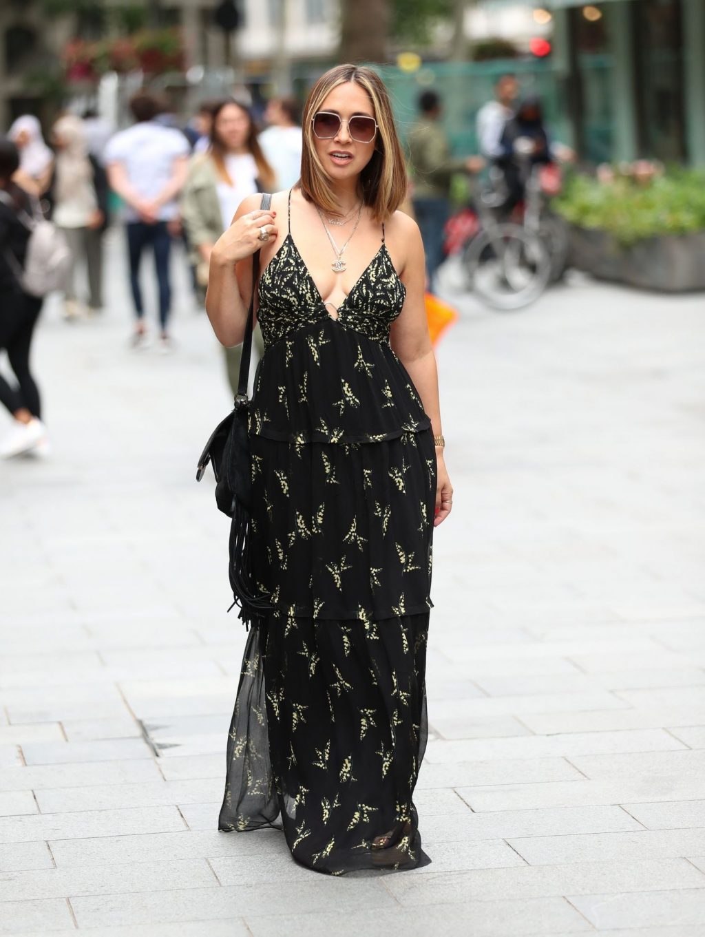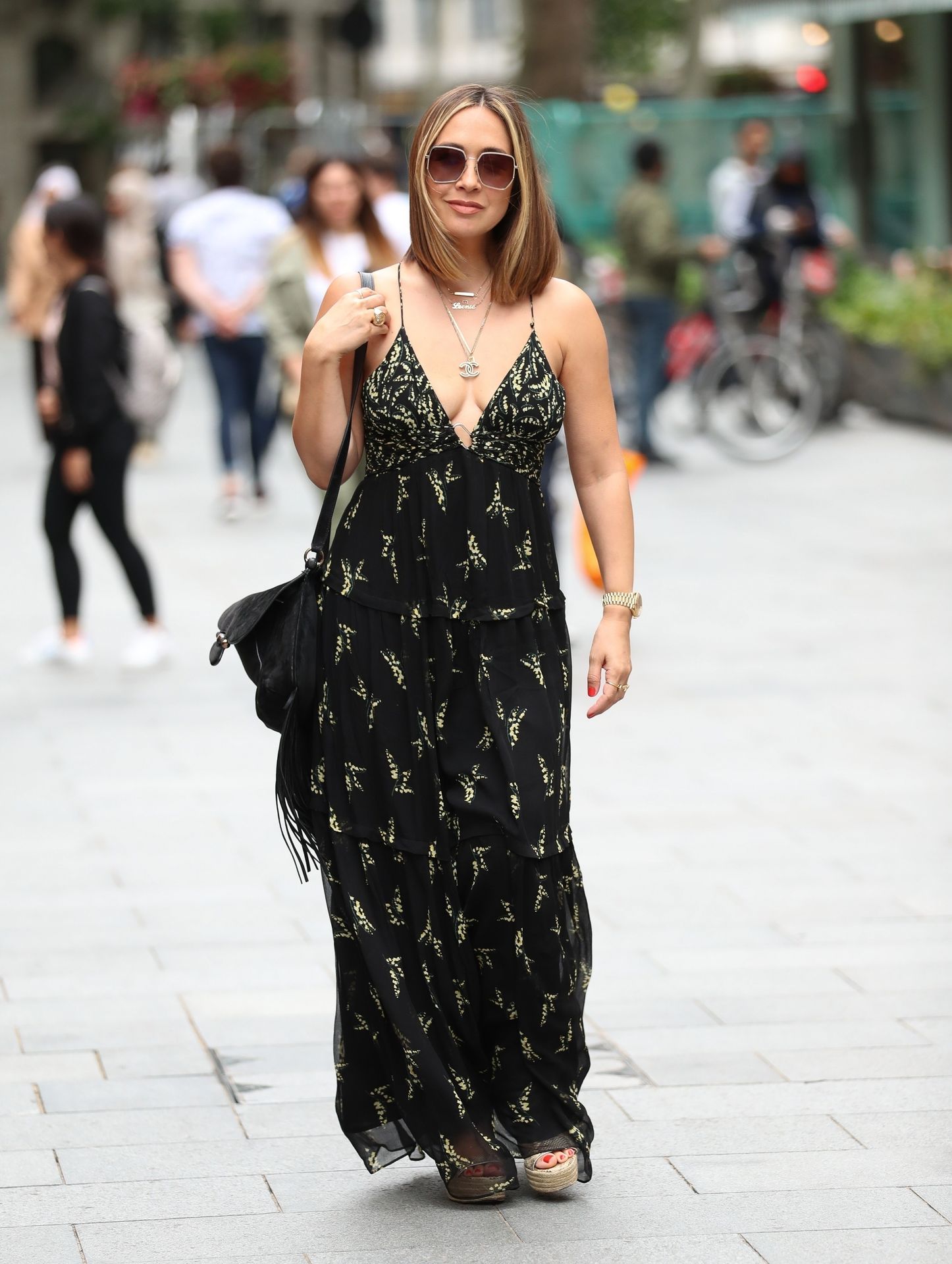 Myleene Klass se ve sensacional mostrando su primer corte de cabello post confinamiento, llega a Global radio con un vestido maxi escotado en Londres, 07/04/2020.