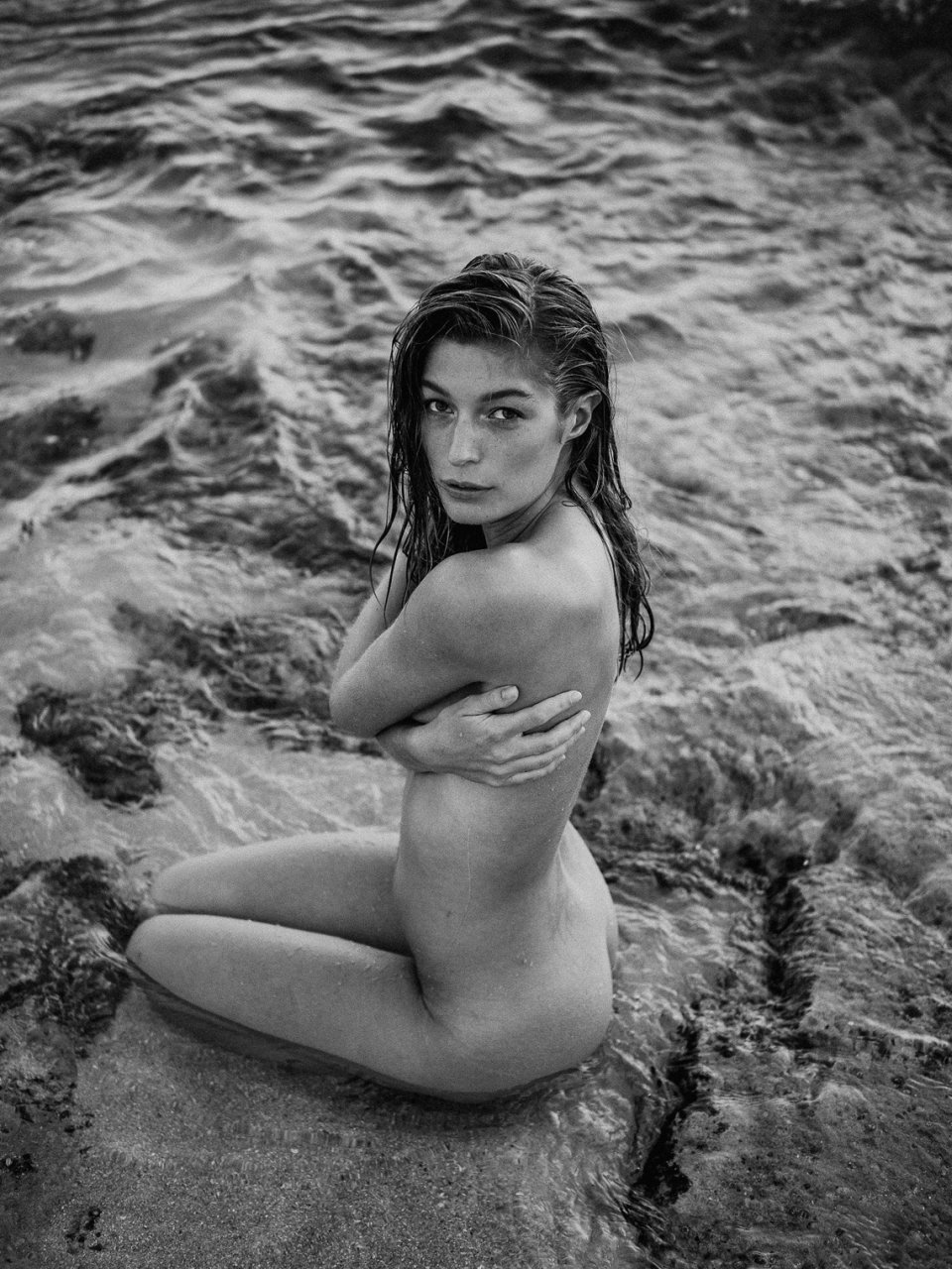 La belleza australiana Naomi Holt muestra su cuerpo desnudo perfecto en la playa de Melbourne en una sesión fotográfica de Chris Smith (2019).
