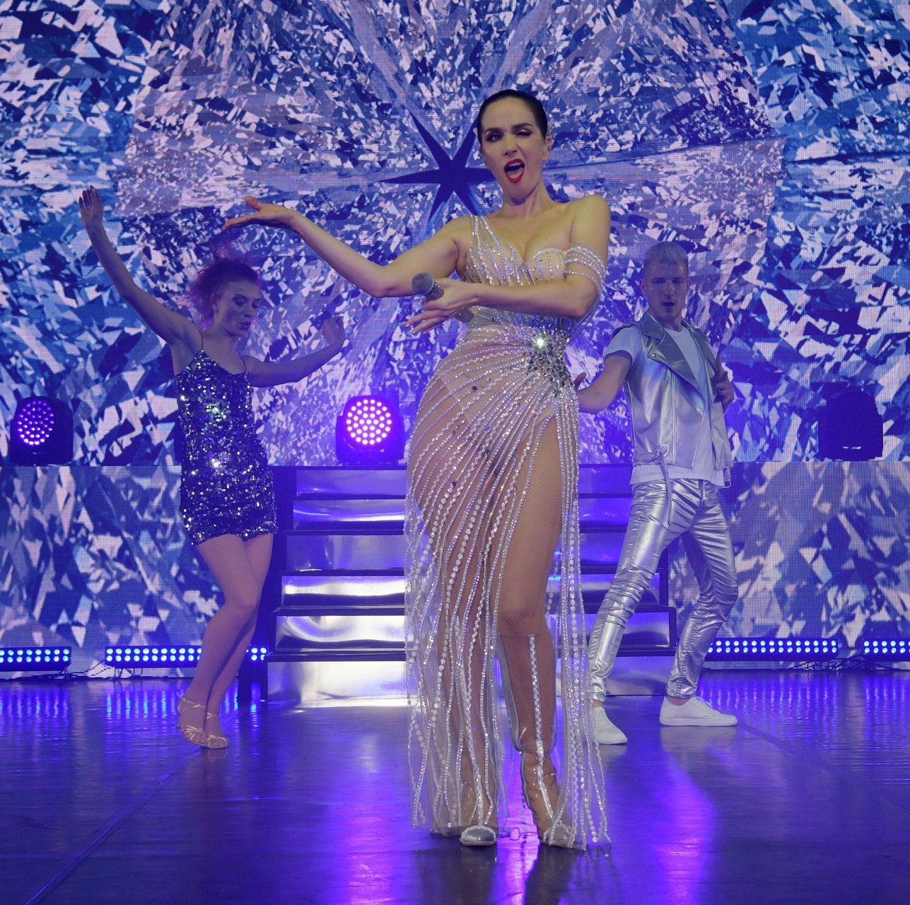 La actriz y cantante uruguaya Natalia Oreiro en el escenario durante un concierto en vivo durante su Gira Inolvidable en el Crocus City Hall de Moscú, 28/03/2019.