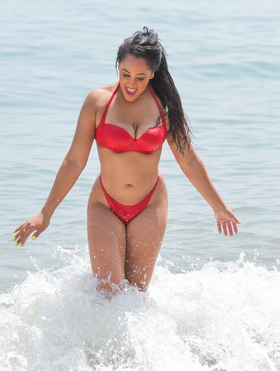 “La estrella de Celebrity Big Brother” Natalie Nunn se ve de vacaciones en España, 09/03/2018. La estrella estadounidense de reality de 33 años se ve en la playa usando un bikini rojo.
